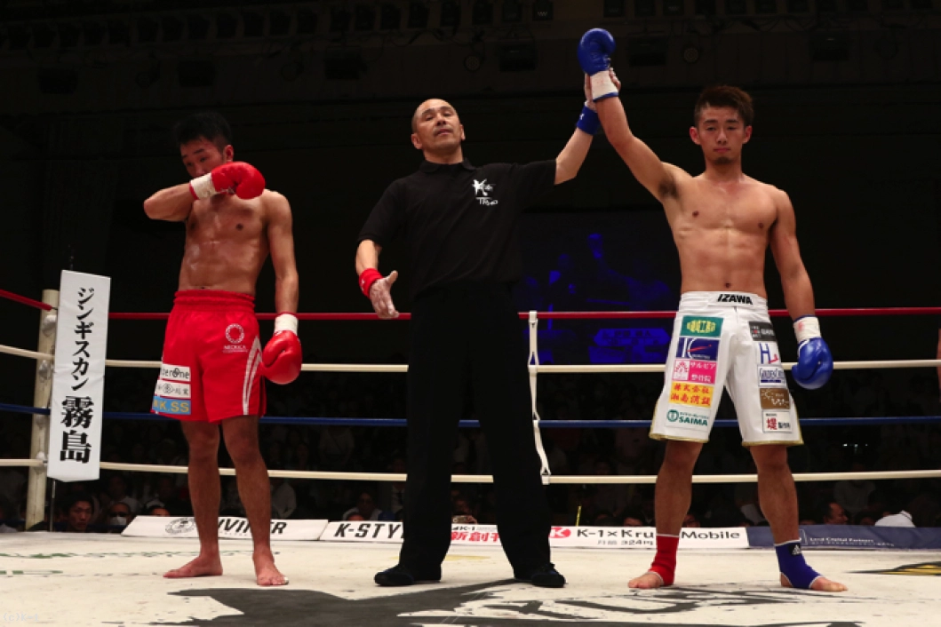 3R、圧力を増したかの伊澤はフックから上段への後ろ回し蹴り、ハイキックと神戸を襲う。神戸も押し返そうとするのだが、伊澤が押し勝つ形で、右ストレート、右ボディフック、左ローと神戸を攻める。コーナー・ロープ際から出んとする神戸だが、伊澤はボディに左右ヒザを集めて押し戻す。神戸が後ろ回し蹴りを決めれば、伊澤もすぐ跳びヒザを返して試合を終える。判定は30-29、30-28、30-27の3-0で伊澤。再起戦で勝利し26勝目を飾った。