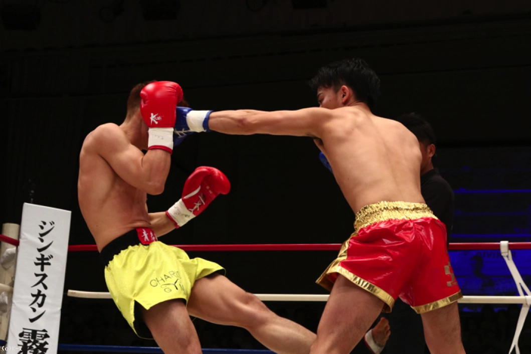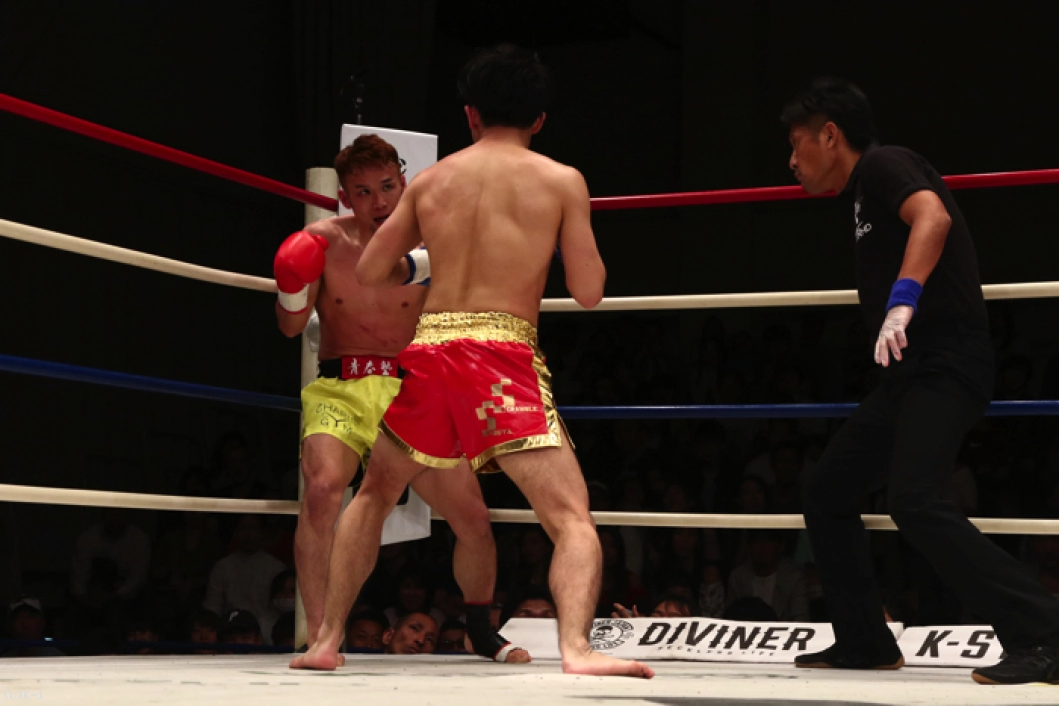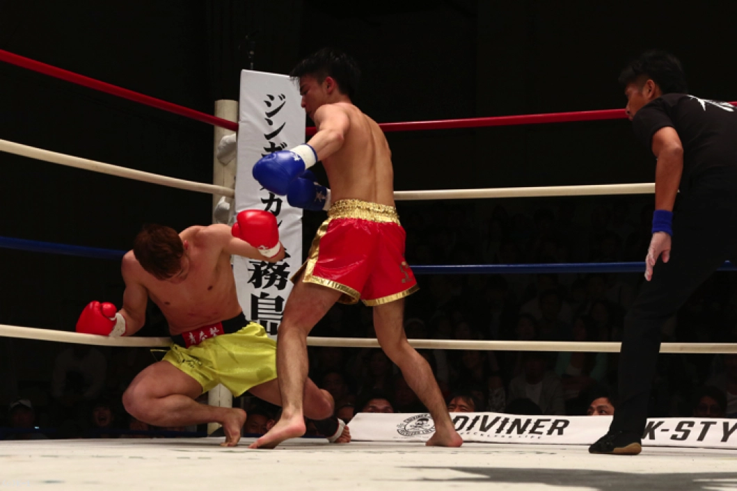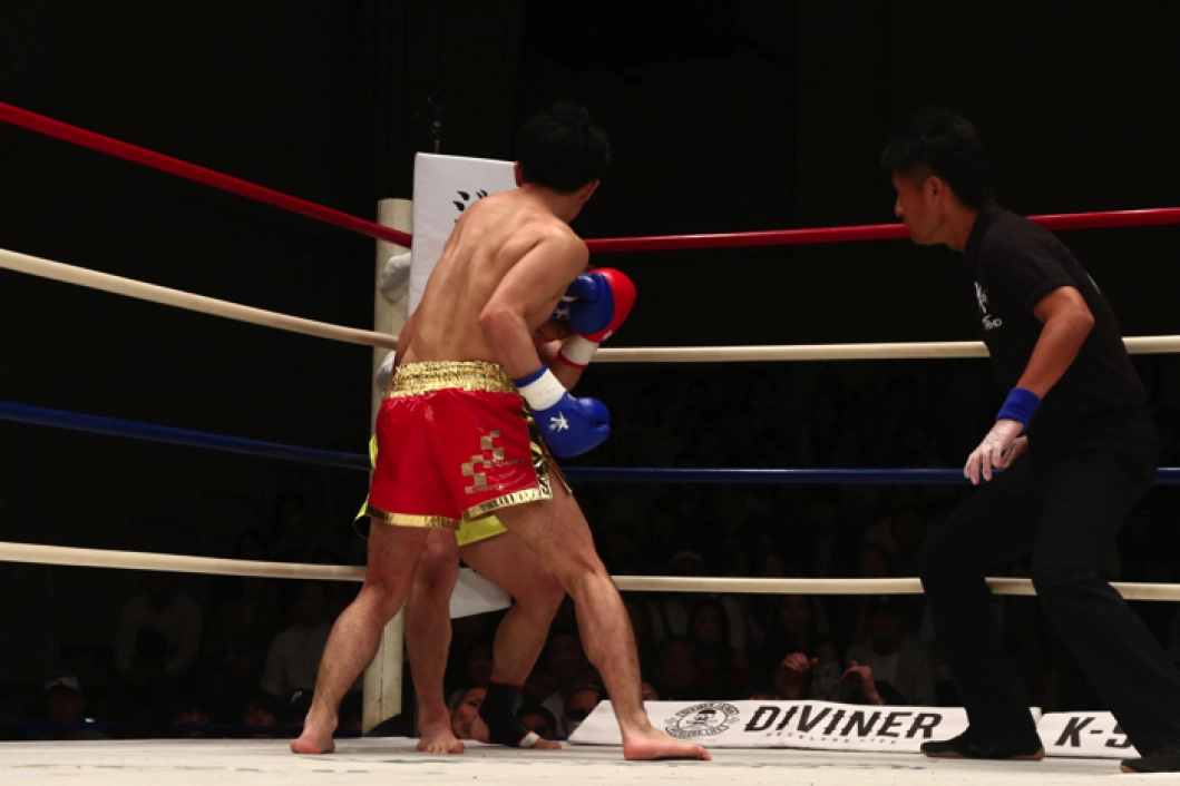 2R、小倉は1Rより圧力を増して前に出て左フックと右ストレートの上下打ち。これで大川をロープに詰め、右フック、右跳びヒザを顔面に決めると大川はダウン。立ち上がるもダメージが大きく、レフェリーはここで試合を止めた。