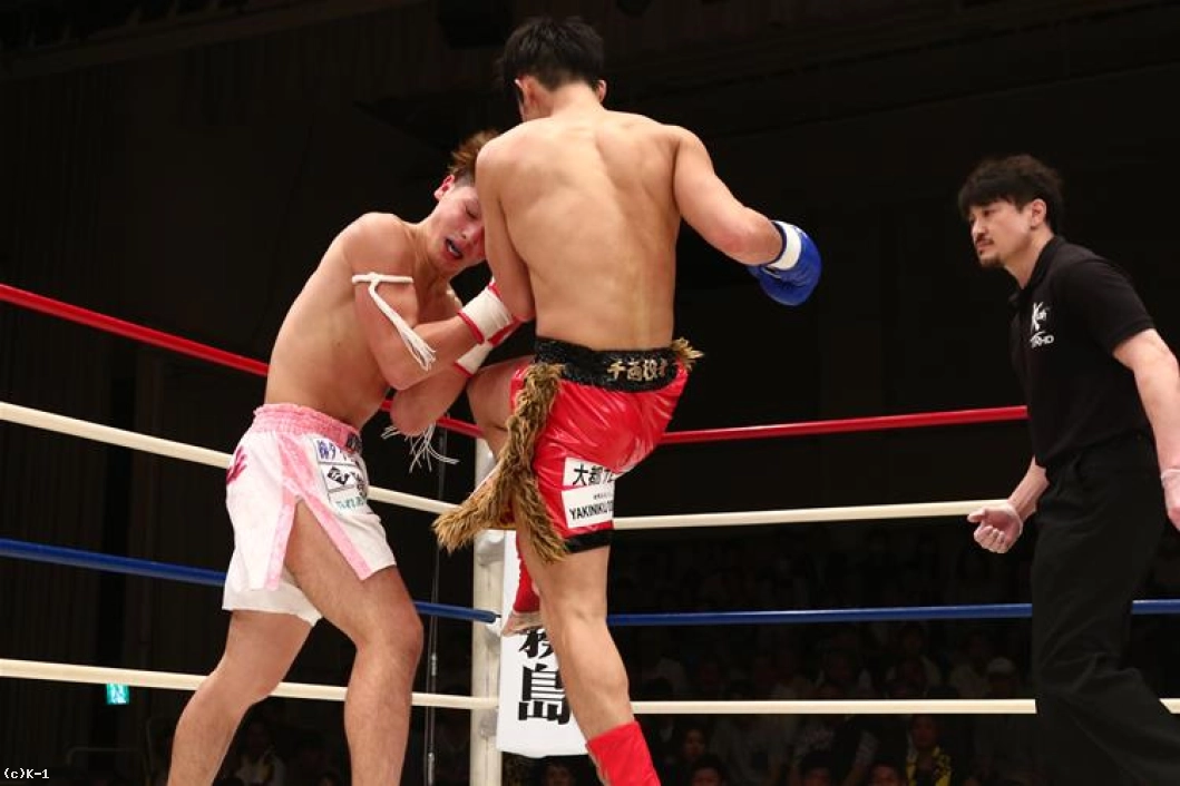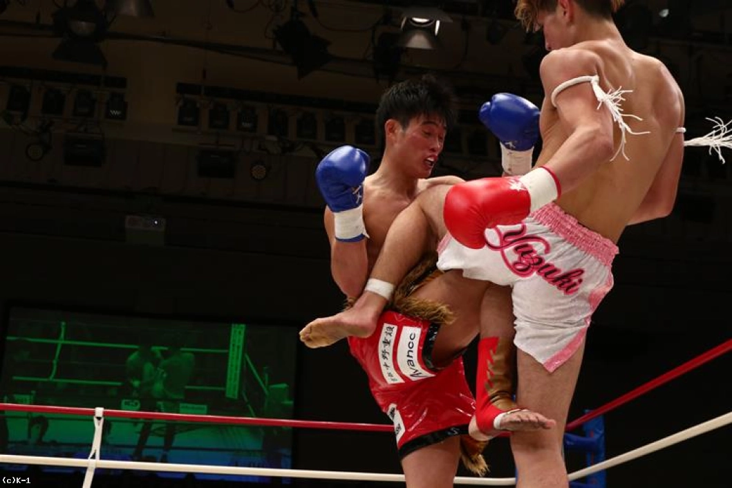 里見は突っ込んでくる川口に左ストレートのカウンターを見舞い、跳びヒザでも仕掛けるも、川口はやはり荒々しく攻めて間合いを詰めてくる。しかしそこでガードがあいた場所を見逃さず、里見は左跳びヒザでアゴを打ち抜きダウンを奪取。川口が立ち上がって終了のゴングとなる。