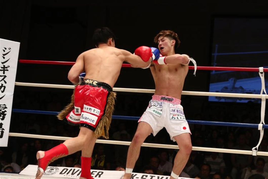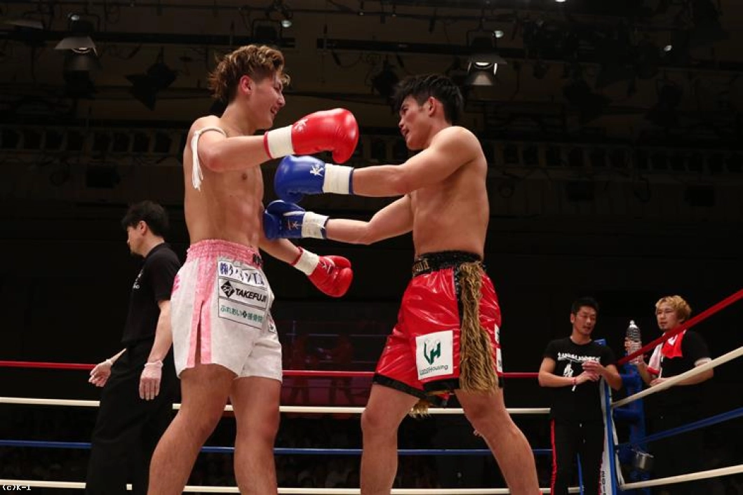 2R、サウスポーから左のカウンターで迎え撃つ里見だが、川口はこれに止められず右ストレートと左フックを強振。距離を取ろうとする里見の狙いを許さない。しかし、ここで里見が放った左インローがローブローとなり誤爆。だが、川口はあまりインターバルを取らず再開に臨む。