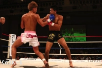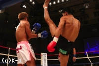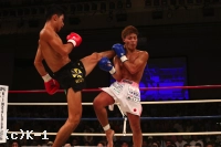 3R、朝久はサウスポーから右フックを当て、左右のローキック。朝久はさらにサウスポーを続けて左ローキック、そして脚へのヒザを里見に追撃する。脚が効いている様子の里見だが、自ら脚を叩き、もっと蹴ってこいと挑発する。朝久は脚を十分効かせた後で前蹴りからボディへの後ろ回し蹴り。