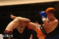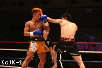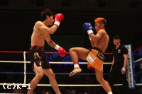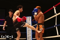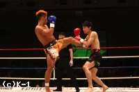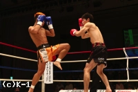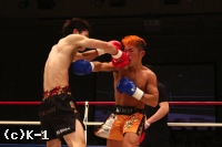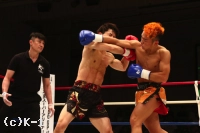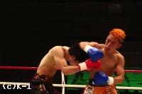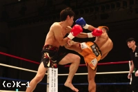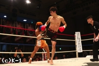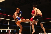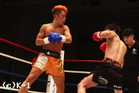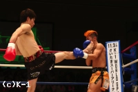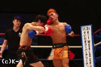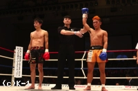 3R、やはり前手で距離を制して前に出る出貝に、晃貴は左右フック、ボディ、ヒザで応戦。1分過ぎには晃貴が左右フックをヒットさせる。出貝はまたもバックキックを繰り出すが、晃貴は大振りのフックを返す。晃貴は右ハイも繰り出す。距離を詰める出貝とパンチを振る晃貴という展開となって試合終了のゴング。パンチで勝った晃貴がジャッジ三者の支持を得て、判定勝ちをもぎ取った。