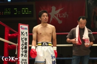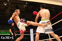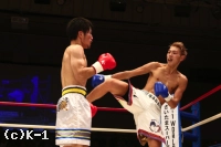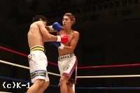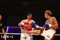 1R、パンチで出る塚本に関川はミドル。塚本もミドルをヒット、前蹴りで関川に尻餅をつかせる。中盤過ぎ、関川はローをヒット、塚本は下がりながらもパンチを返す。終盤にかけてもローを出していく関川に、塚本はジャブ、ハイを見せていく。