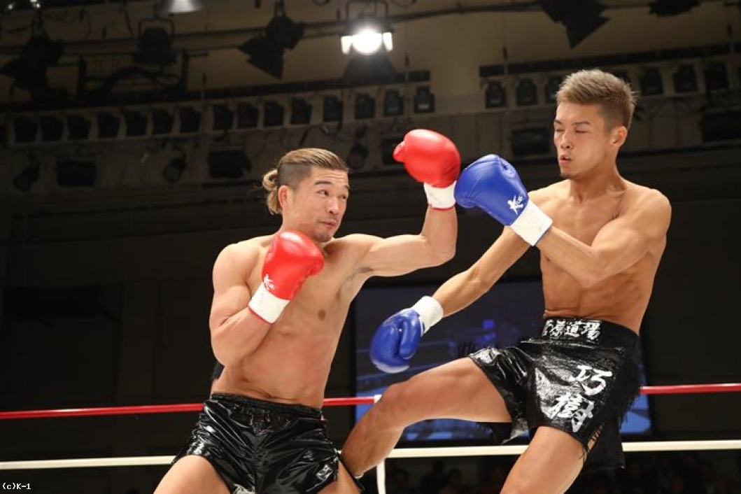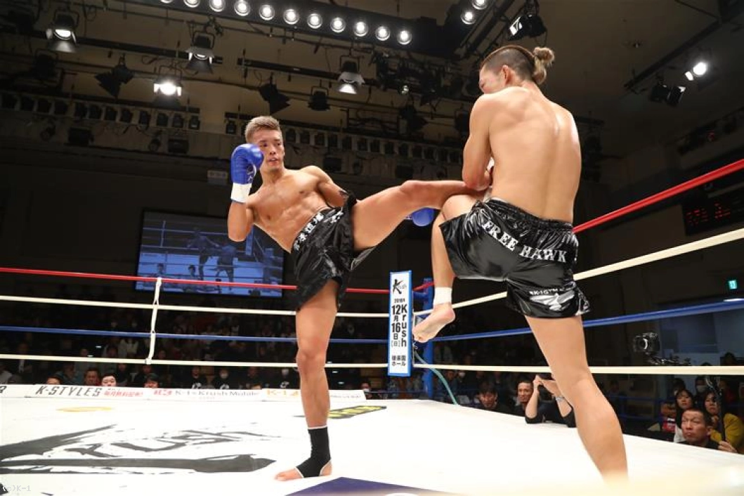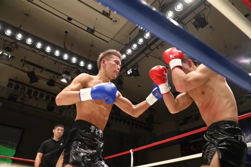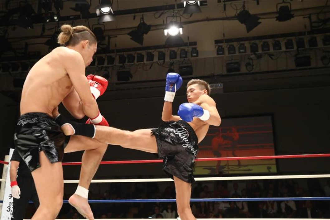 3R、明戸はグッと間合いを詰めてボディから顔面へと左右フックを走らせる。バズーカは変わらず前蹴り・左ミドルで距離を取るが、明戸はそれに止められず左フックをヒット。バズーカは熱くならずボディへのヒザ、左ハイキックと蹴り主体の攻めを変えない。明戸の振るうパンチに合わせ、ヒザ・左ミドルと打ち込むバズーカ。明戸をじわりじわりと下がらせ、ロープを背にしたところで左フック・右フックと振るう。判定は30-29、29-29、30-28の2-0でバズーカ。蹴りを主体にした戦いで勝利した。
