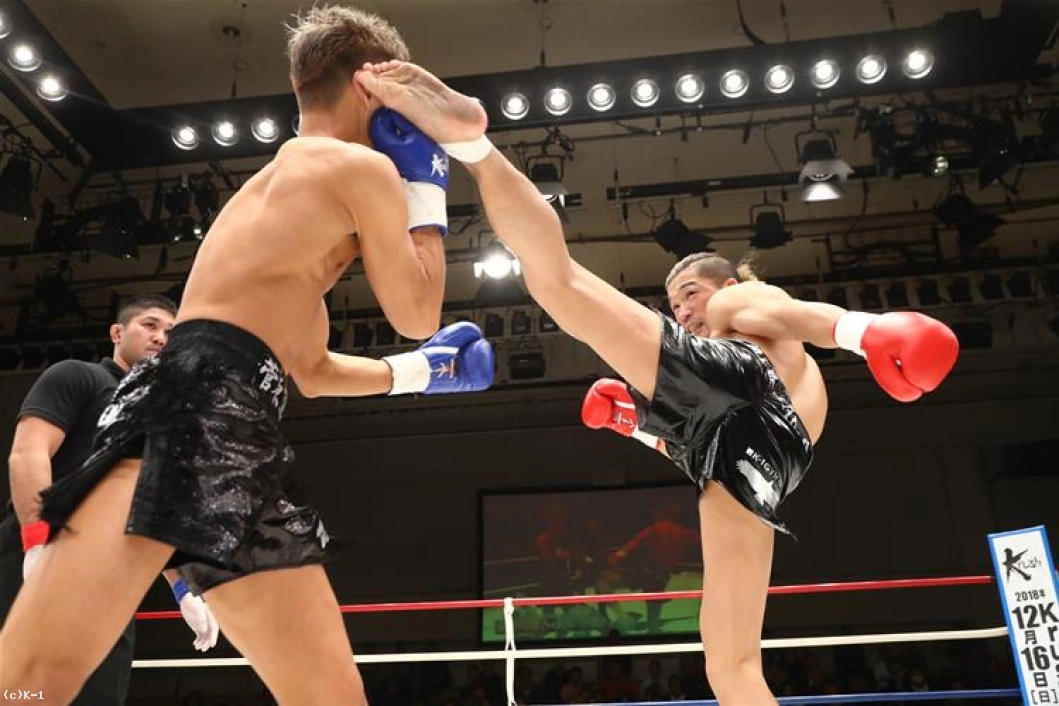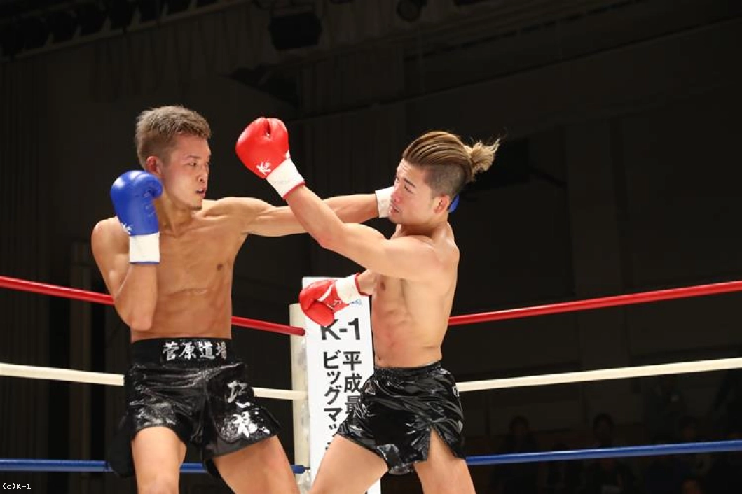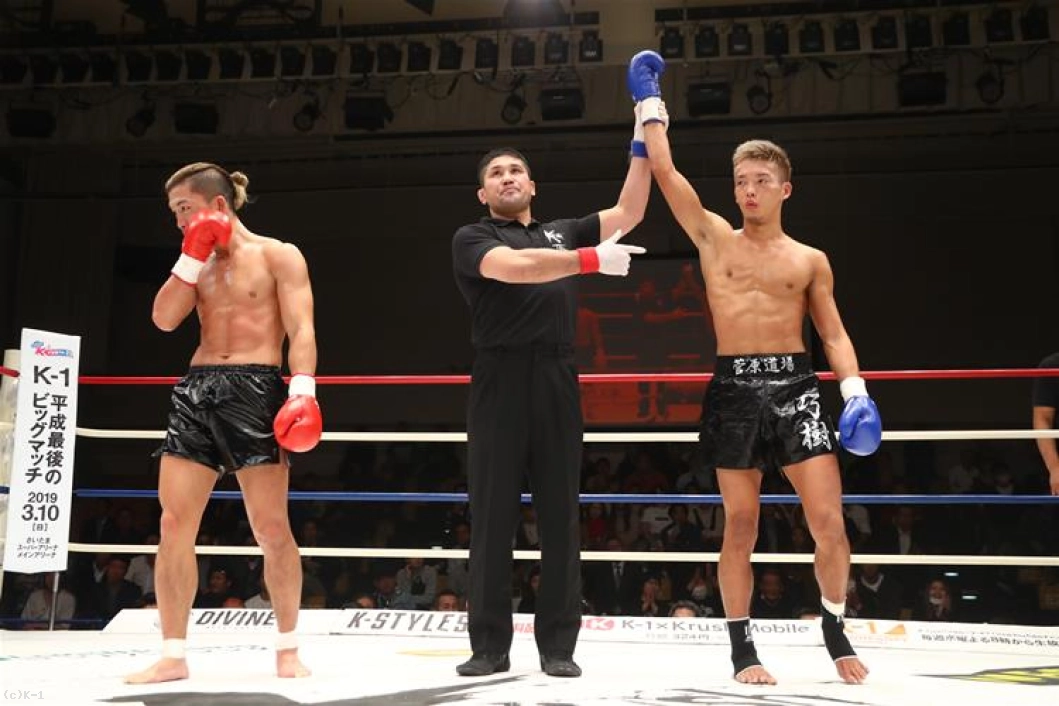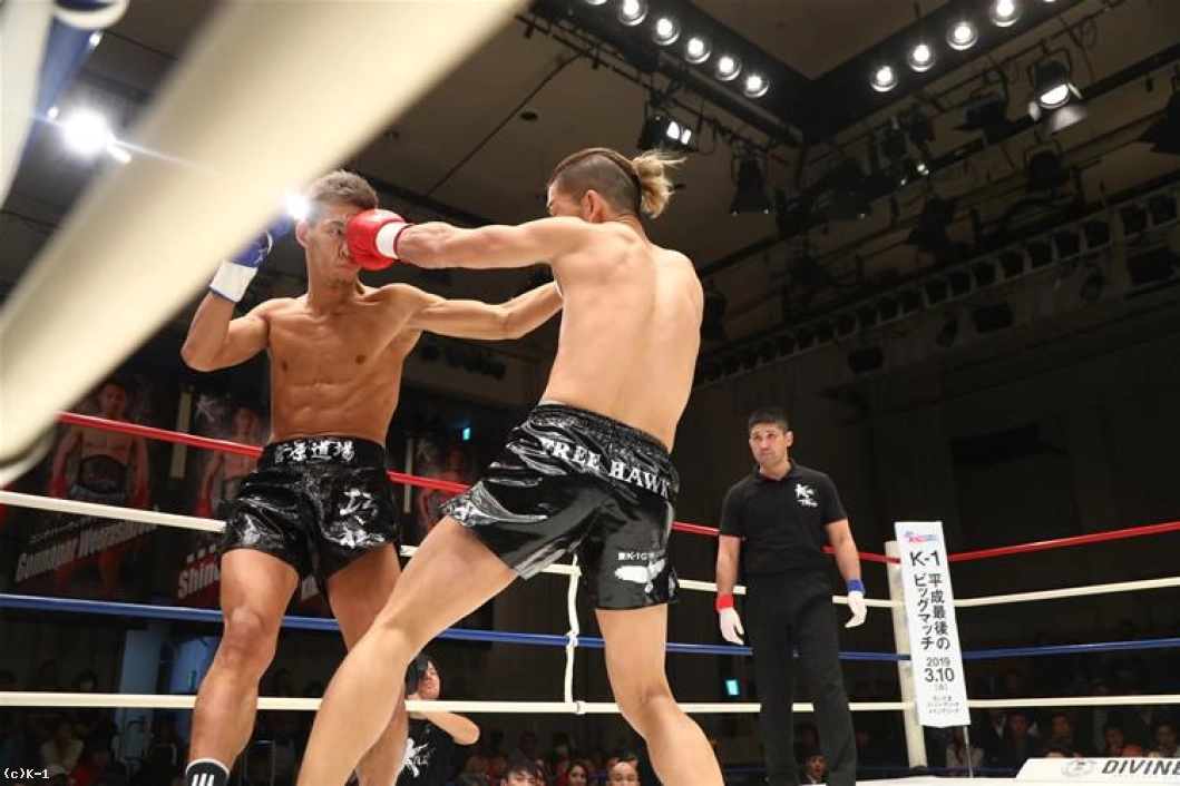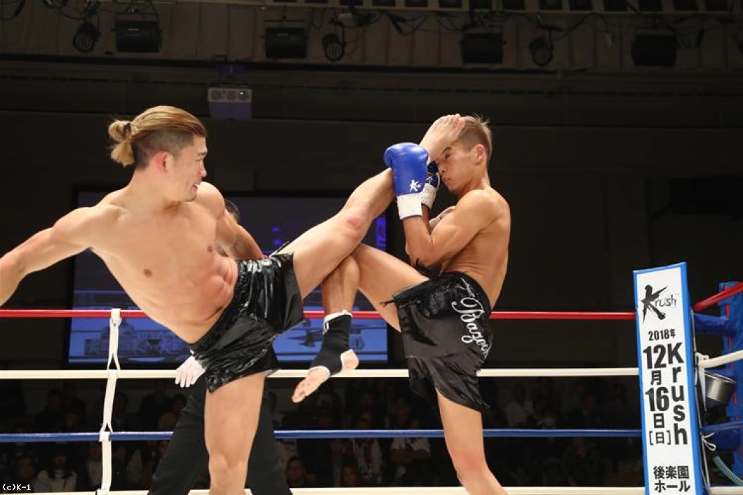 3R、明戸はグッと間合いを詰めてボディから顔面へと左右フックを走らせる。バズーカは変わらず前蹴り・左ミドルで距離を取るが、明戸はそれに止められず左フックをヒット。バズーカは熱くならずボディへのヒザ、左ハイキックと蹴り主体の攻めを変えない。明戸の振るうパンチに合わせ、ヒザ・左ミドルと打ち込むバズーカ。明戸をじわりじわりと下がらせ、ロープを背にしたところで左フック・右フックと振るう。判定は30-29、29-29、30-28の2-0でバズーカ。蹴りを主体にした戦いで勝利した。