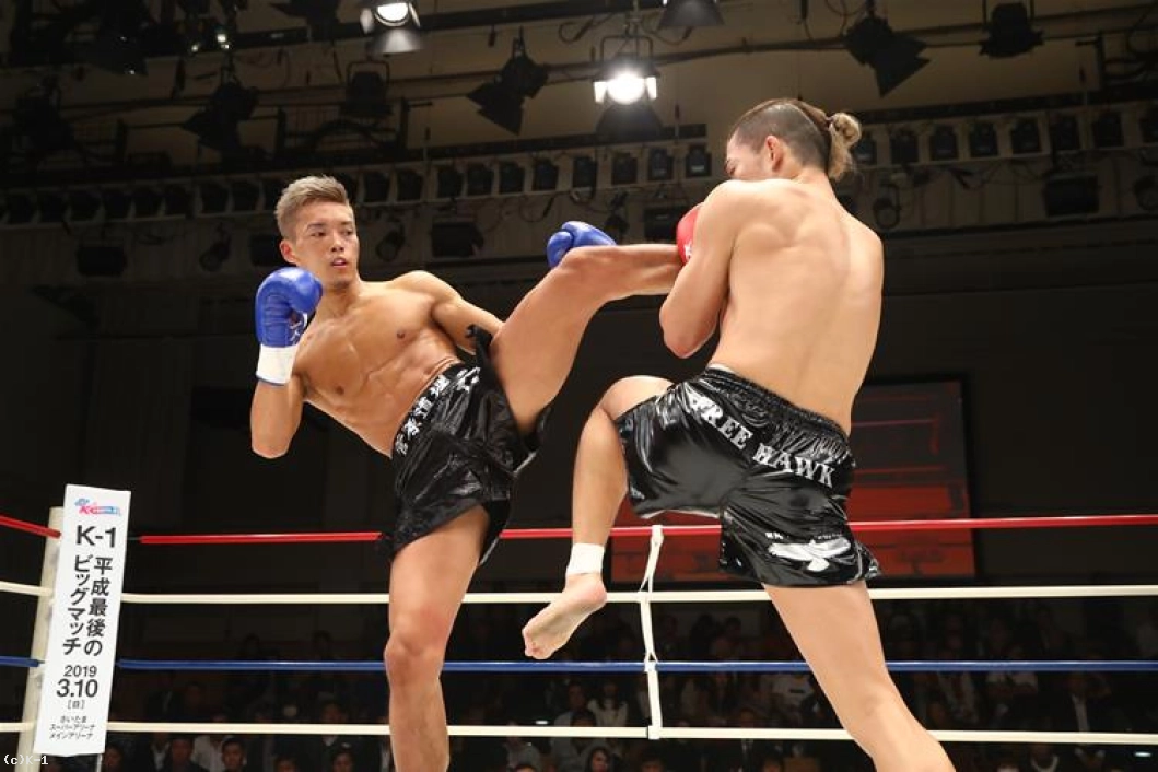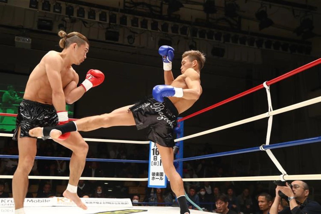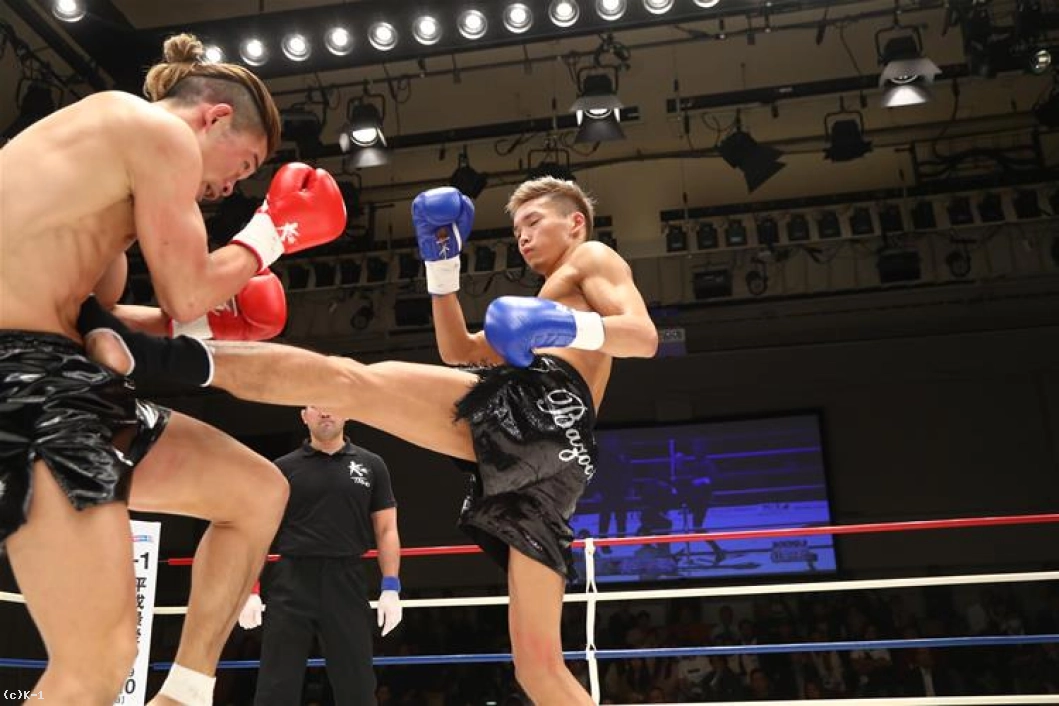 1R、ともにオーソドックスからバズーカは前蹴り、右ローと綺麗なフォームで蹴りを入れていく。明戸はそれをさばいて接近し強打を振るう。しかしバズーカはよく見えておりブロックして当てさせない。タイ修業を行ってきたバズーカはムエタイ式のアップライトの構えであまりパンチを出さず、蹴りを主体に展開する。