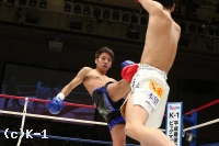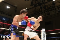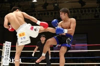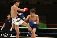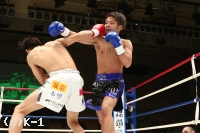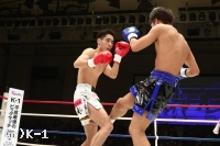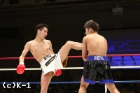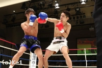 2R、藤田が右インローで先制するが、これがローブロー。橋本にインターバルが与えられる。再開後、橋本はやはり距離を作って左ミドルを藤田に打ち込む。飛び込まんとする藤田だが、橋本の作る遠い間合いに飛び込めない。右インローから間合いを詰めるきっかけを作ろうと右ストレートを当てる藤田。しかし橋本はすぐにバックステップして追撃を許さない。逆に橋本が左ストレートを伸ばして前に出ると、藤田は右ショートストレートをカウンターで当てる。