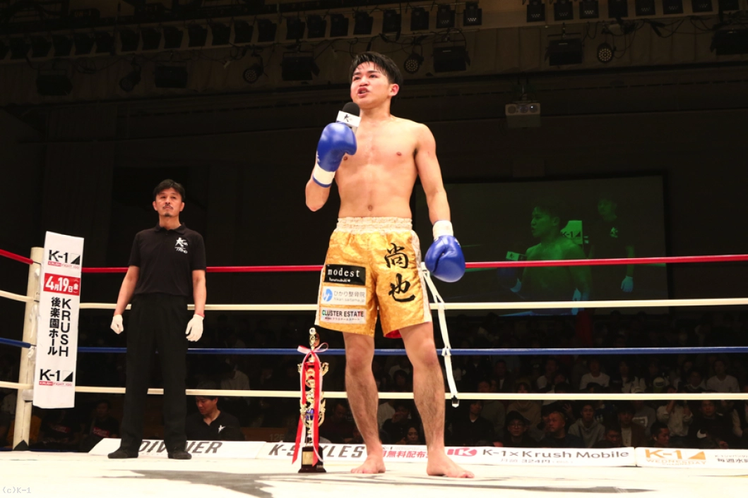「応援ありがとうございました! 自分が初めてKrushを見に来た時に桝本選手が試合をやっていて、今日試合ができて光栄でした。先日おじいちゃんが1週間前に亡くなって辛いこともあったんですけど、いい報告ができてよかったと思います。僕はKrushに夢をもらってリングに上がってます。Krushを見てなかったら格闘技もやってなかったし、これからは僕がいろんな人に夢を与えていける試合をしたいと思います」