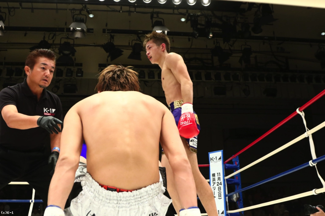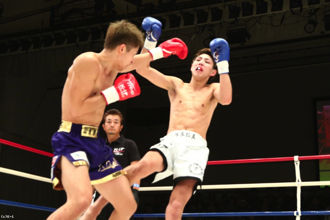 2R、初回にダウンを奪った鈴木は詰めていく戦法を変えない。左ジャブから入り右ストレート・右クロスに繋げ、ローキックで攻める。塚本もボディにヒザを放ち、リーチのある左右ストレートで応戦する。ここで鈴木のストレートがとらえ、塚本はダメージを見せ後退。鈴木はダウンを迫り、左フックと右ストレートを浴びせる。