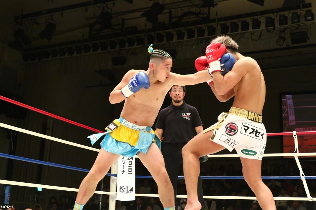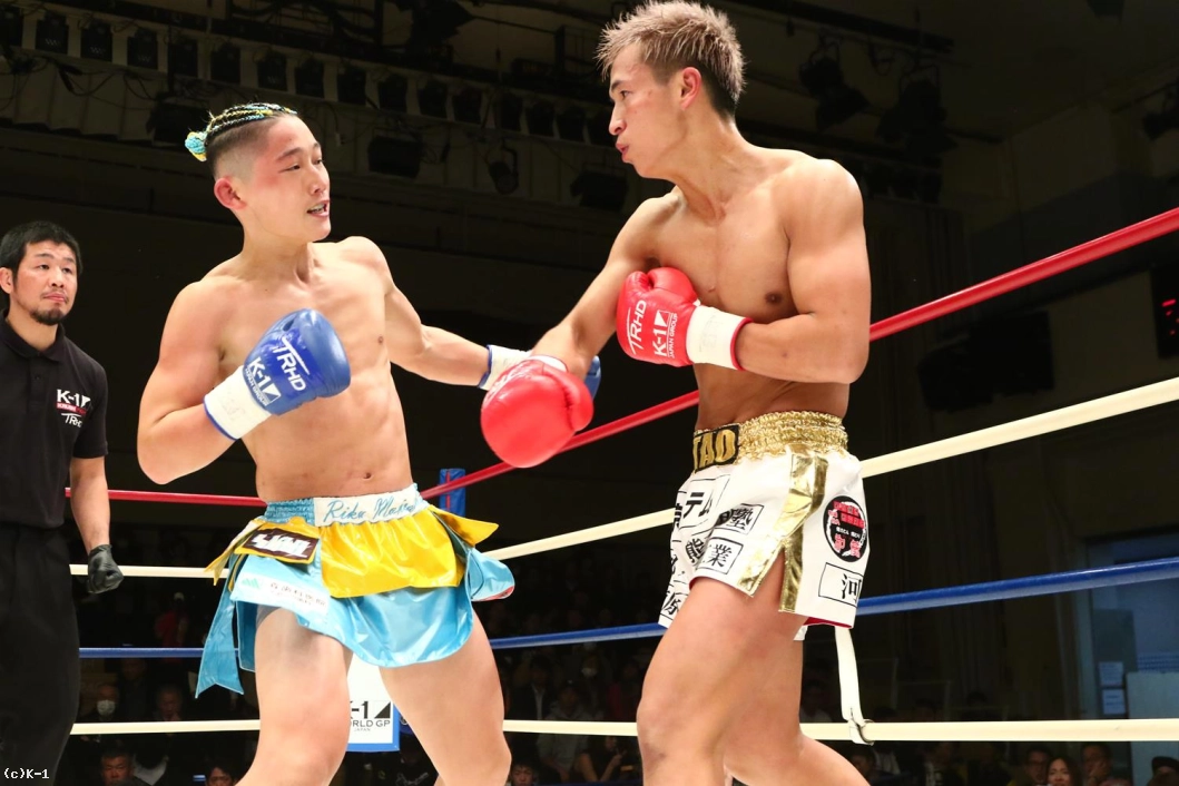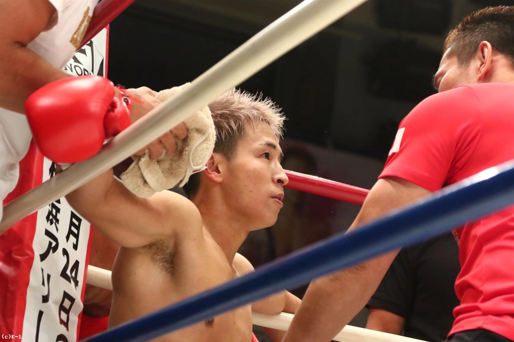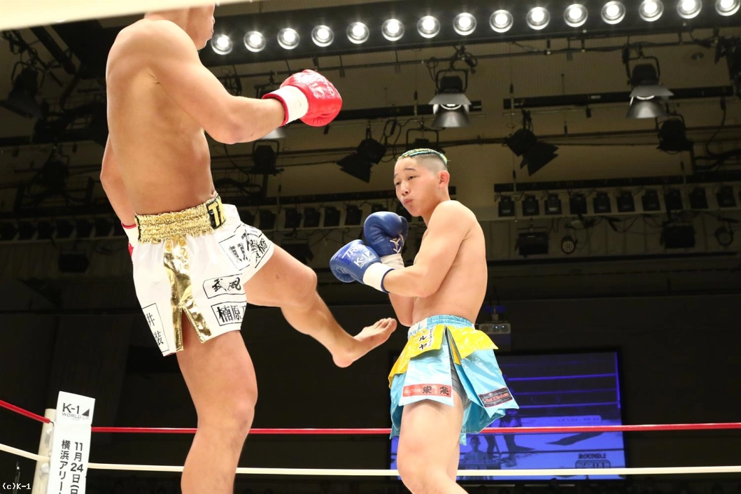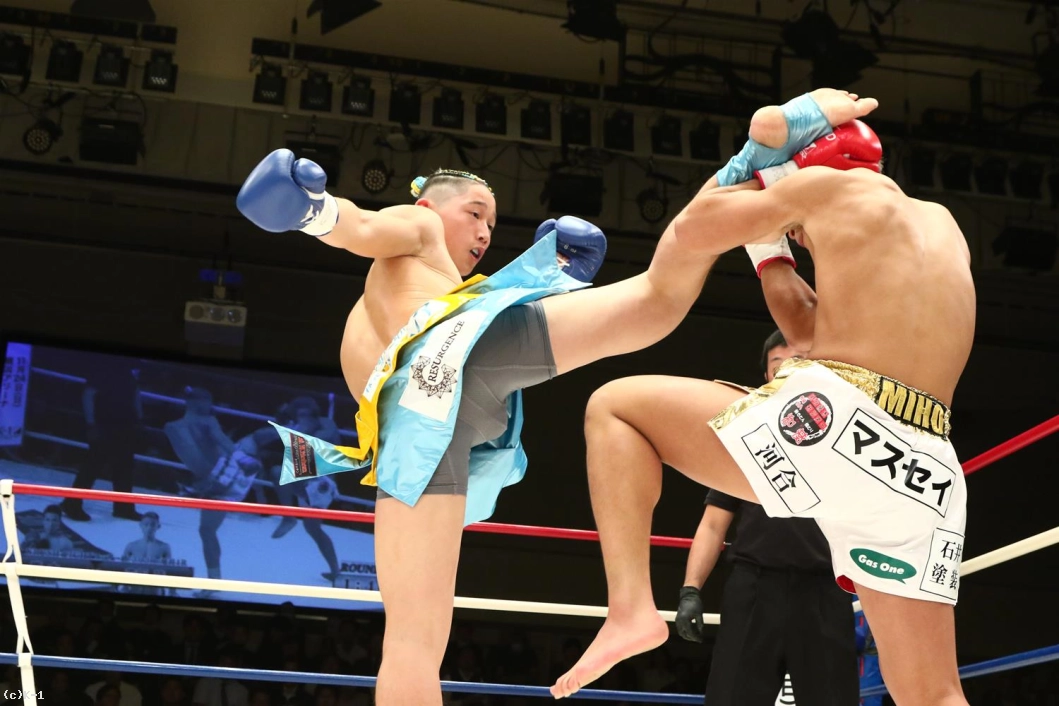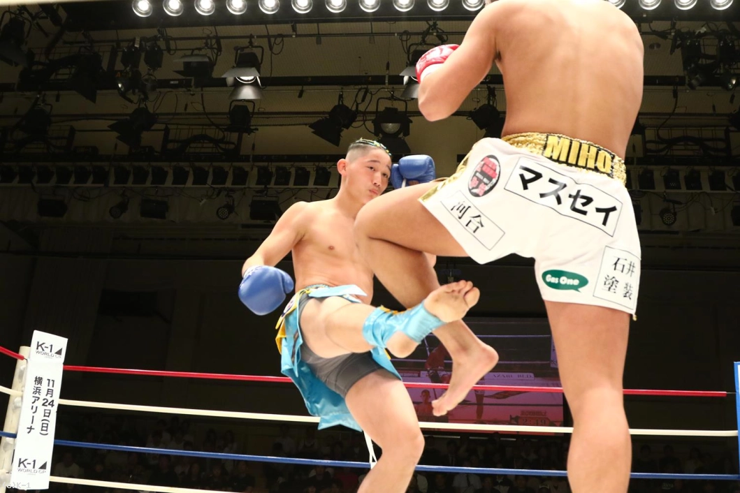 1R、パンチと右ローでオーソドックスな攻めを見せる鷹大に対し、森坂は前蹴りで飛び込み、クルリと回転しての二段蹴りと持ち味とするトリッキーな攻め。しかしその後森坂は圧力を発して前に出ていく。鷹大もしかし押されたままにならず、左ボディから右ロー。森坂も出返して右ローを入れ、両者一進一退となる。