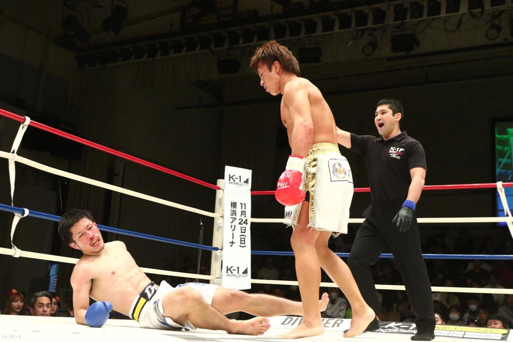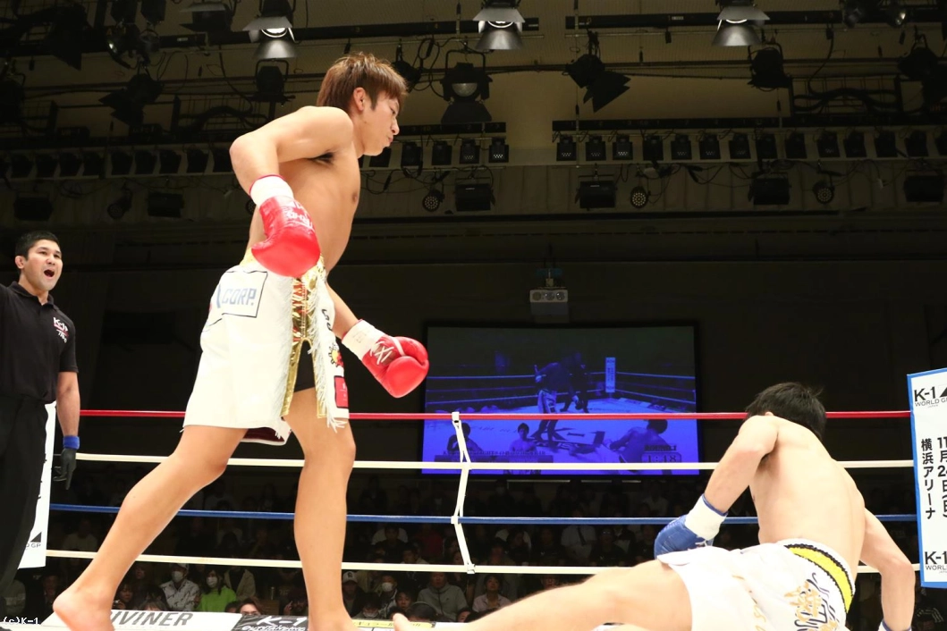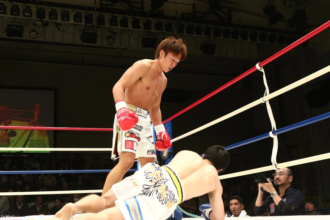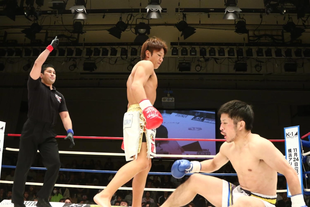 2R、蓮實は両手を低めにしてリラックスした構えから再び強打を狙っていく。関川は右ローを蹴りつけるが、蓮實はボディフックから顔への右フック。蓮實は強打の連打を止めず、右ストレートから右フックを繋ぎ、関川をガードごとなぎ倒して2度目のダウンを奪う。立ち上がる関川だが、挽回には至らず2Rが終わる。
