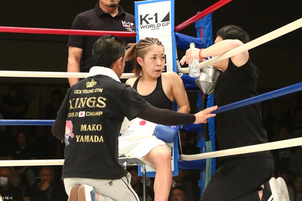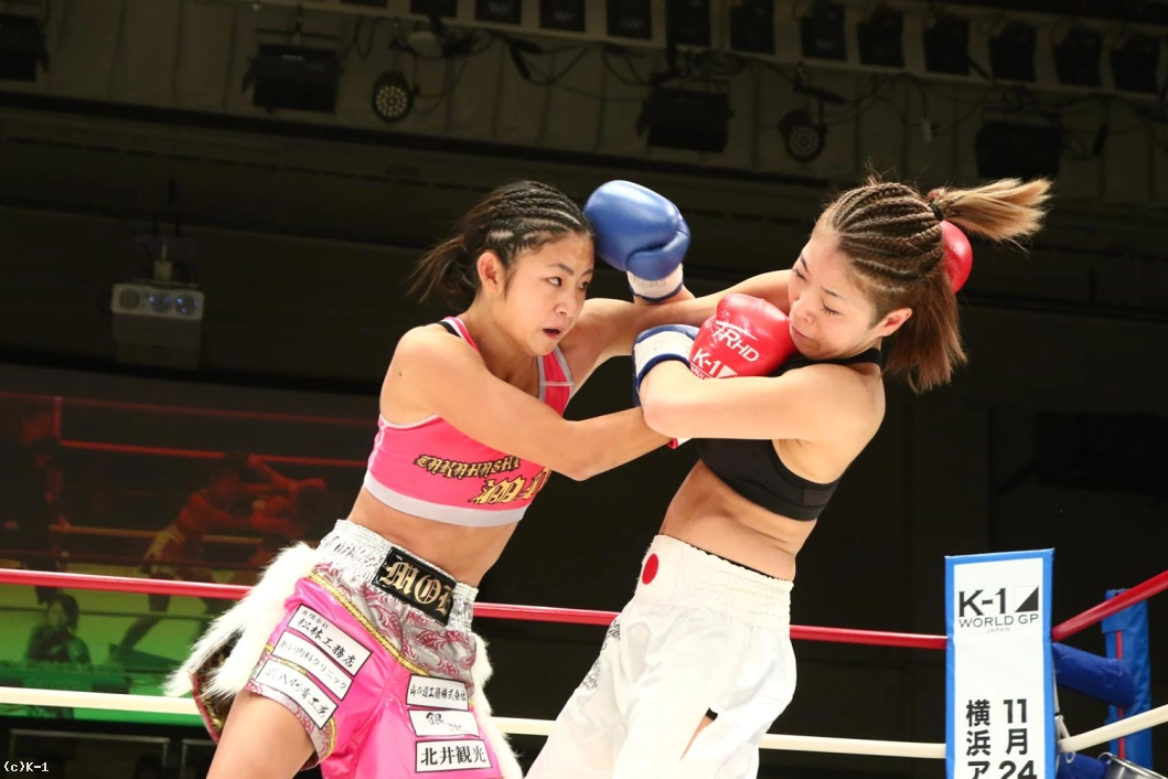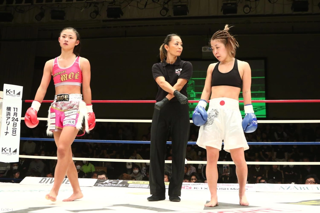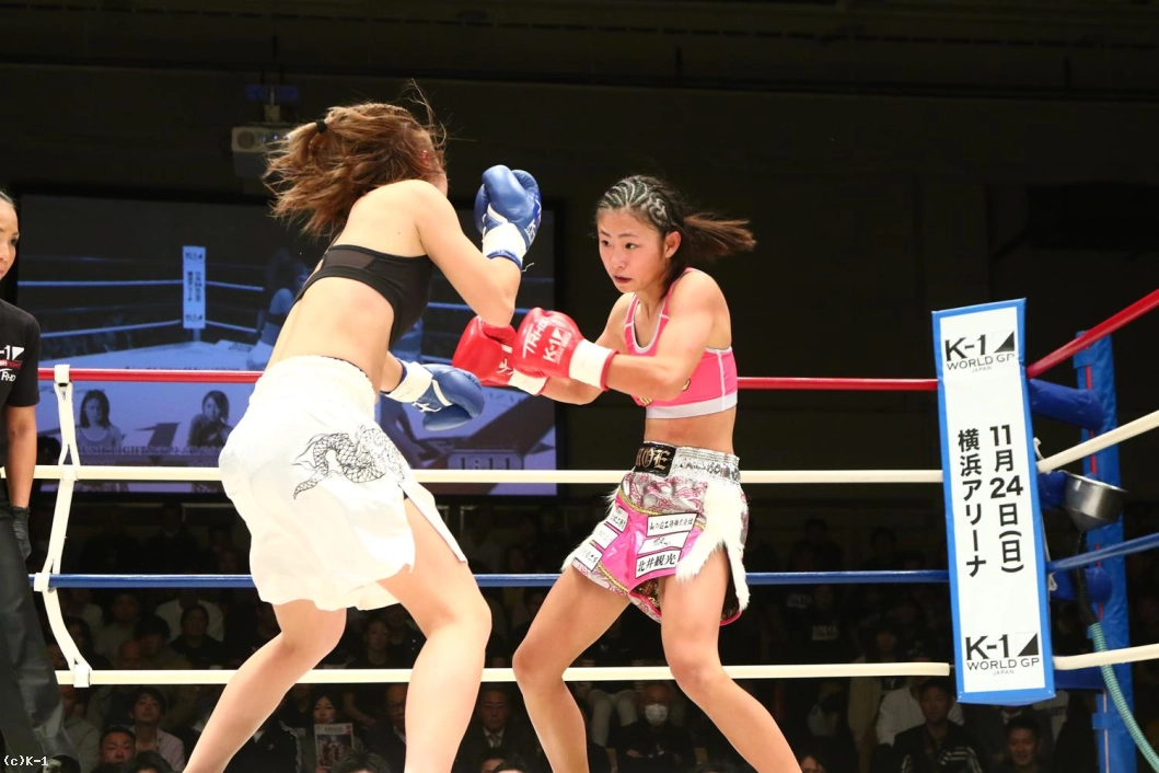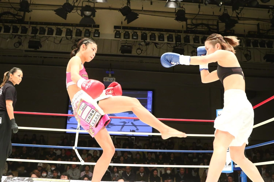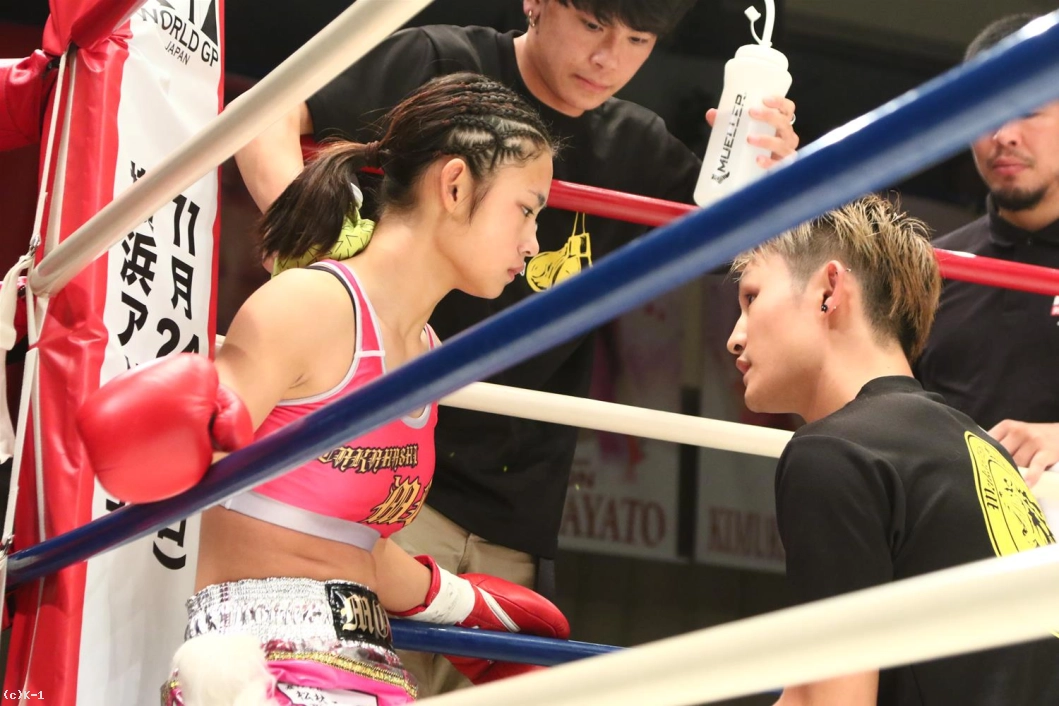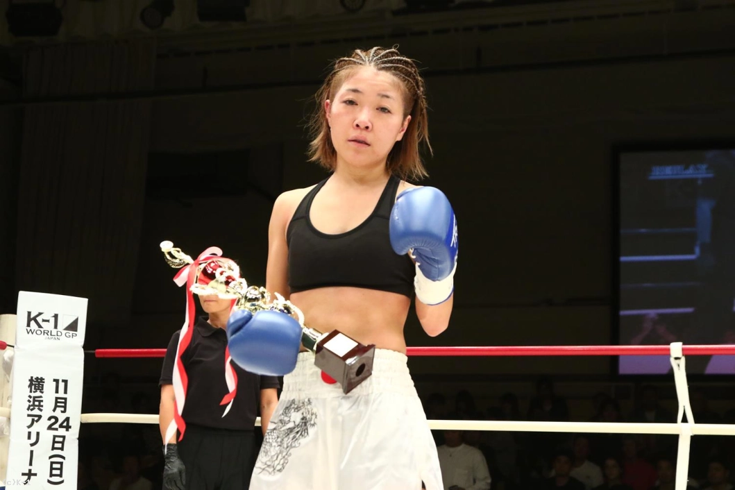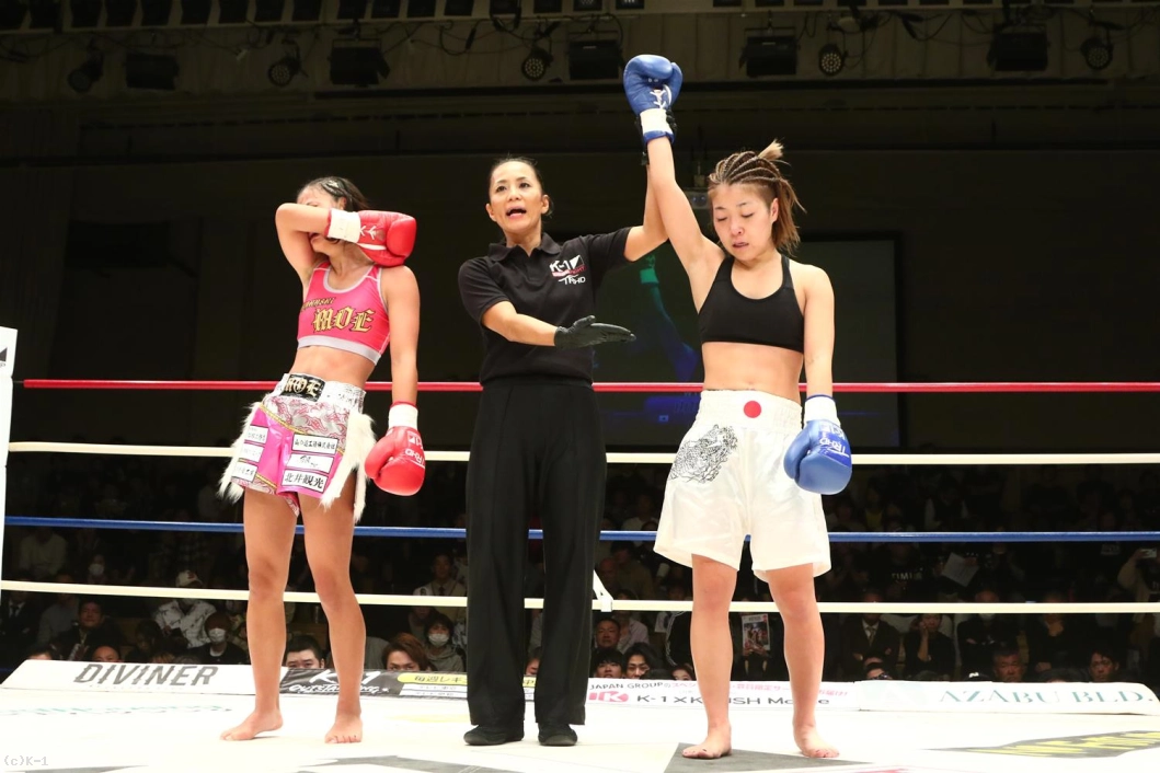 「(5年ぶりの試合を振り返って?)緊張とかはなくて、ずっと試合が始まるまでワクワクして楽しみな感じだったんですけど、自分が思ってたよりもなかなか試合をうまく運べなくて。動けてなかったのが悔しいですね、全部出しきれなかったので。そこがまだまだ自分の甘いところかなと。それができるよう、一人前になりたいです。(対戦相手の印象は?)動画を観て蹴りがすごいうまい印象があったんで、その対策をずっとしてきました。今日も1R目から警戒はしてたんですけど、警戒しすぎて見合ってる時間が多かったのかなと思います。(現在、女子アトム級の王者は高橋Knuckle美穂選手だが、今後の目標は?)まだまだ自分は挑戦させてもらえるようなレベルじゃないと思うので。今日の試合で課題もたくさん見つかったので、そこはプラスに考えて、次につなげられるように練習をすぐにでも開始したいと思います」