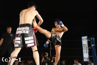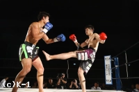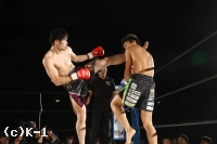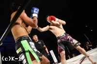 2R、和島はさらに蹴りを止めず左ヒザ、左ミドル、左ハイと猛攻。やはりこの蹴りが強く藤村は出られない。ラウンド中盤、和島は左ミドルから左ストレートを繋げていく。右目じりから出血の見られる藤村。和島は左ハイを打ち込み、左ミドルでもわき腹をエグる。藤村がパンチを狙って距離を詰めても和島はボディへのヒザを打ち込み、さらに左ハイ、左ミドルと攻める。