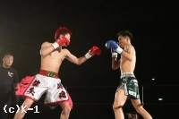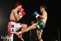 1R、ともにオーソドックスで、上背で劣る椿原だが前蹴りで黒田を崩し、そこからストレートなどパンチを繋ぐ。黒田はリング中央から攻めて出んとするが、左右フック、ヒザで切り込んでも椿原がパンチ・蹴りのリターンを忘れず、攻撃を分断される。