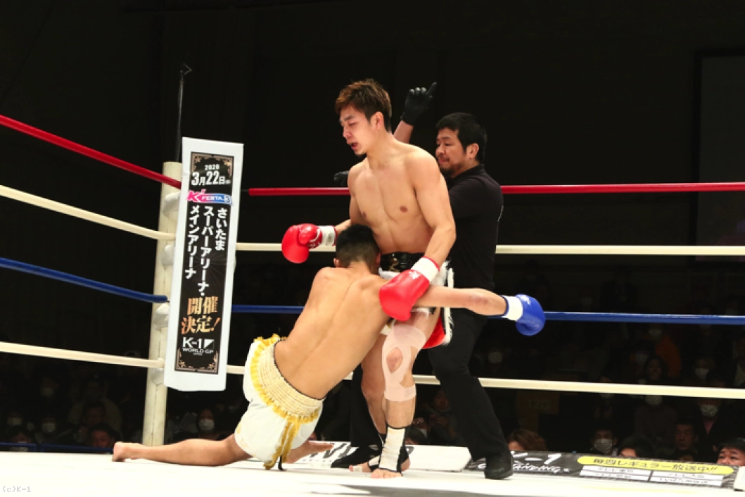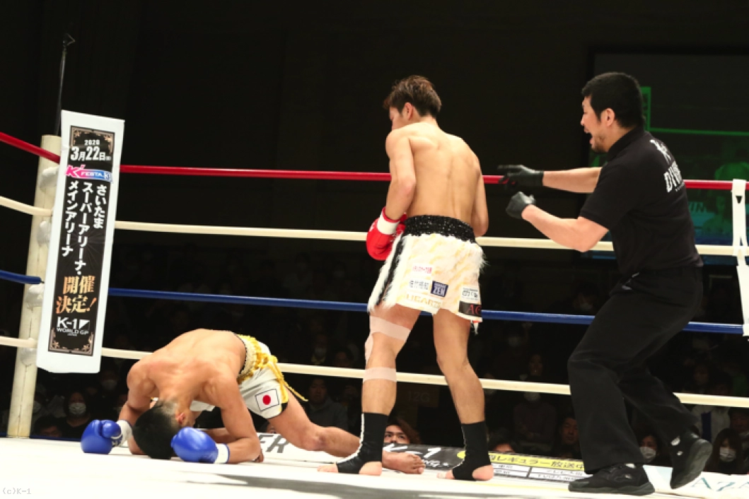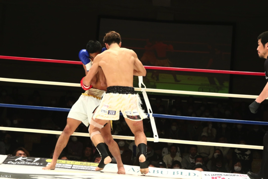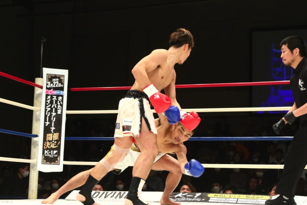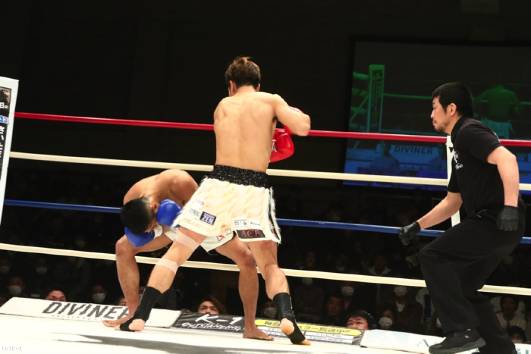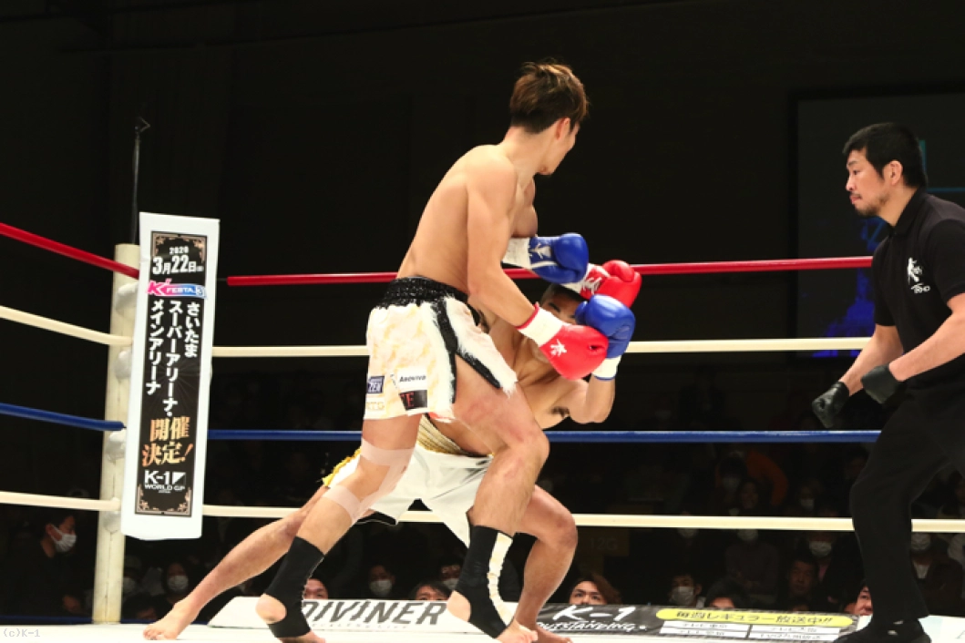 「(試合を振り返って?)ちょっと狙いすぎちゃって、最初固くなっちゃったんですけど。まあ、一回目のダウンも狙いどおりのカウンターのフックで取れたんで、よかったです。(対戦相手の印象は?)もっとガンガン来ると思ったんですけど、あんまり来なかったんで、やりやすかった感じはあります。(今後の目標は?)60kgだと減量ないくらいなので、Krushの57.5kgのベルトがいま空位なんで、そこをしっかり獲りたいと思います」