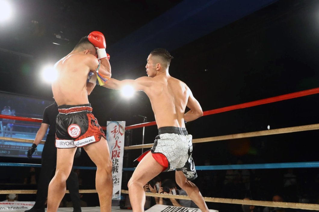 1R、パンチを警戒してかガードを高く上げてゴンナパーは向かう。篠原は左ボディフック、左フック、右アッパーと振るっていく。ゴンナパーも左ストレートを伸ばしてヒットする。ガードを上げて前進しプレッシャーを掛けるゴンナパー。篠原はロープを背にして止まらず、右ボディストレート、左フックと入れて横に回る。