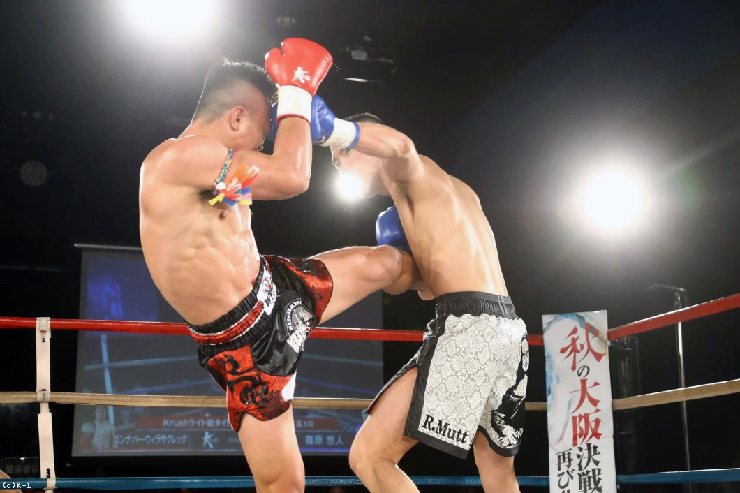 3R、アッパーとストレートを繋いで出る篠原だが、ゴンナパーはガードを崩さない。左ミドルを当てゴンナパーは前進。篠原も左ボディ、ローにミドルと返すのだが、このプレッシャーを遠ざけるには至らない。左ミドルの数を増していくゴンナパー。ハイキック、そしてミドルとハイの中間の高さの蹴り、前蹴りも篠原に打ち込み試合を終える。判定は30−28、30−28、30−29の3−0でゴンナパー。王座防衛を成すとともにリベンジを果たした。