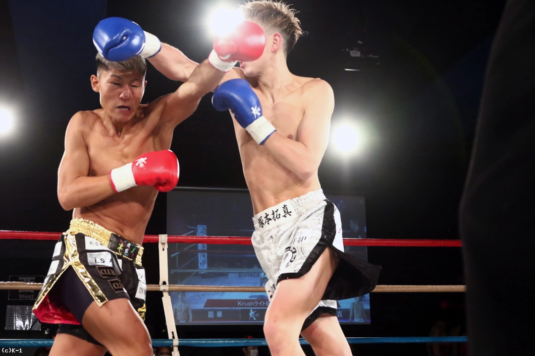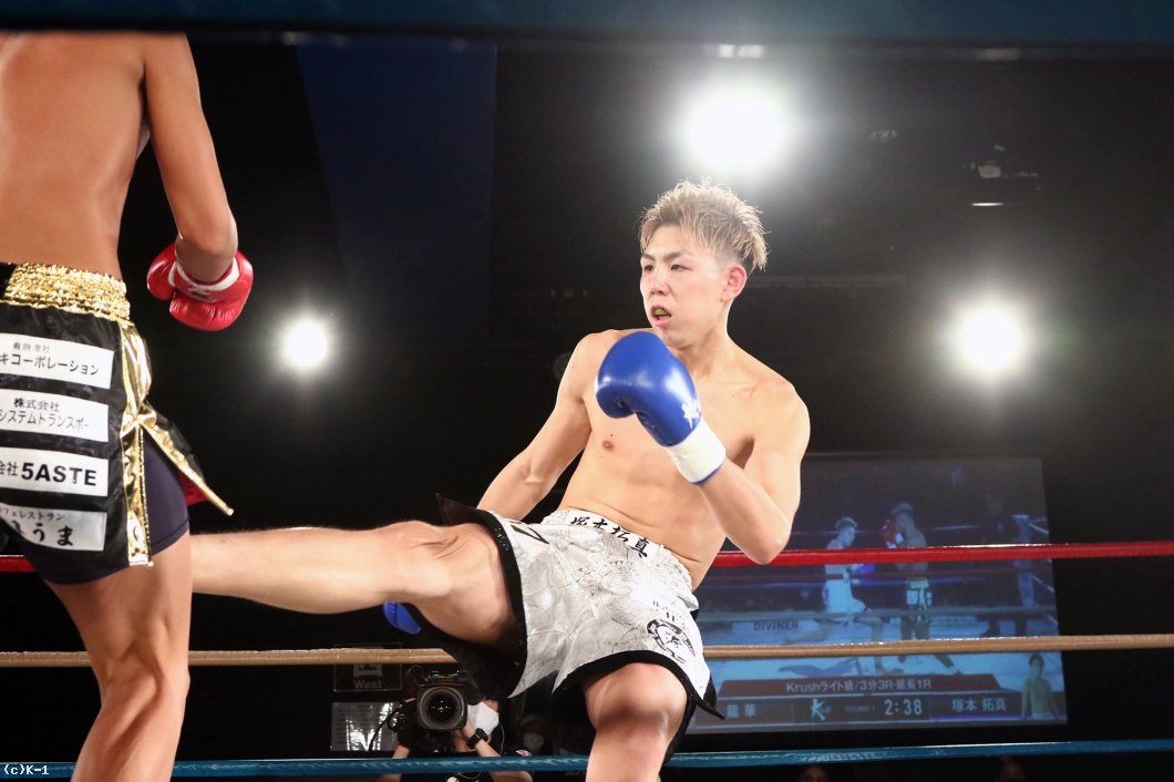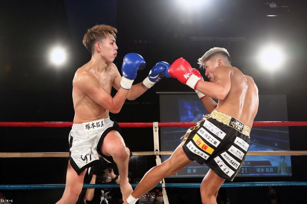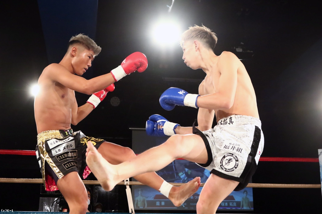 1R、龍華はサウスポーから左インローを連発し、長身の塚本に対しペースを握る。さらにそこから左ミドル、左ストレートと決める。塚本のミドルを空振りさせる龍華。ラウンド終盤、龍華は奥足への左ロー、左ストレートで攻める。