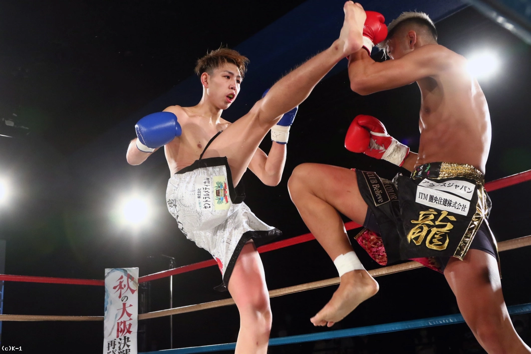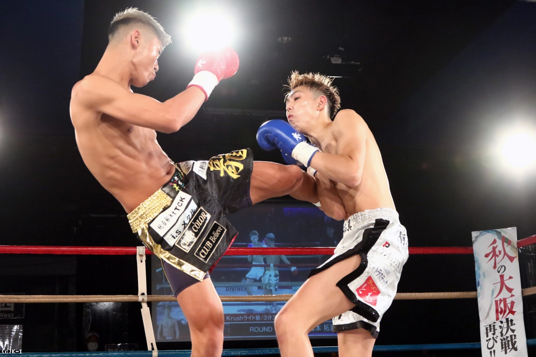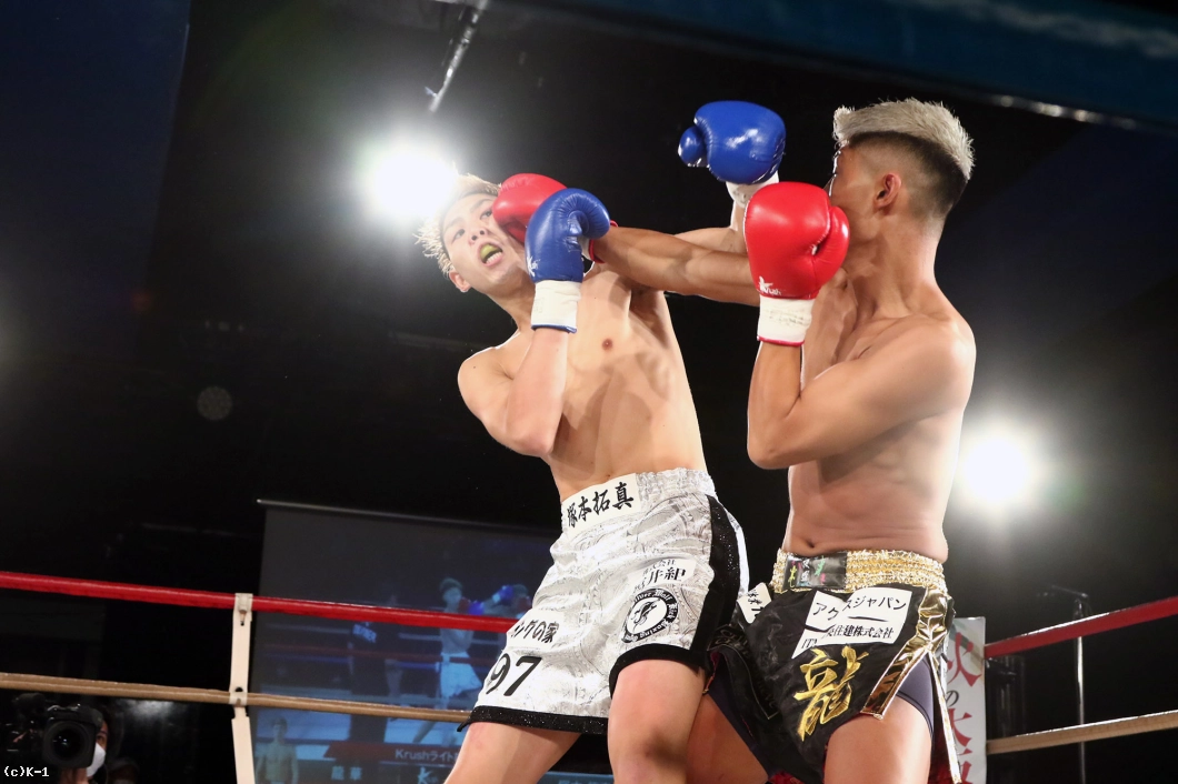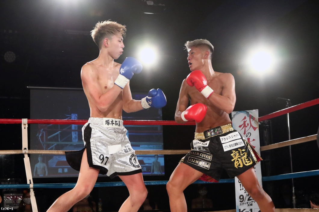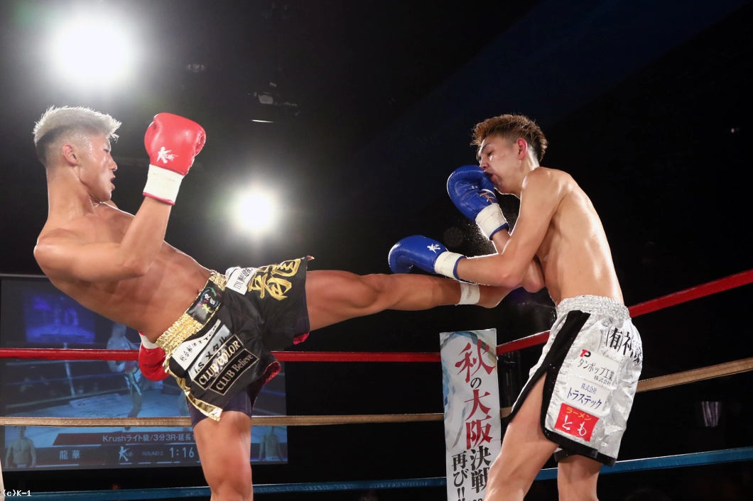 1R、龍華はサウスポーから左インローを連発し、長身の塚本に対しペースを握る。さらにそこから左ミドル、左ストレートと決める。塚本のミドルを空振りさせる龍華。ラウンド終盤、龍華は奥足への左ロー、左ストレートで攻める。