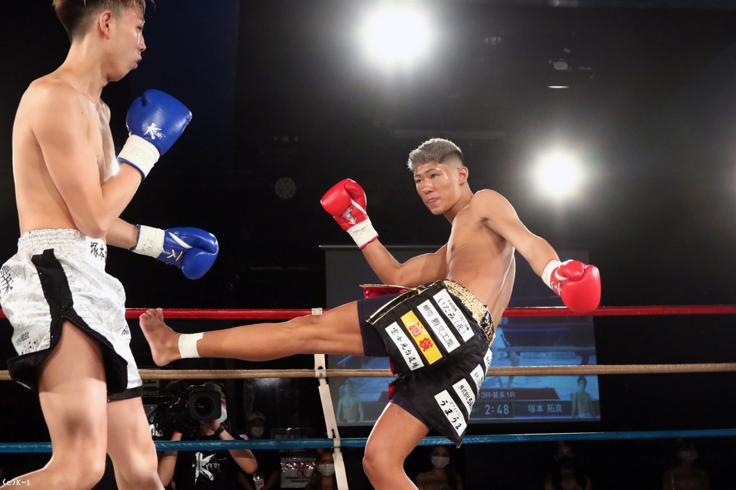 2R、龍華はリーチ差を感じさせず、左のインロー&奥足ロー、左ミドルと塚本を攻める。塚本もローを返すが、これがローブローとなり、インターバルが取られる。塚本には注意が出される。再開するとダメージを感じさせず左ハイを繰り出し攻める龍華だが、ここでまたローブローを受けてしまい試合が止まる。しかしインターバルが明けると、龍華は奥足への左ロー、右フックと塚本を攻める。