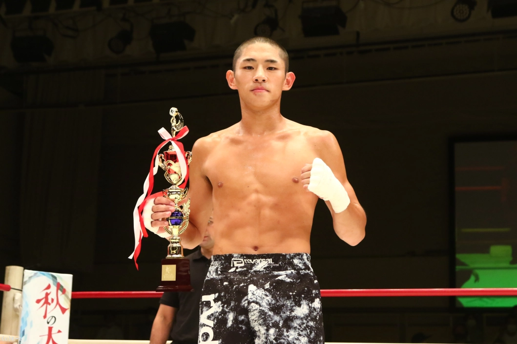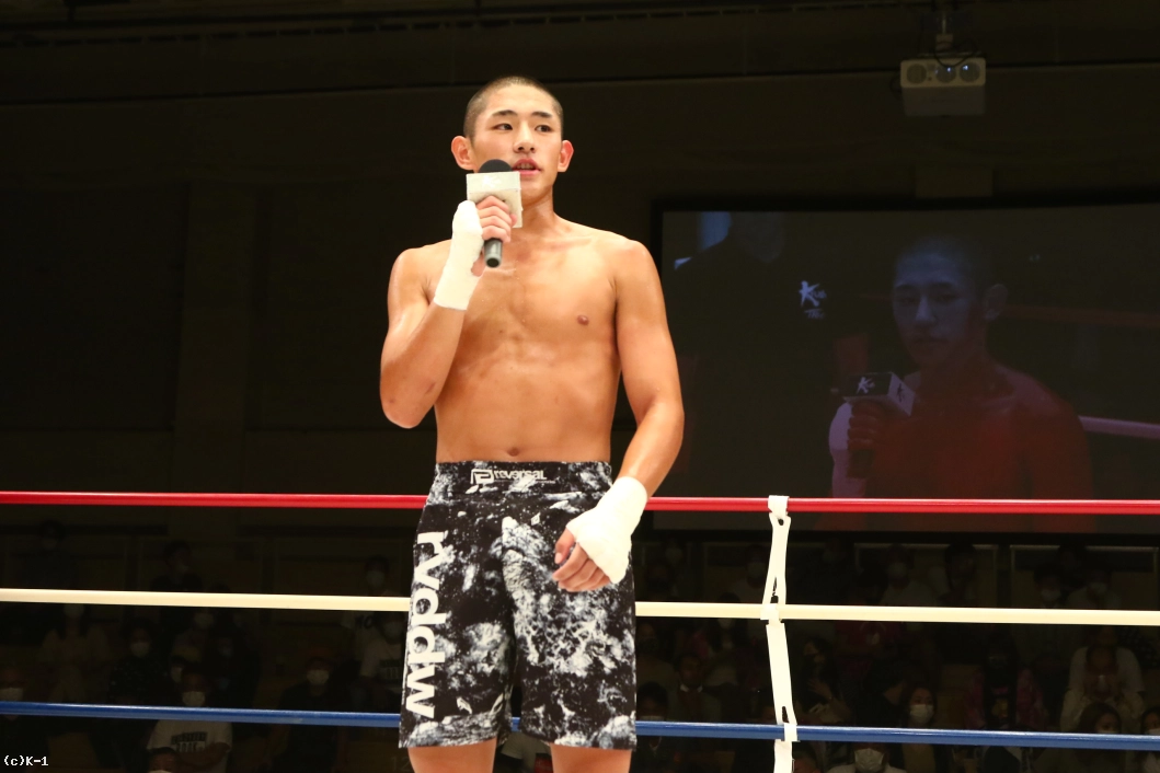 「今日はこういう時期でお忙しい中、平日にお越しくださりありがとうございます。対戦して頂いた瑠久選手もありがとうございました。瑠久選手とも決着がついて、そろそろタイトルマッチかなと思ってます。みなさんに応援して頂いたおかげでここまで来れました。まだまだもっと頑張ります。応援よろしくお願いします」
