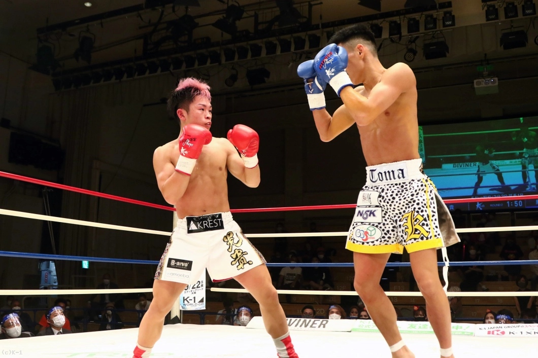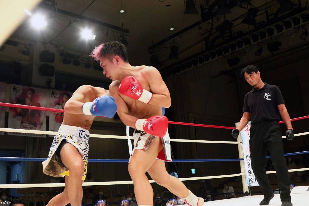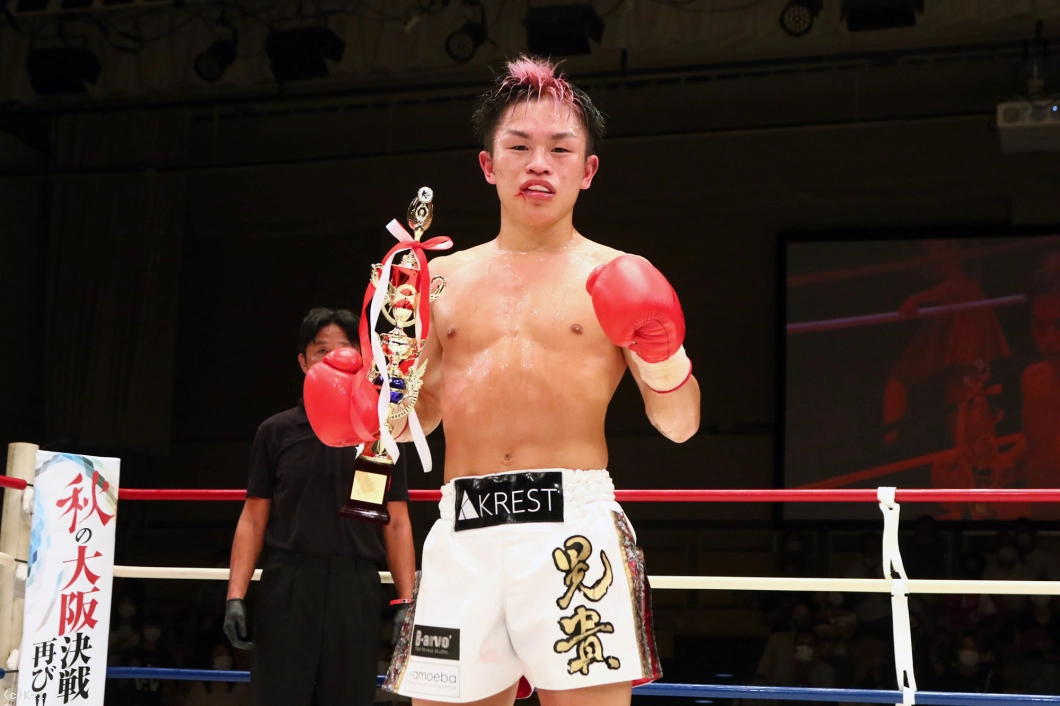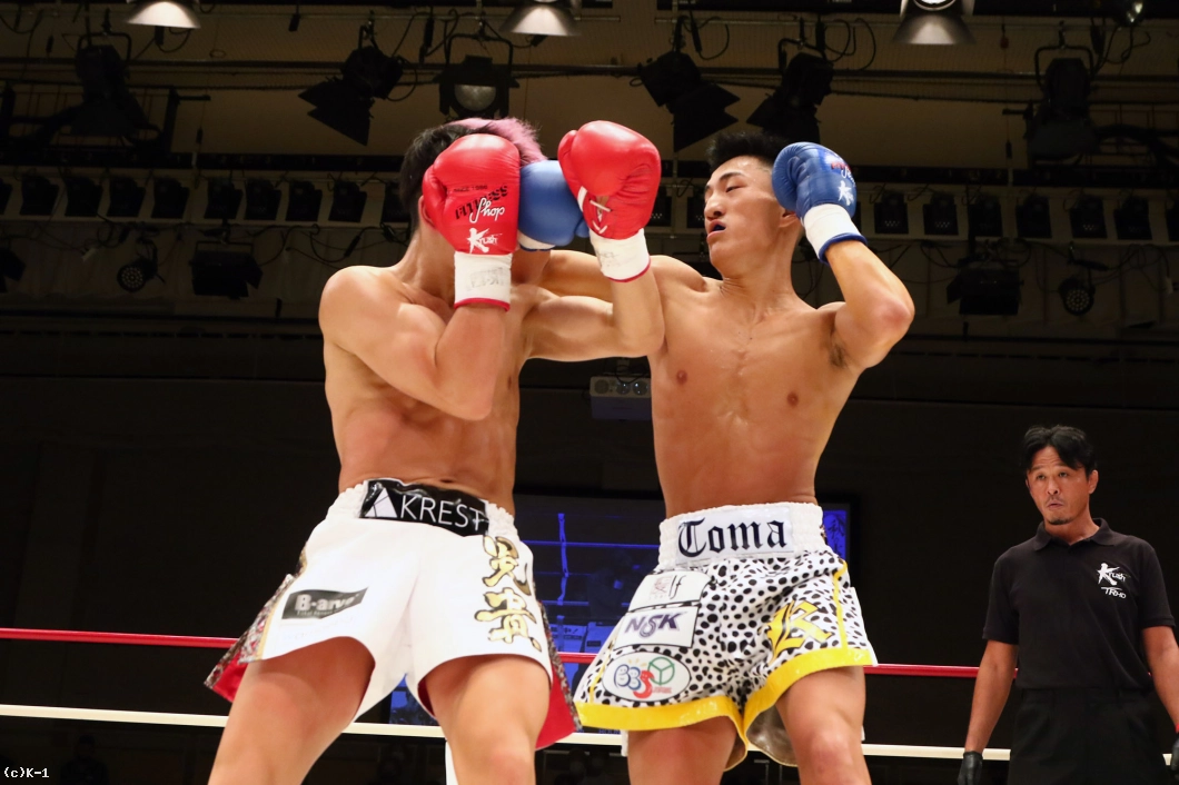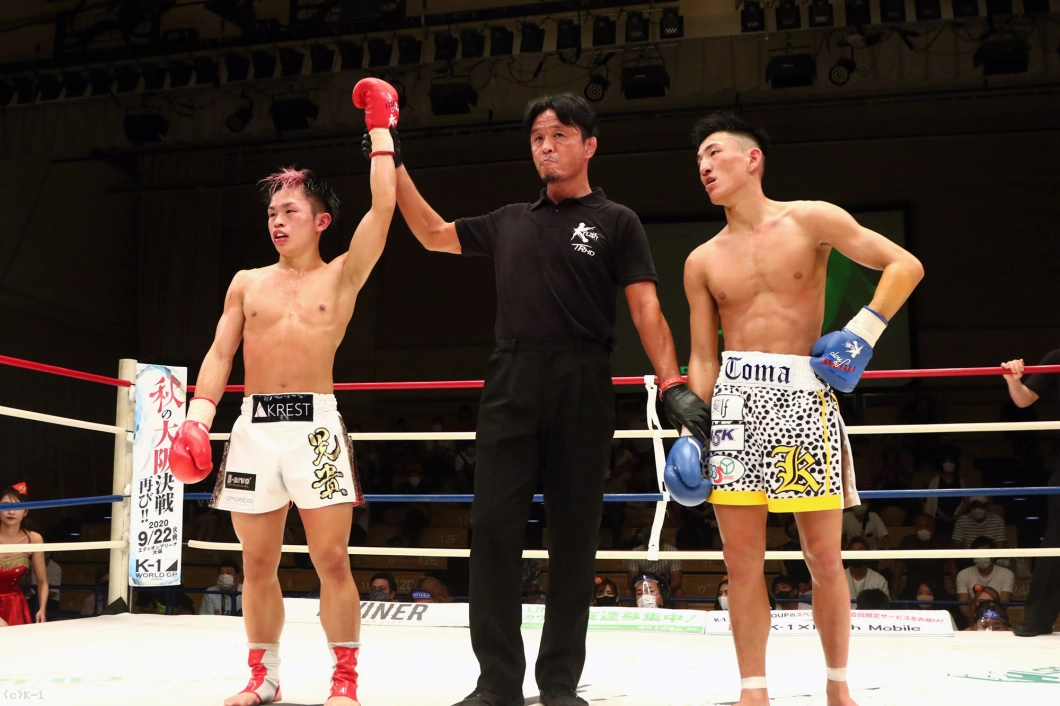 延長R、前に出る晃貴に対し、距離を作って展開せんとする黒田。晃貴の前進に合わせ、黒田はバランスを崩すインロー、右フックと放つ。晃貴はジャブ・右ストレートを伸ばすが思ったように黒田をとらえられない。しかし圧力をきかせて黒田のクリンチを呼び込み、これにレフェリーからイエローカードが出される。判定は10−8、10−8、10−8の3−0で晃貴。3連敗を脱する勝利を得た。