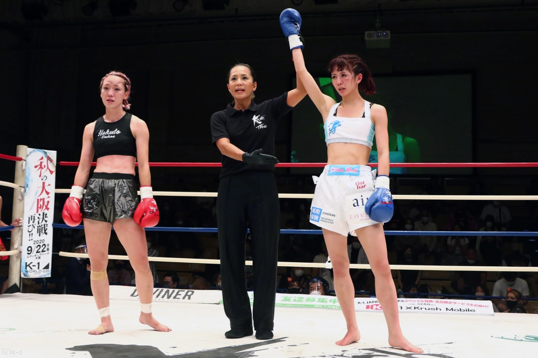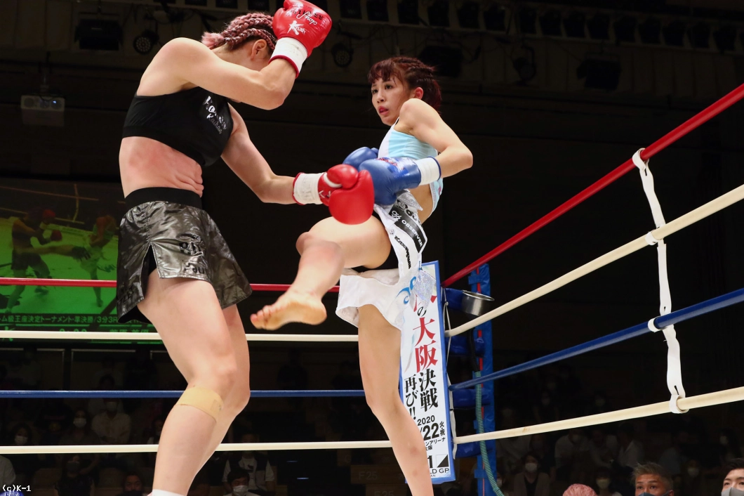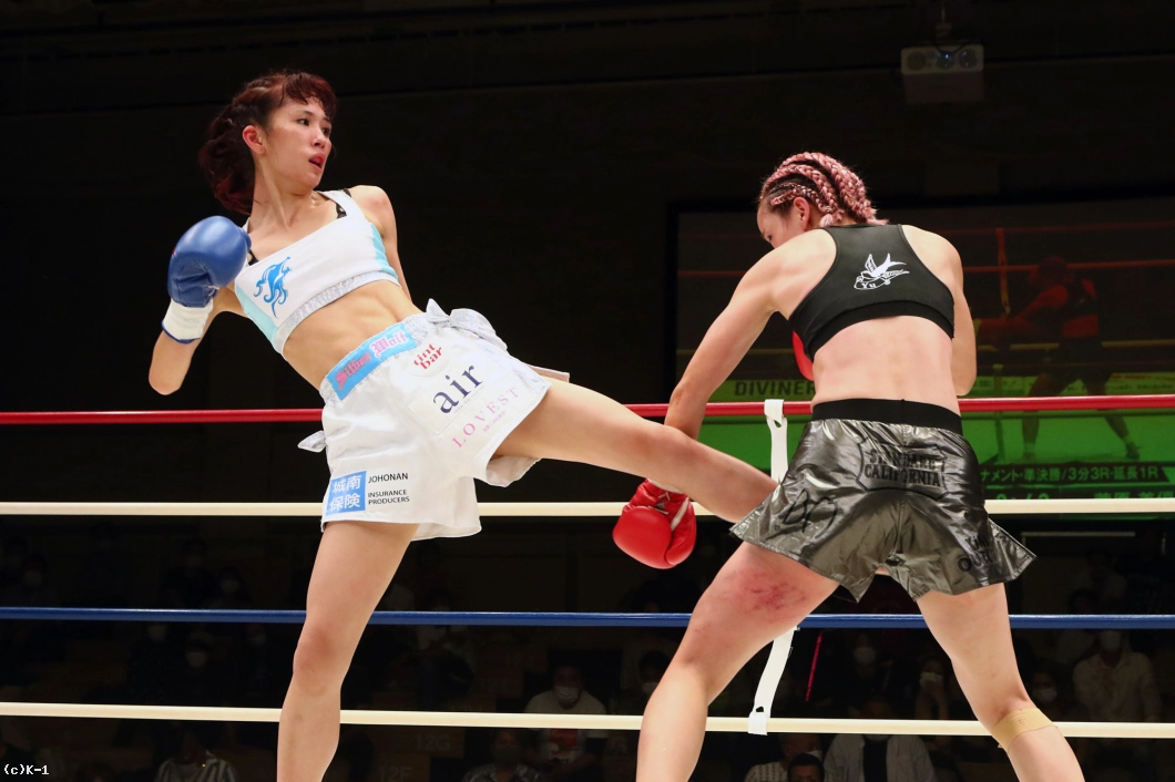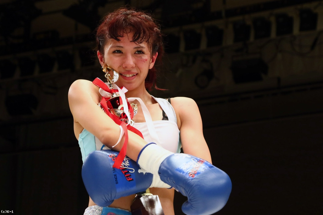 「(試合を振り返って?)練習したことはできたんですけど、もっとできたなっていう。スッキリしない試合になってしまったなという感じです。(対戦相手の印象は?)最初のイメージどおり、パンチの強い選手だなという感じです。(決勝で対戦するMOE選手の印象は?)蹴りもパンチも全部が強いかなという感じですね。(あとひとつ勝てばチャンピオンだが?)このまま微妙な試合をして勝っても、Krushのチャンピオンにふさわしくないので。次の試合までに私がチャンピオンだって言えるようなところまで、しっかり仕上げて臨みたいと思います。押忍」