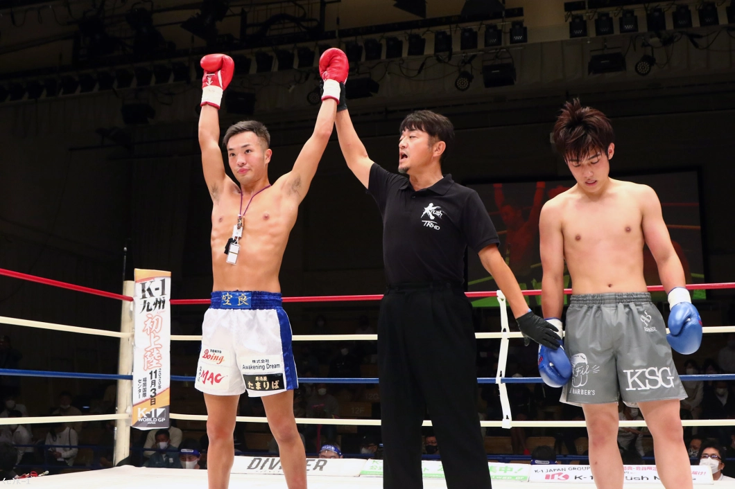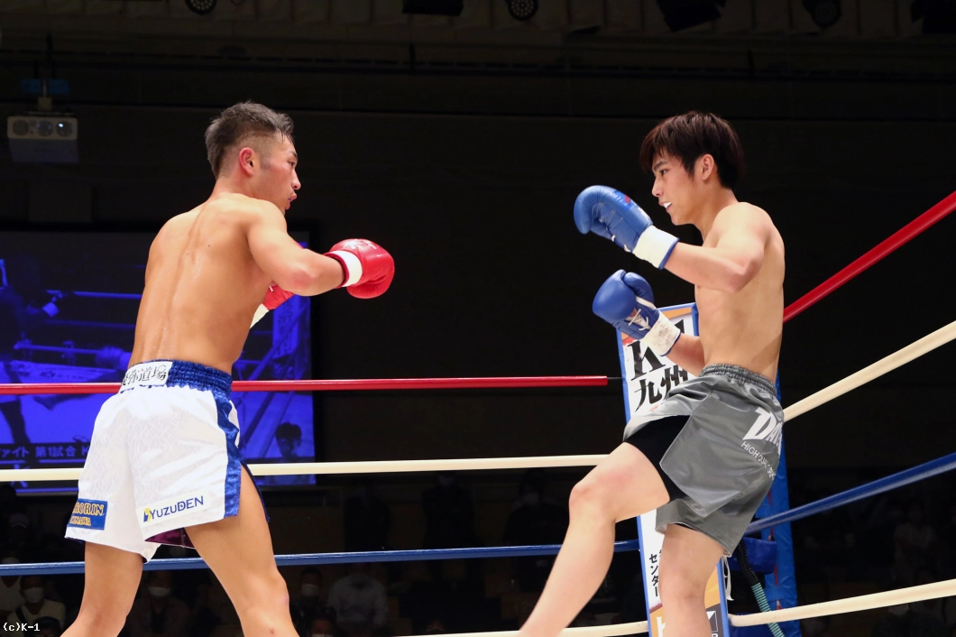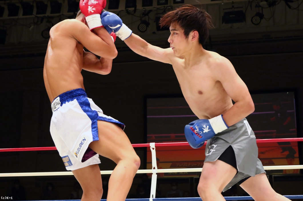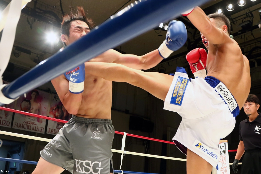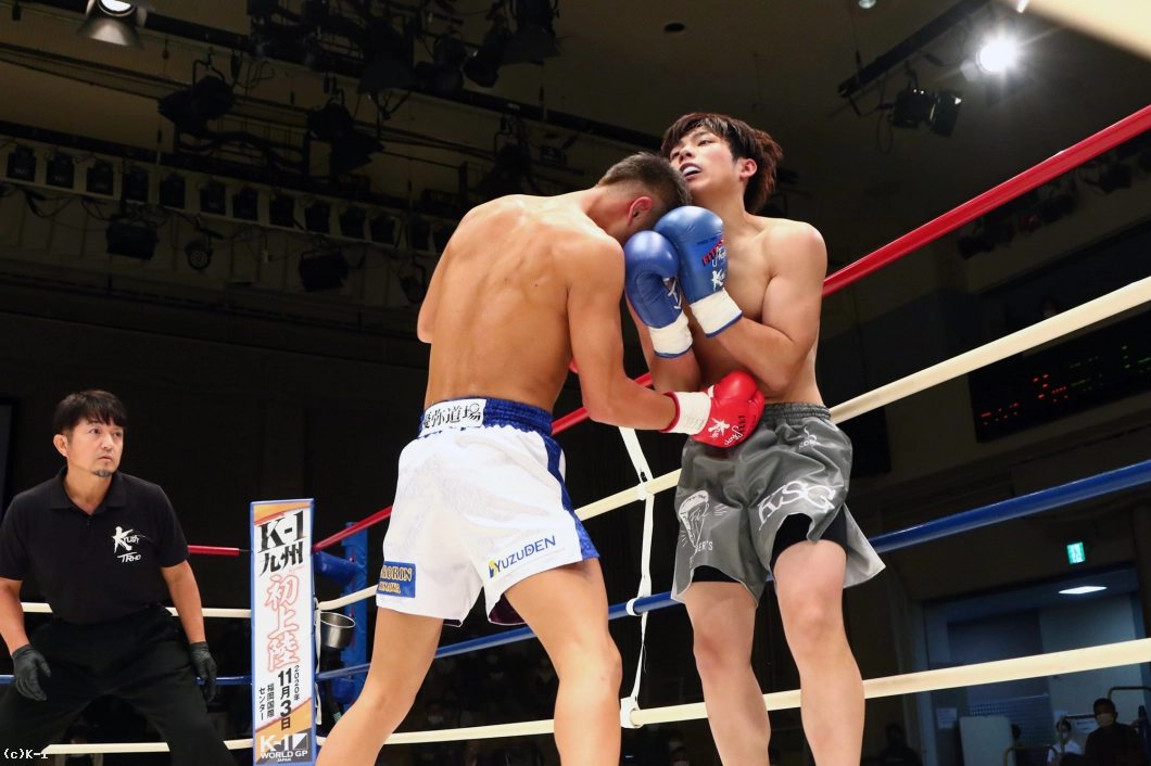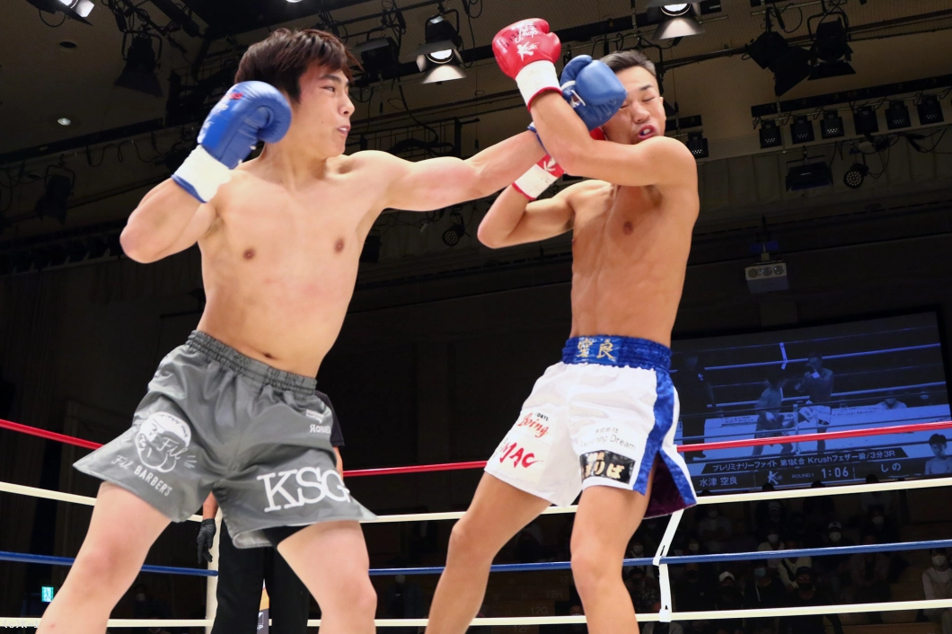 3R、水津はミドル、カカト落としを見せてしのから距離を取る。右ストレートで切り込まんとするしのだが、水津のガードに阻まれる。ボディストレート、ジャンプしてのミドルと放つしのだが水津を崩せない。逆に水津が左ハイキックを当て、しのはこれにゆっくり横向きとなり、ダウンが宣告される。水津は左ストレート、右フックとさらに強振するがダウンの追加はならず試合終了となる。判定は30−25、、30−25、30−25の3−0で水津。これでプロでの負けなし記録を4に更新した。