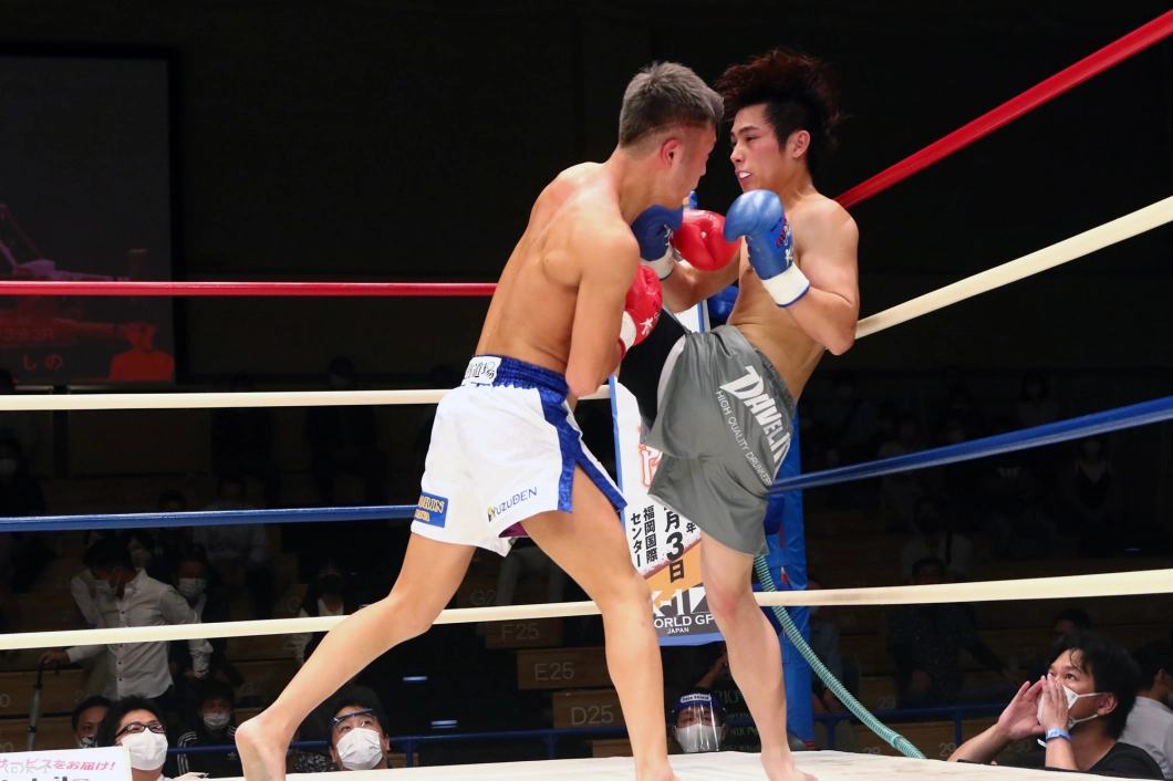 2R、しのは離れた位置から飛び込んで右ストレート・左フックを振るう。だが水津はその合間にショートの右フックを放って当て、これでしのに片膝をつかせてダウンを奪う。水津はさらに左ハイを当てるなど優勢だが、強引に攻め込むことはなく冷静にミドル・ローを入れてしのの出方を見る。