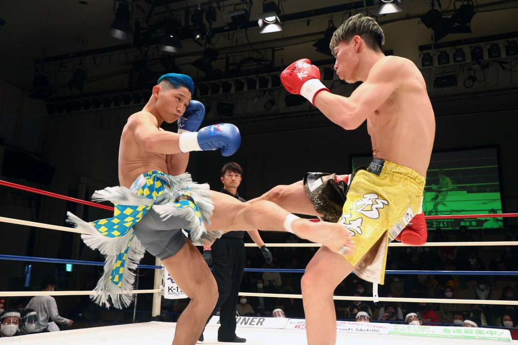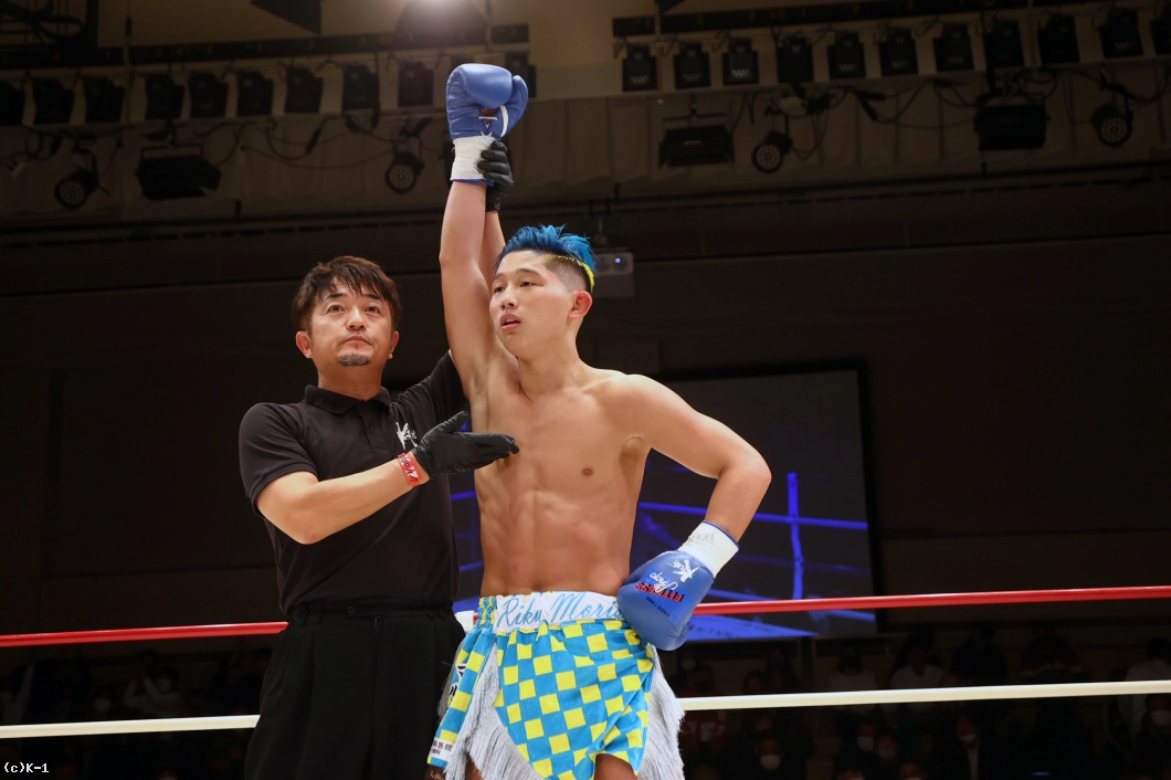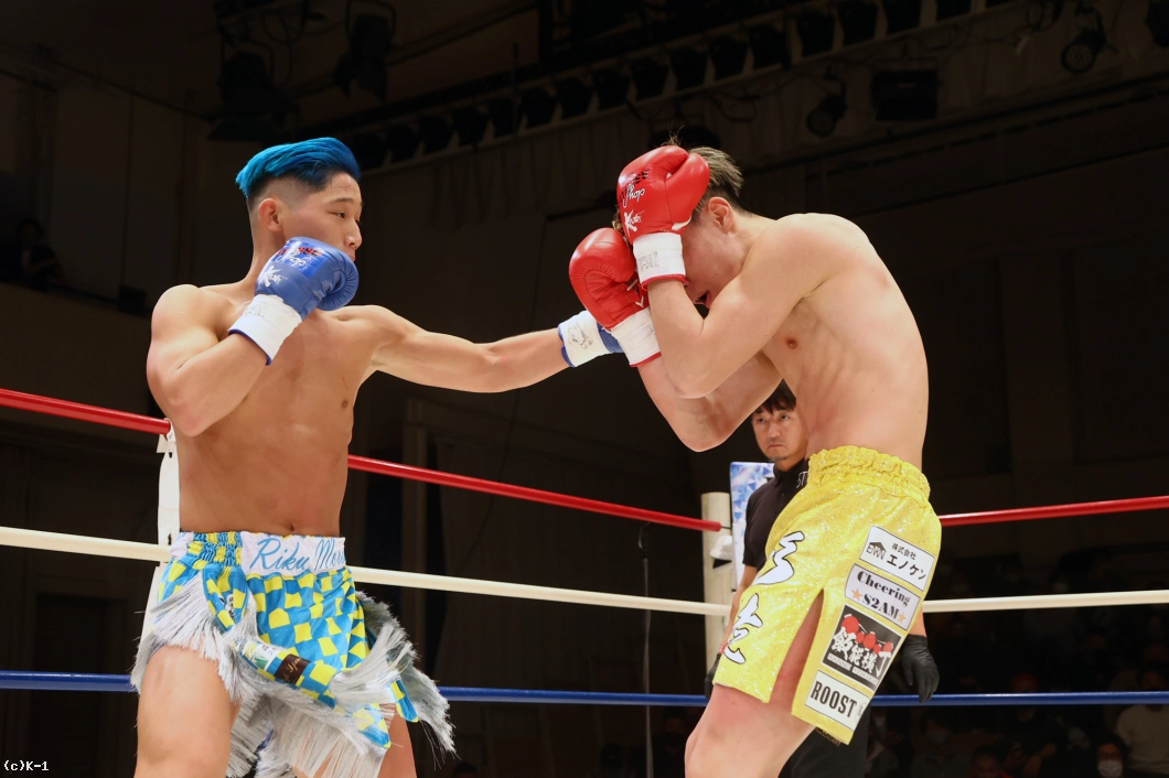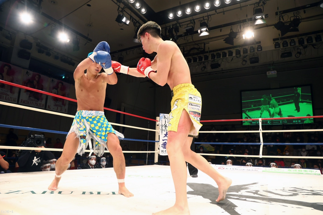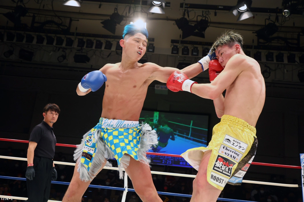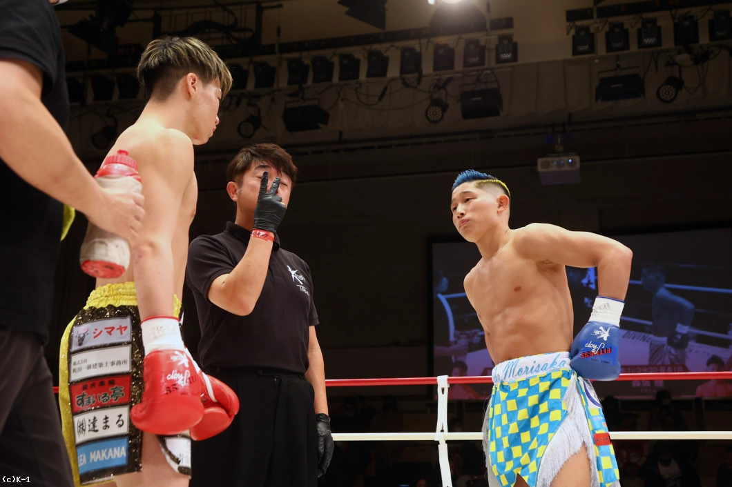 両者はスピードアップして2Rの攻防を展開。岡嶋は左右ストレートを伸ばしていくが、森坂はこれをかわしてバックブローに繋げてヒットを上げる。森坂は足を上げて蹴りと思わせての左フック、空振りからのバックブローとトリッキーな攻めを継続。左フックに岡嶋がややヨロけた直後、森坂は左フックと右ストレートをさらに打ち込んでいく。