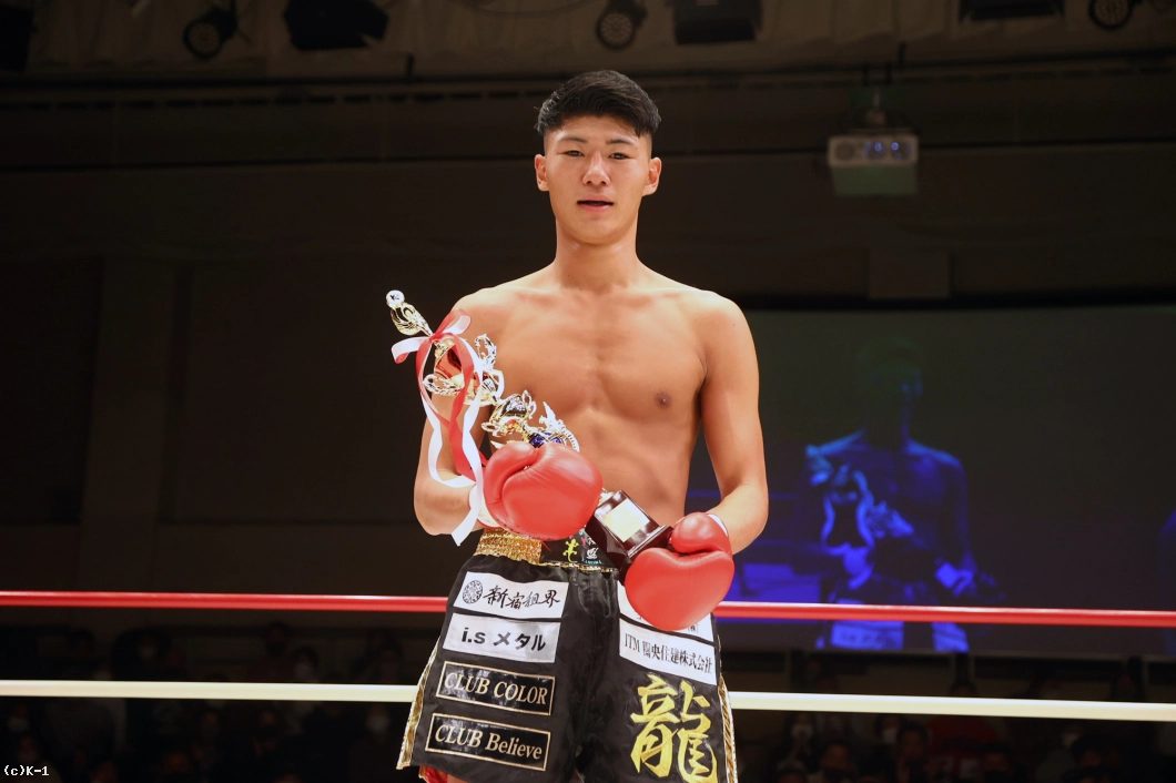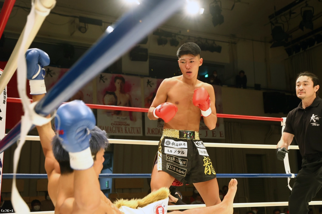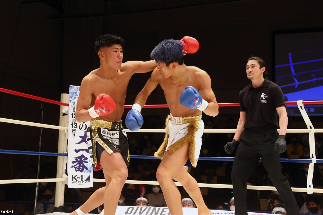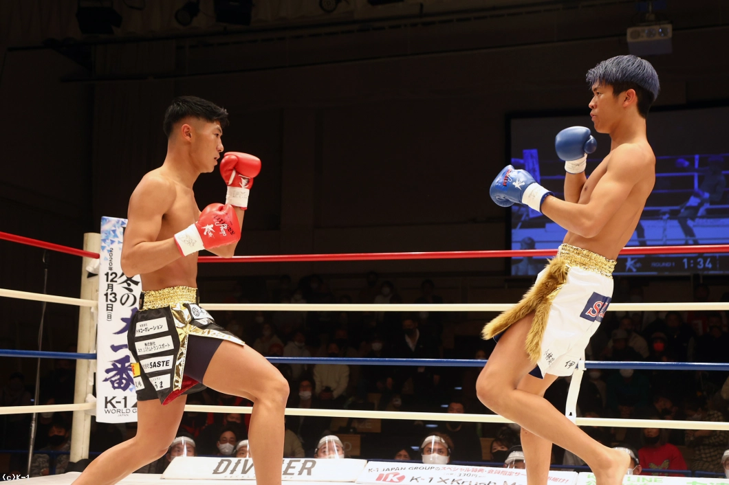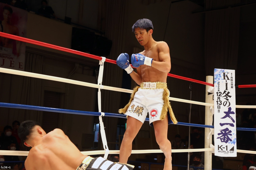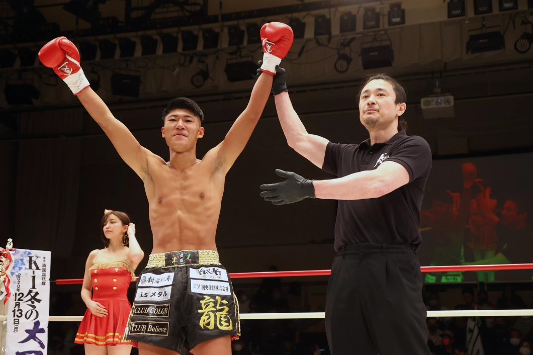 「昨日の計量を再計量でクリアして、対戦相手の志村選手とジムの代表・大沢選手、すみませんでした。久々のKOで勝ててホッとしています。自分これで6連勝、K-1甲子園も連覇したので、来年1月のK'FESTA、ぜひ声お待ちしてます」