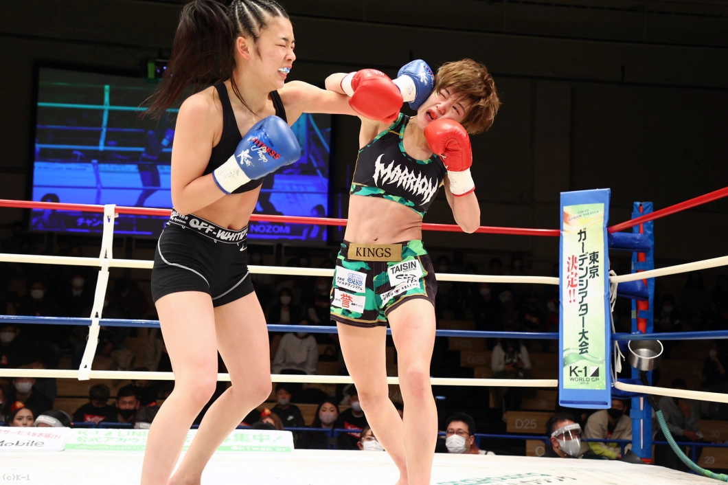2R、NOZOMIはやはり距離を取ろうとするが、チャン・リーはハイ・前蹴りをブロックさせ、NOZOMIに接近する。しかしNOZOMIの右ストレートが直撃してチャン・リーは一瞬脚が止まる。さらにNOZOMIは右フックでも追撃する。