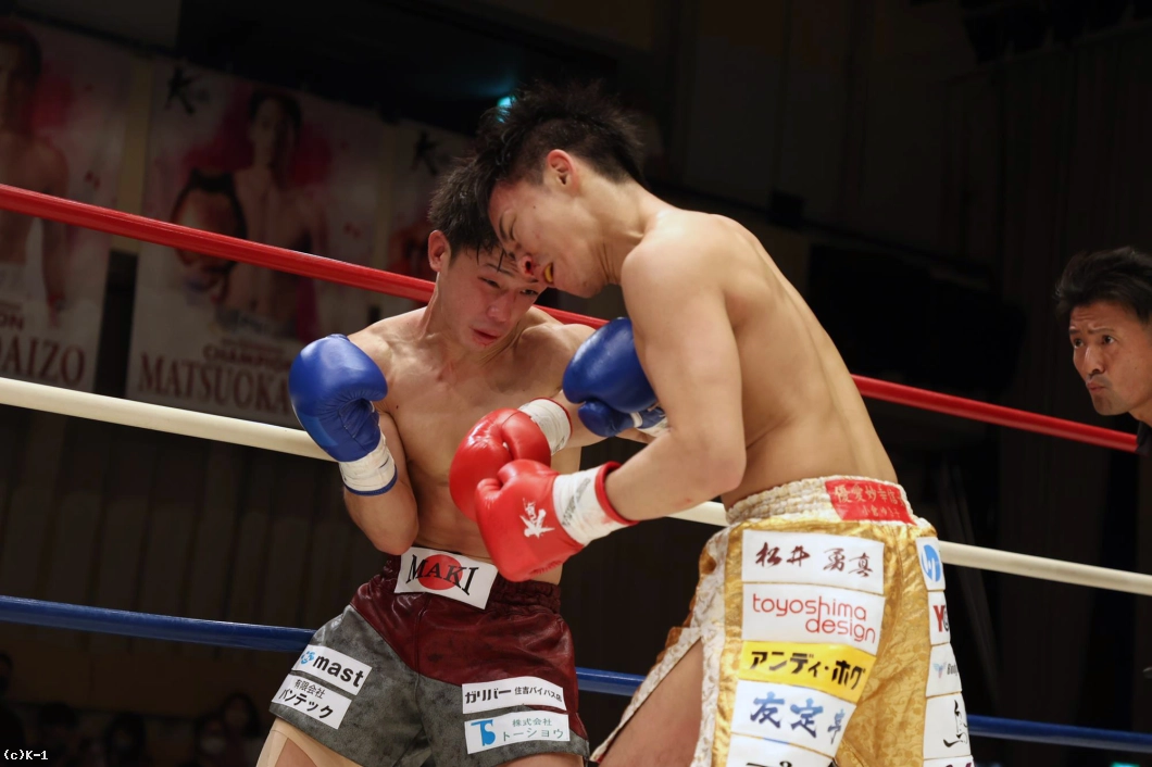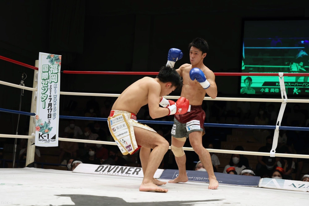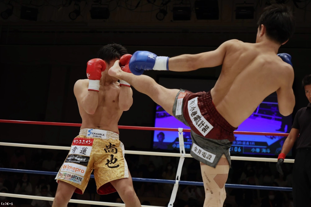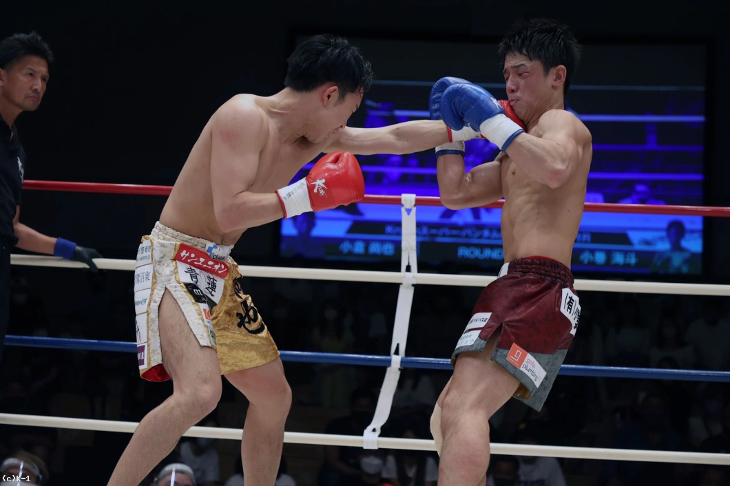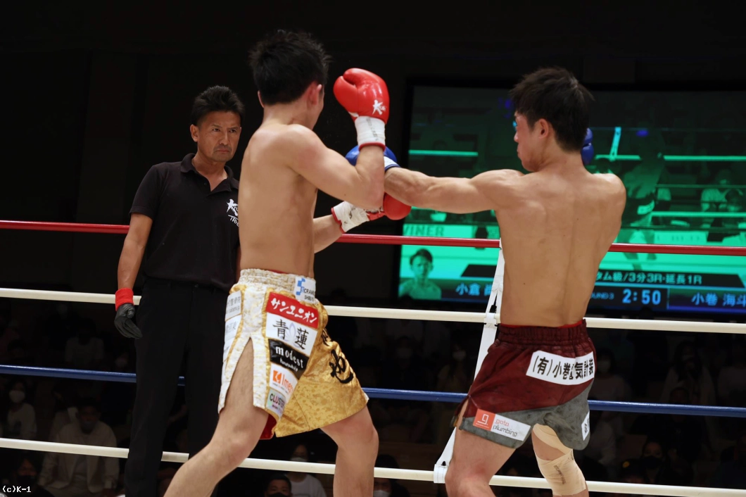 やや驚いた表情で立ち上がった小倉は、しかしそこからローを当てていくが、打ち合いになると小巻は強打を振るって小倉を後退させる。だが小倉は引かずに打ち返し、左ボディフックからの右ストレートで小巻の腰を一瞬落とす。