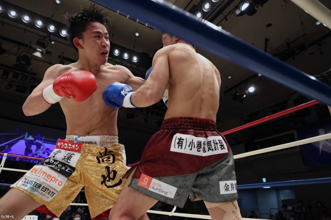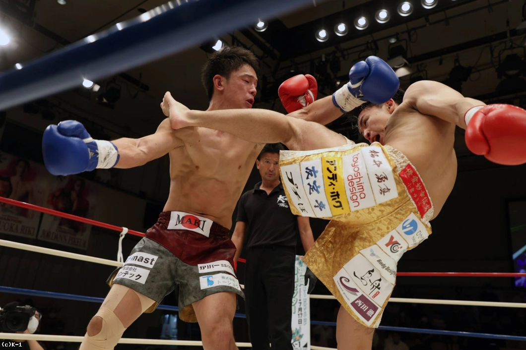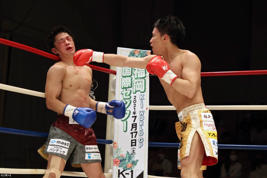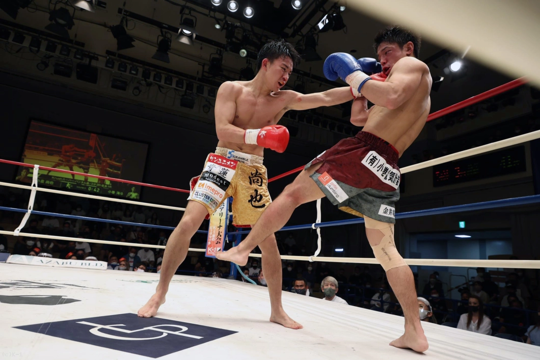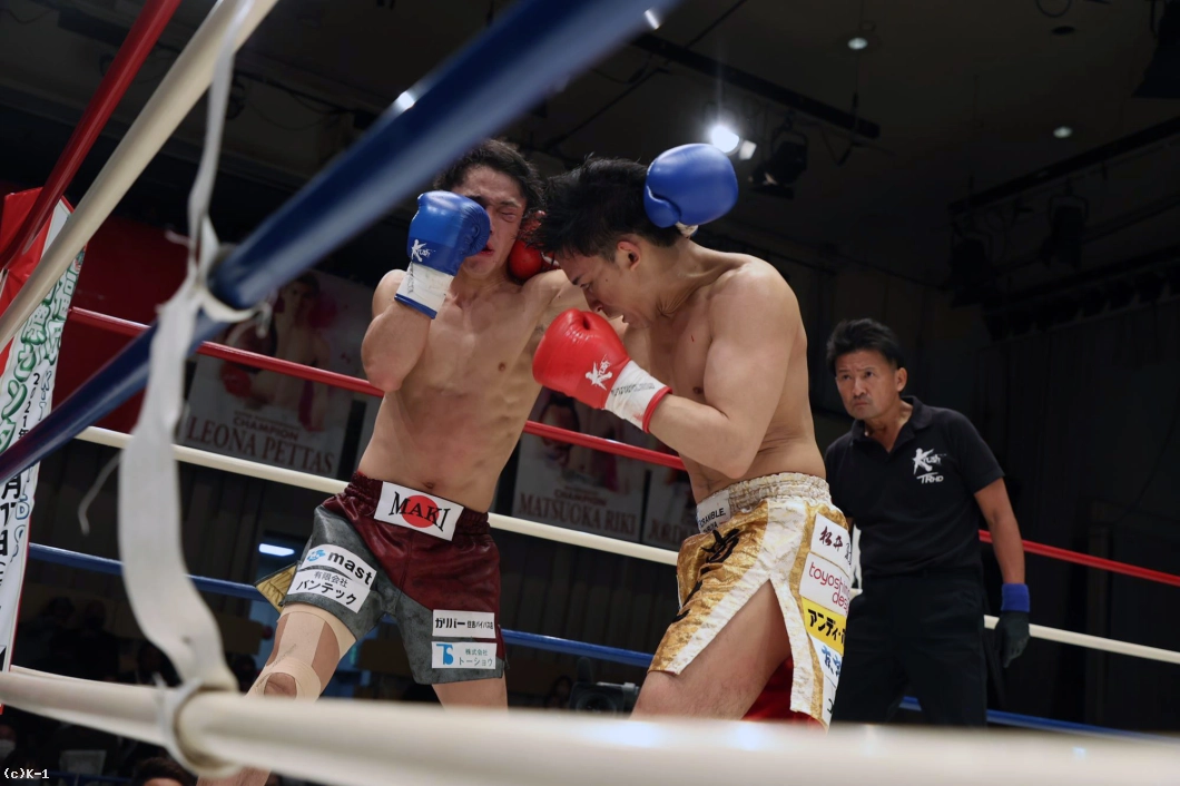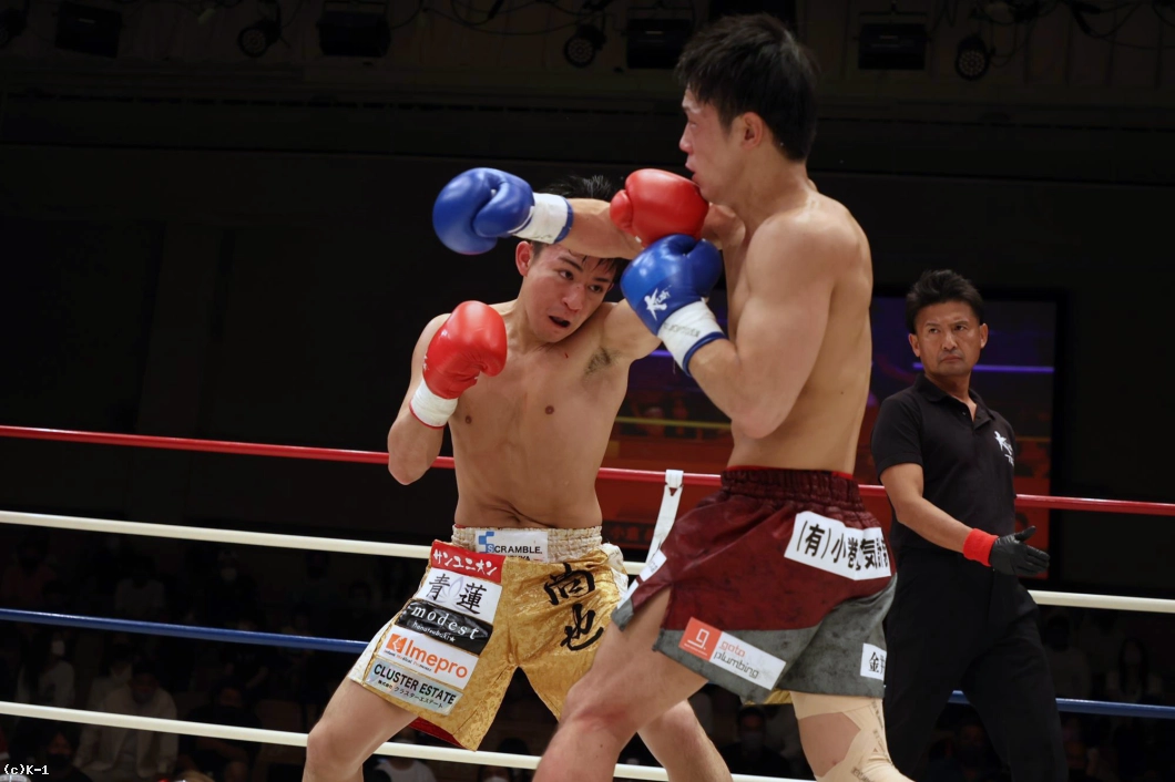 やや驚いた表情で立ち上がった小倉は、しかしそこからローを当てていくが、打ち合いになると小巻は強打を振るって小倉を後退させる。だが小倉は引かずに打ち返し、左ボディフックからの右ストレートで小巻の腰を一瞬落とす。