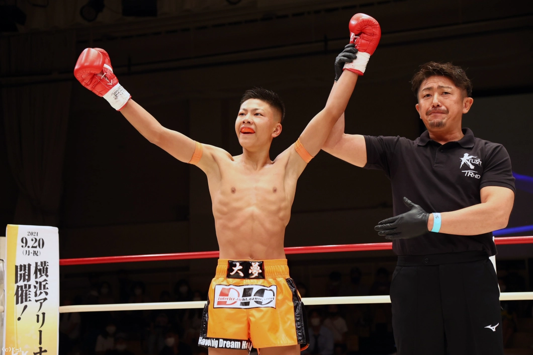 2R、右ストレートと左フックで迫る大夢に、麗斗はサウスポーからの左ストレートと右フックで応戦する。身長から来るプレッシャーを効かせていく大夢は、麗斗がコーナーを背にしたところで右ヒザで3度目のダウンを奪取。立ち上がった麗斗だが、再び膝から崩れてしまい、レフェリーが試合をストップした。