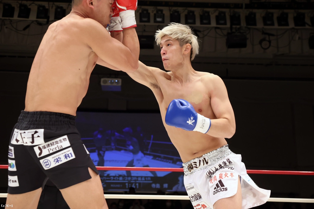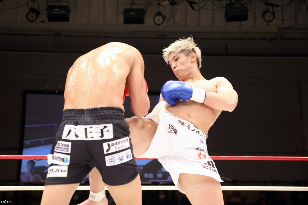 2R、プレッシャーをかける鈴木へ引き続き右の三日月蹴りを浴びせるのが寺島。強烈な左ミドルで鈴木が寺島をコーナーへ吹き飛ばす。コーナーを背負う寺島に左右フックで襲いかかる鈴木に、寺島は伸びのある右ストレートで応戦。パンチの4連打を浴びせると、すぐにフットワークで位置を変える。寺島の入り際に合わせた鈴木の左ヒザがローブローとなり一時中断。再開後フットワークからの前蹴りを見せる寺島。右飛びヒザ蹴りでぐらついた鈴木にパンチをまとめ左アッパーでダウンを奪取する。