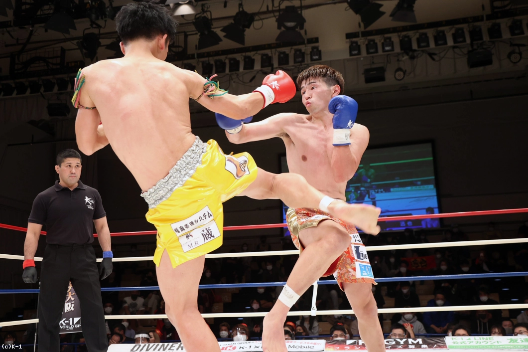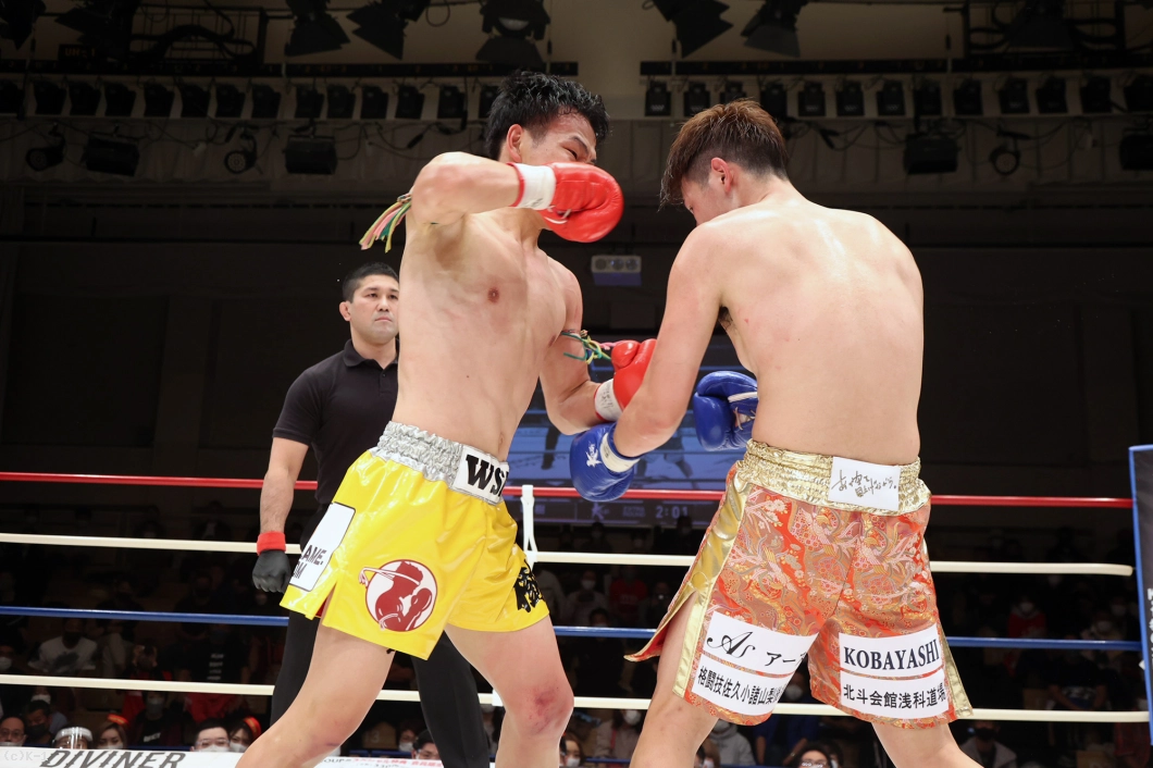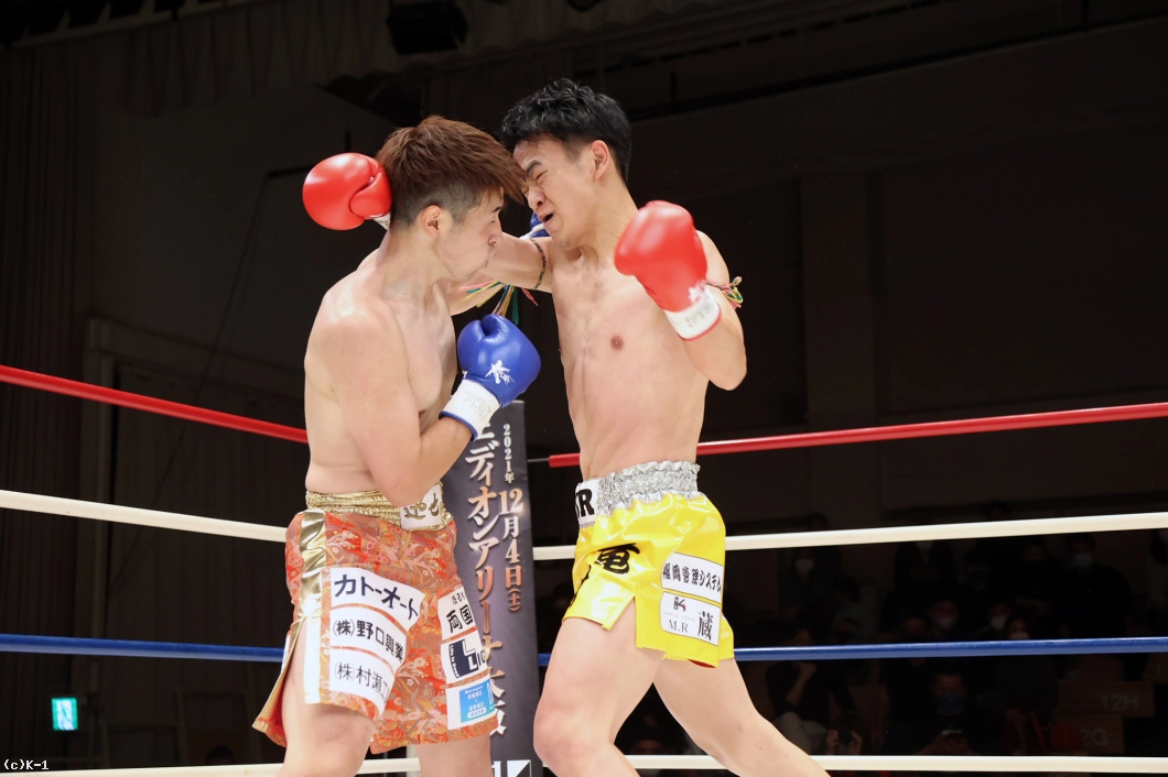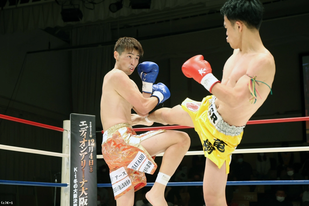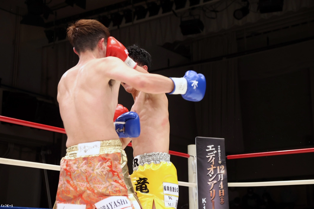 2R、竜樹が重い右ミドルでプレッシャー。迅也が左ローを返すと、竜樹の足がやや流れる。竜樹の入り際に迅也は右バックハンドブロー。右ジャブから左のオーバーハンドフック、スイッチして右バックスピンキックと迅也が変則的な攻撃でプレッシャーをかける。竜樹はガードを高く固め右ミドル。左のミドルも見せる竜樹へ、迅也は懐に呼び込んで強い右フックをガードの上に叩き込む。