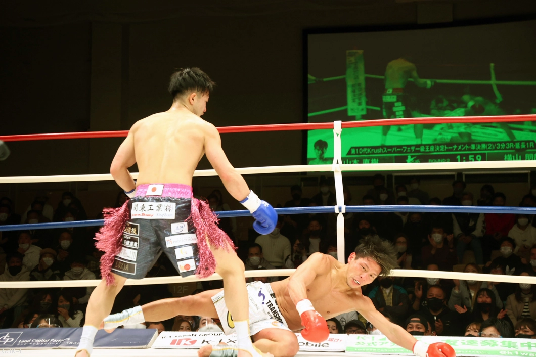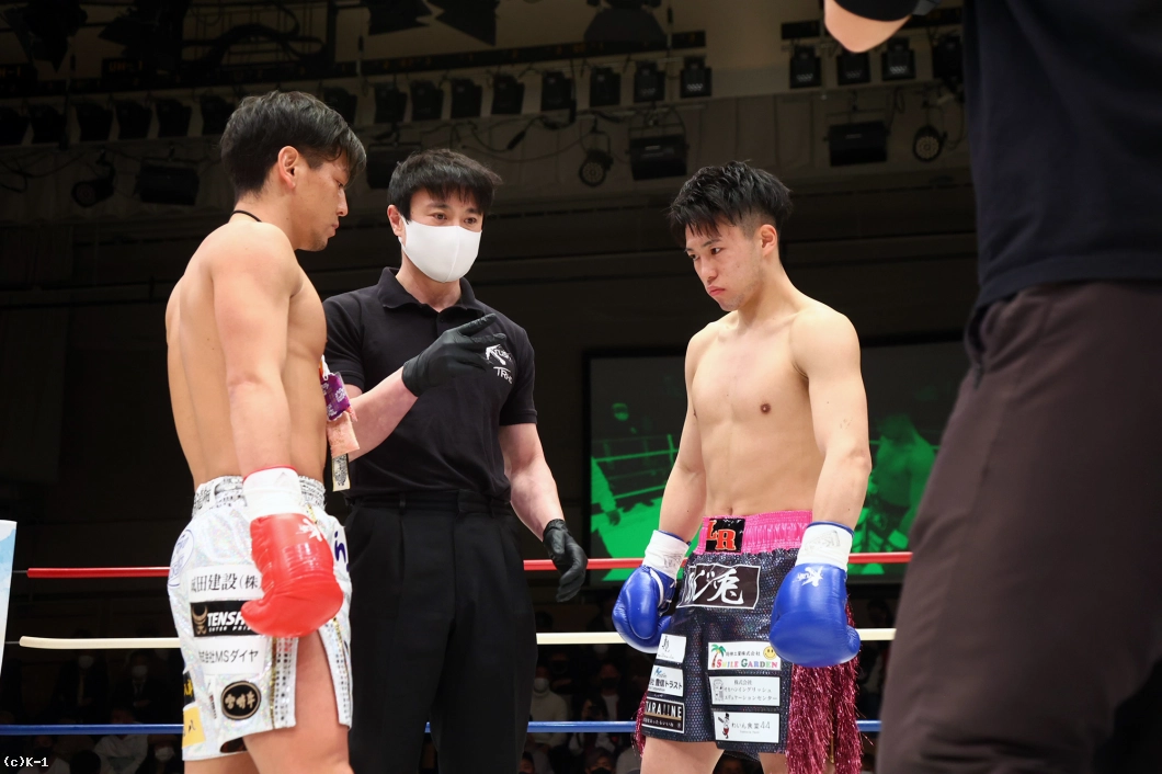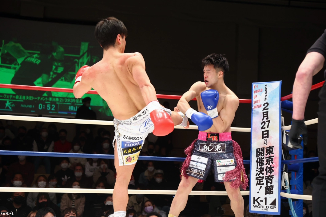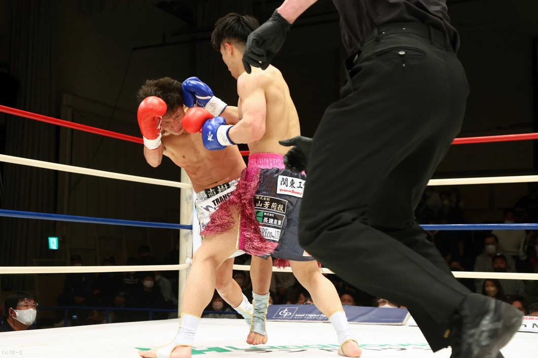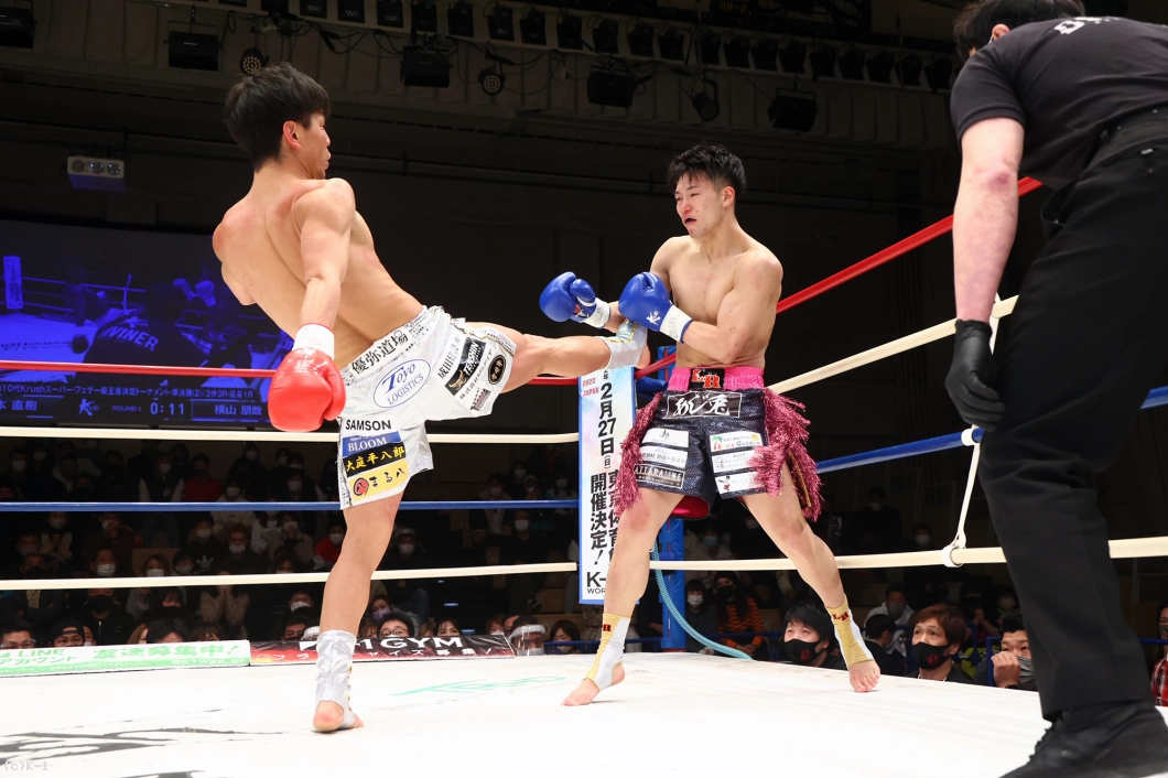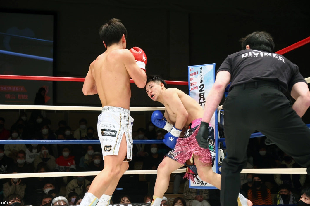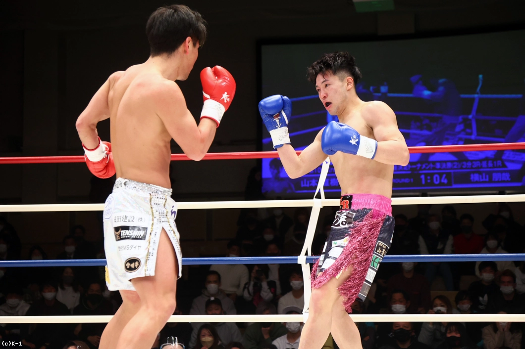 1R、横山はサウスポーから左ストレート、左フックと軌道を変えて打ち分ける。山本は手を高くしたブロックでこの強打を防ぎながら、右の三日月蹴りを効かせて横山のガードを落とす。さらに山本は横山を追ってボディブローを連打し、横山の飛びヒザにカウンターのフックを合わせてダウンを奪う。再開後、後のない横山はロープを背にリングを回り、このラウンドをしのぎ切る。