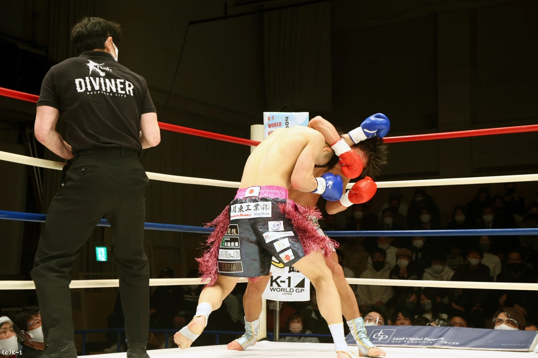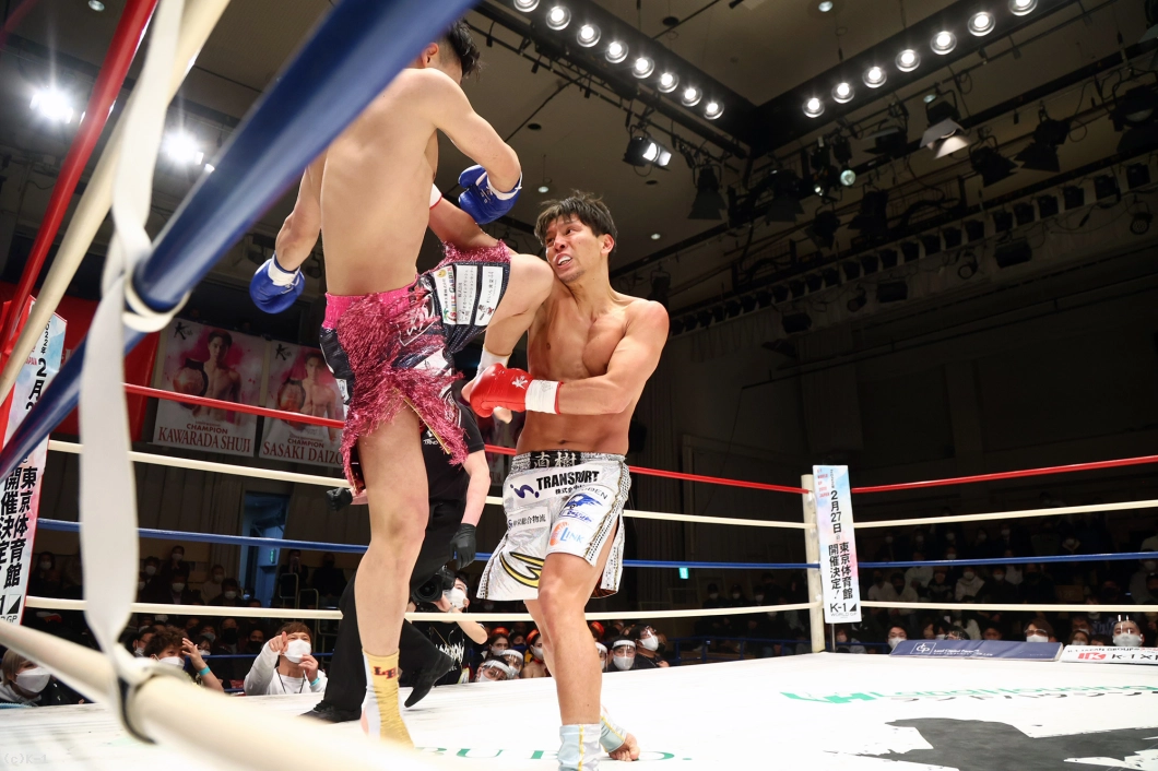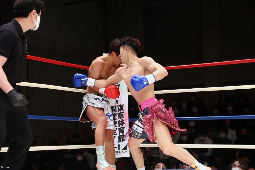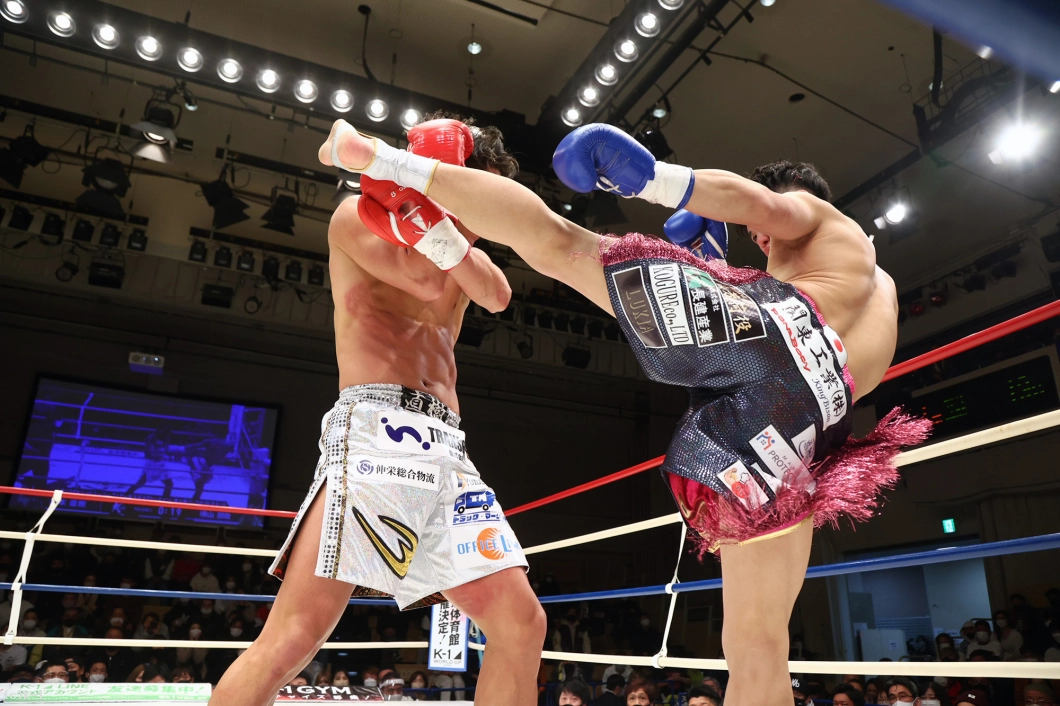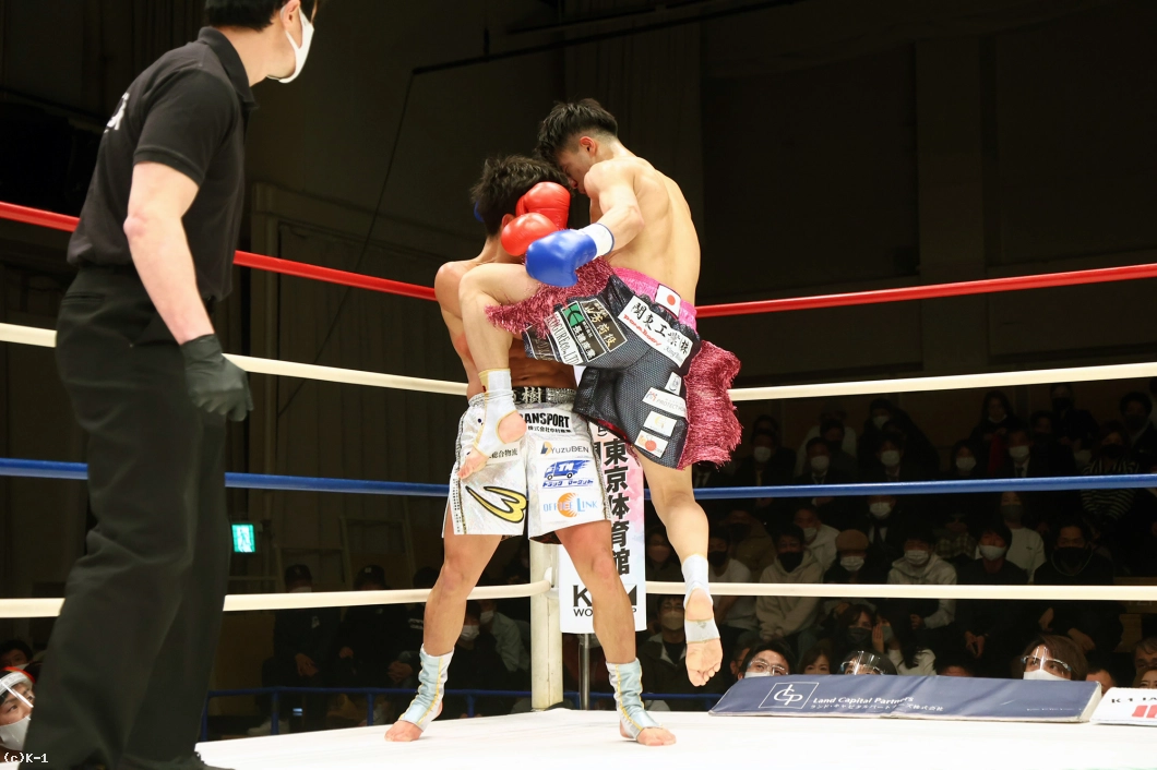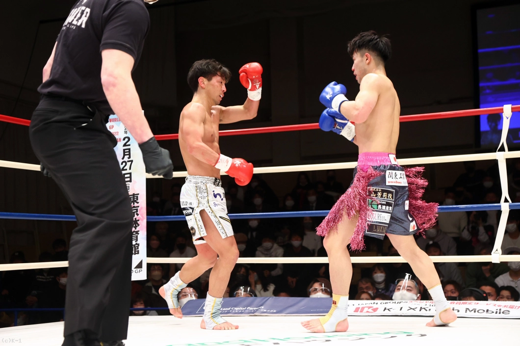 1R、横山はサウスポーから左ストレート、左フックと軌道を変えて打ち分ける。山本は手を高くしたブロックでこの強打を防ぎながら、右の三日月蹴りを効かせて横山のガードを落とす。さらに山本は横山を追ってボディブローを連打し、横山の飛びヒザにカウンターのフックを合わせてダウンを奪う。再開後、後のない横山はロープを背にリングを回り、このラウンドをしのぎ切る。