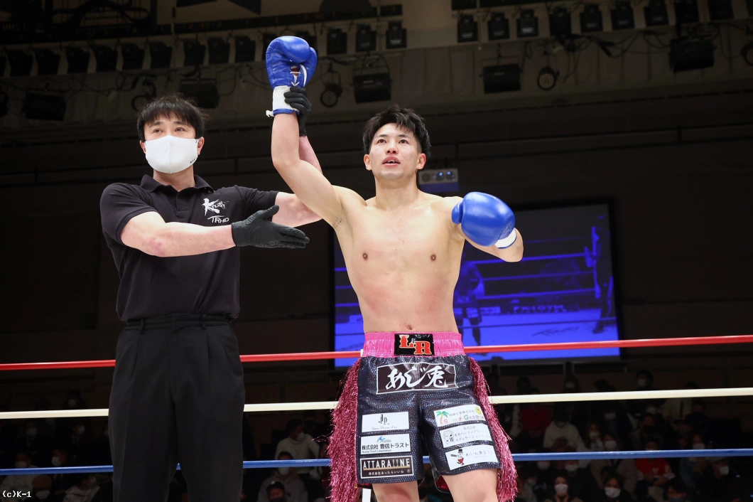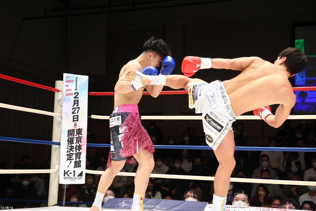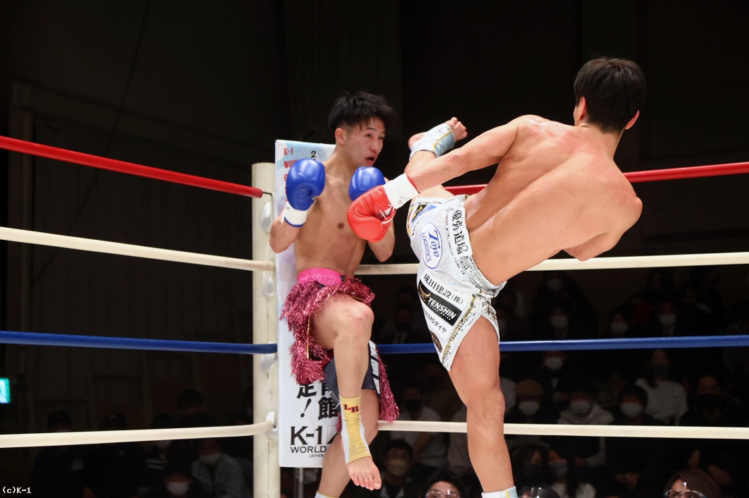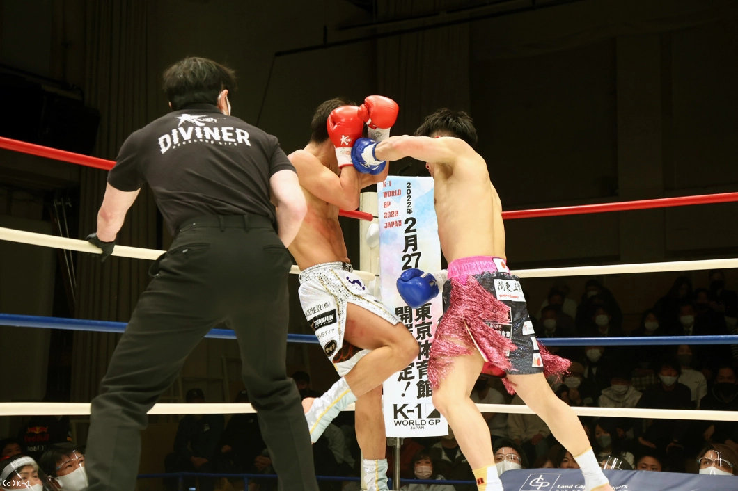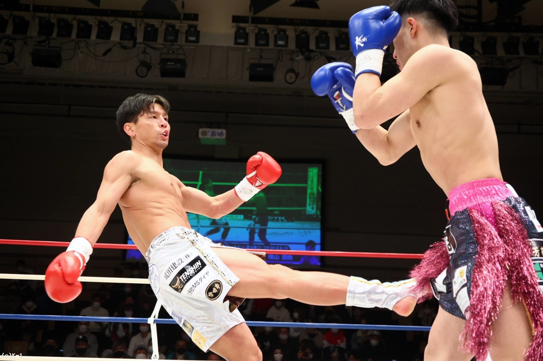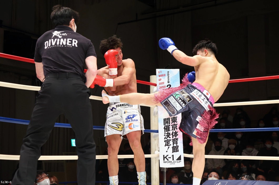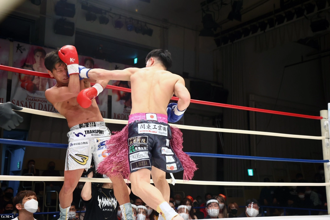 1R、横山はサウスポーから左ストレート、左フックと軌道を変えて打ち分ける。山本は手を高くしたブロックでこの強打を防ぎながら、右の三日月蹴りを効かせて横山のガードを落とす。さらに山本は横山を追ってボディブローを連打し、横山の飛びヒザにカウンターのフックを合わせてダウンを奪う。再開後、後のない横山はロープを背にリングを回り、このラウンドをしのぎ切る。