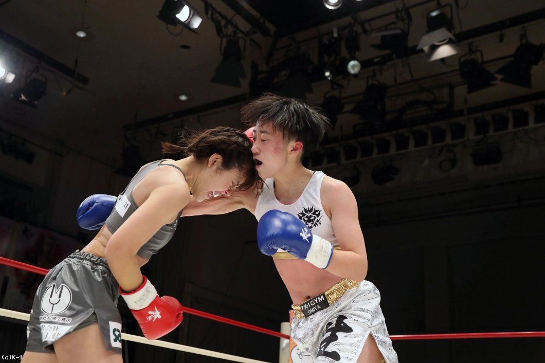 2R、前蹴り&ローで前に出んとする吉崎だが、加藤はこれに左ストレートと左ミドルを飛ばして食い止める。しかし吉崎は弱気にならず、右のパンチをストレート・フックと打ち分け加藤を後退させる。加藤が左ストレート・左ミドルと返しても吉崎が右の強打で押していく。
