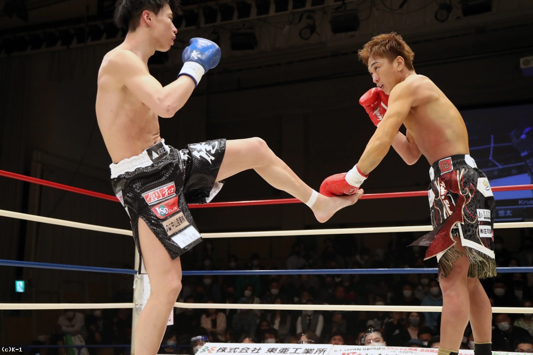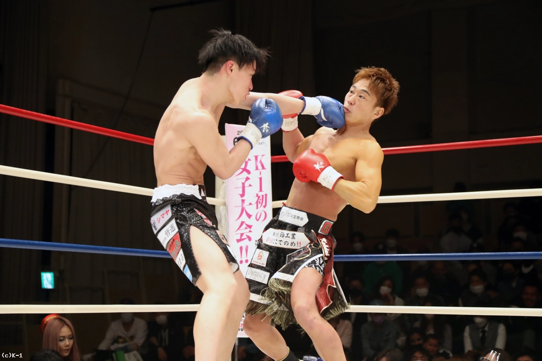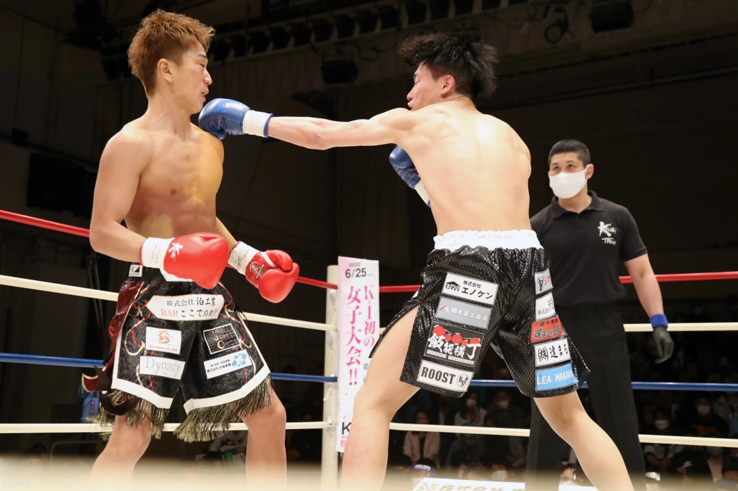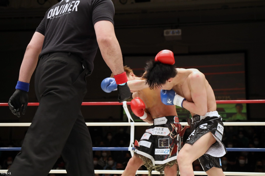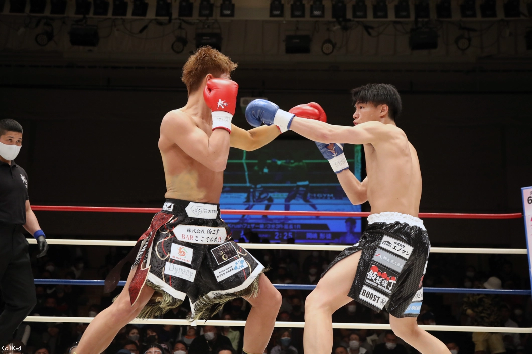 2R、國枝もカーフキックを出し岡嶋を嫌がらせるが、岡嶋がカーフキックを再度見せて國枝にダメージを与える。國枝はカーフが気になるか、踏み込みが減る。岡嶋は顔へのストレート、國枝はボディブローで応戦する。