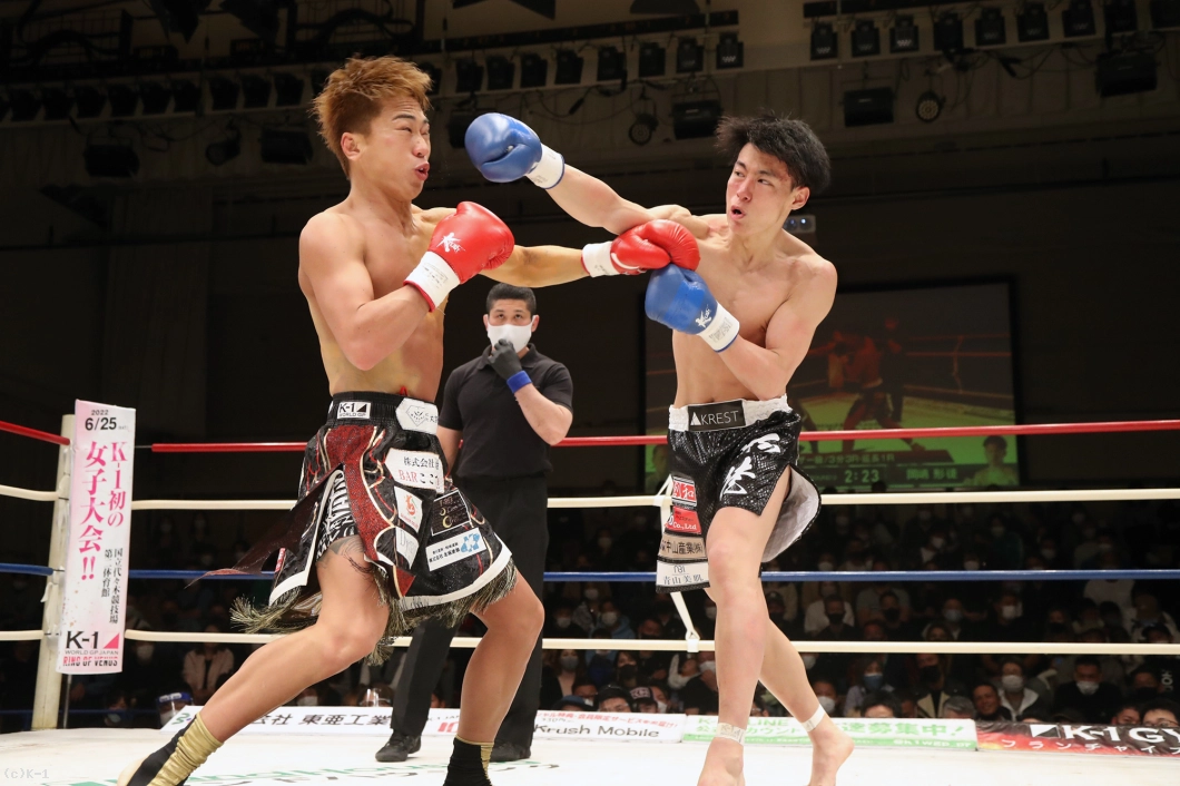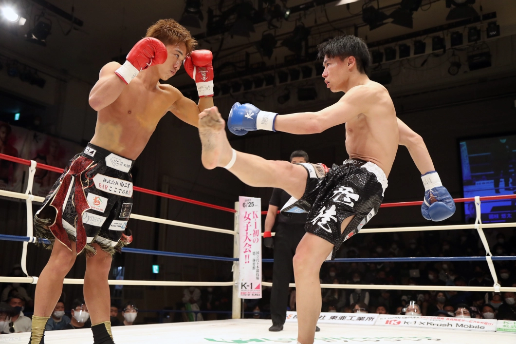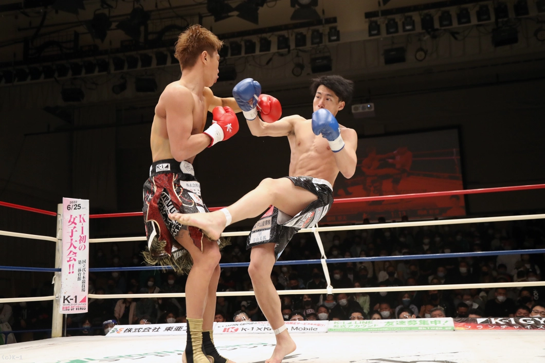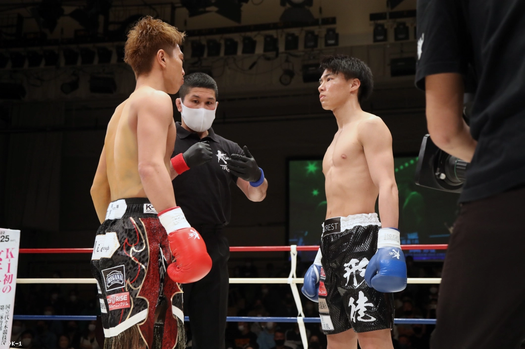 1R、両者間合いを遠く取ってローを放つも互いに空振り。そこから國枝は右ボディストレートからの左フックをヒットする。岡嶋はしかしジャブからの右カーフキック(膝から下・ふくらはぎを蹴るローキック)で國枝の体を流す。