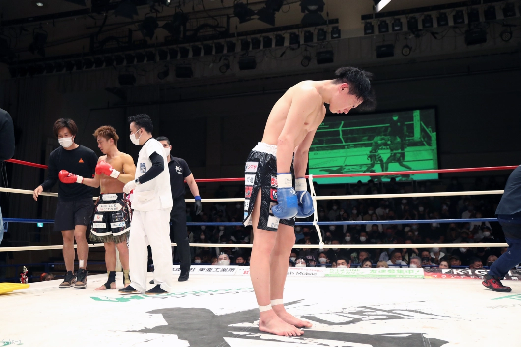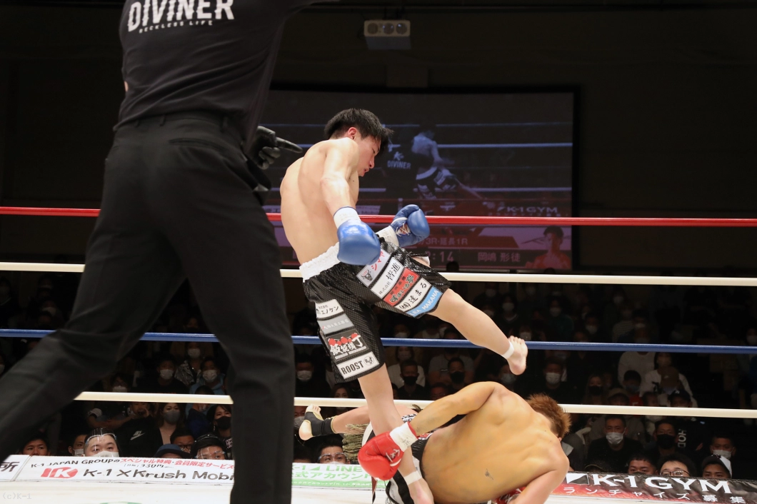 3R、岡嶋はローを蹴って、國枝が前に出てくると右ストレートをカウンターで当てダウンを奪取。続いて岡嶋はステップインしての右ストレートを当て國枝がダウン・転倒するが、ここで岡嶋が放った蹴りが倒れた國枝の後頭部に当たってしまい、國枝のダメージをドクターがチェックする。國枝はこの蹴りのダメージで続行不可能となり試合は終了。