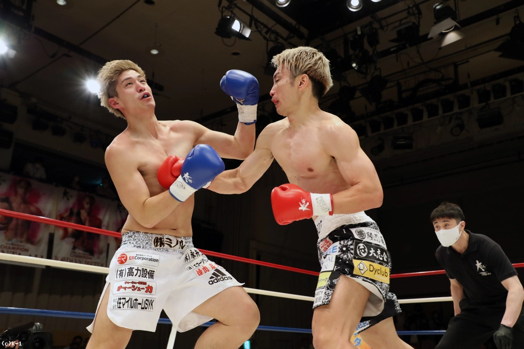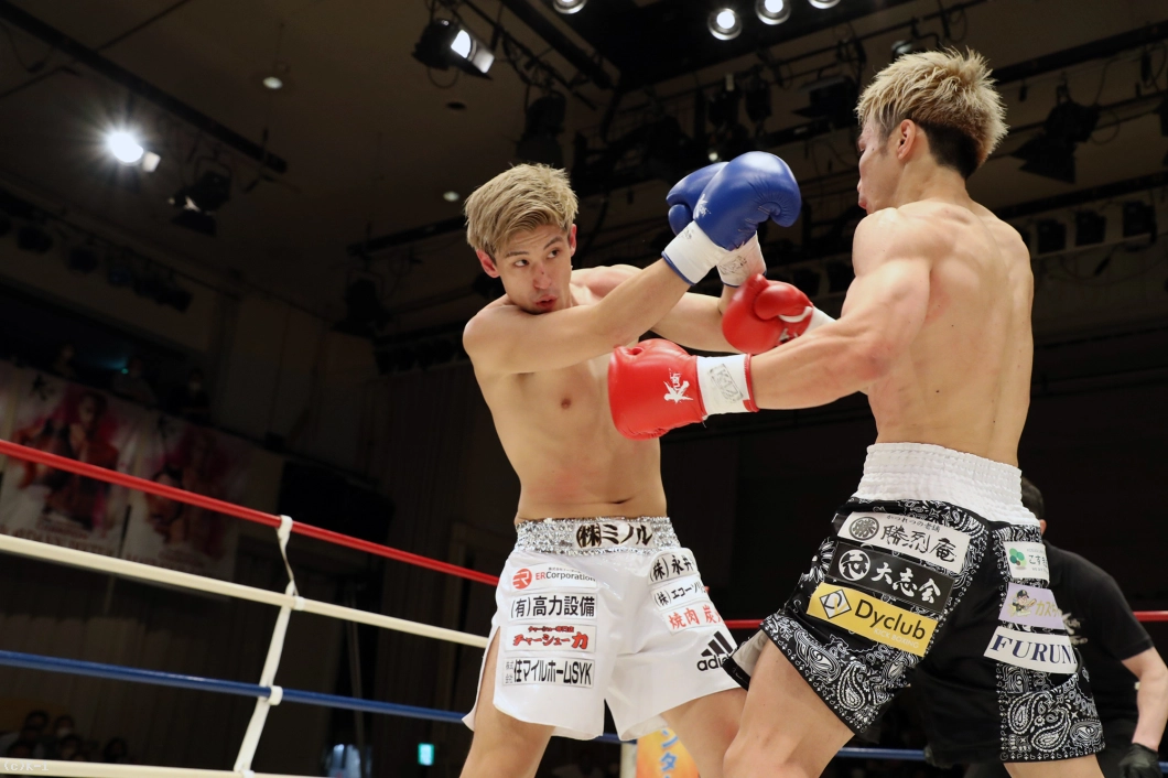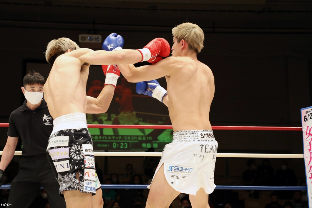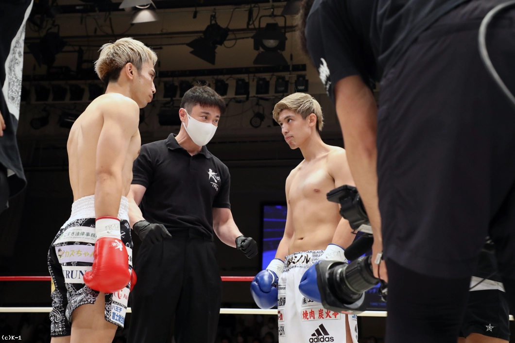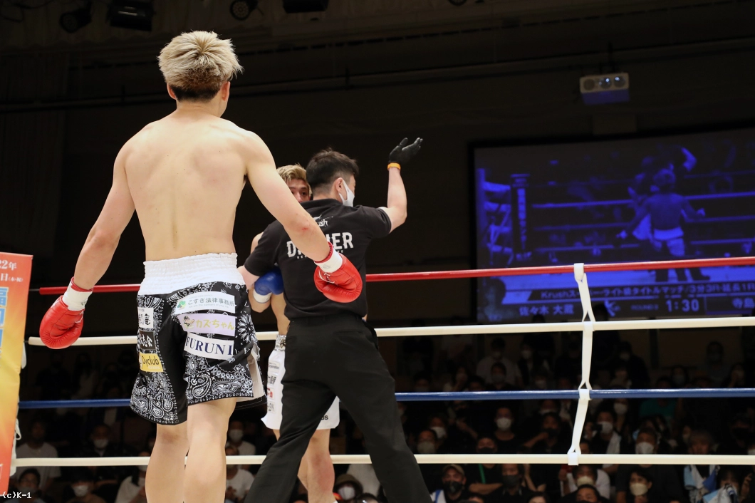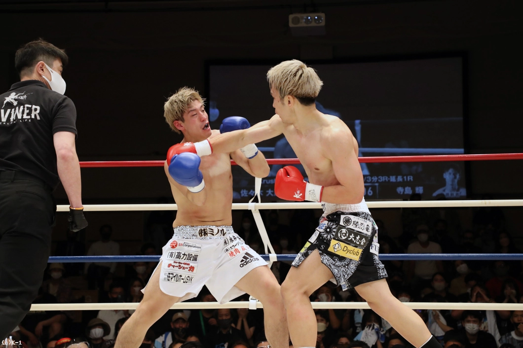 2R、佐々木はやはりプレッシャーを発していくが、寺島がステップインしての右ストレート、ワンツーからの左ジャブを当てる。寺島はその後も速いステップインからの左フック、左ボディフックとパンチのヒットを増やしていく。佐々木が挽回に来ようとすると三日月蹴りを連発してストップする。