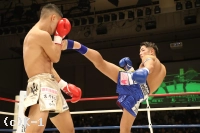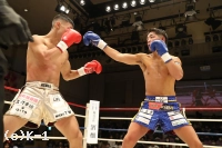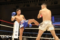 1R、サウスポーの弘輝が左インローで先制。その後も左ミドル、前蹴りと放つが、伊藤も右ミドルを返す。弘輝は蹴りのように見せかけ左フックをヒット。右の蹴りをミドル・ローと当てる伊藤だが、弘輝はそれに止められずに前へ出てプレッシャーを掛ける。