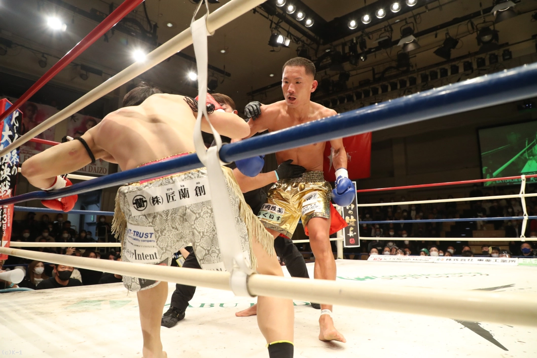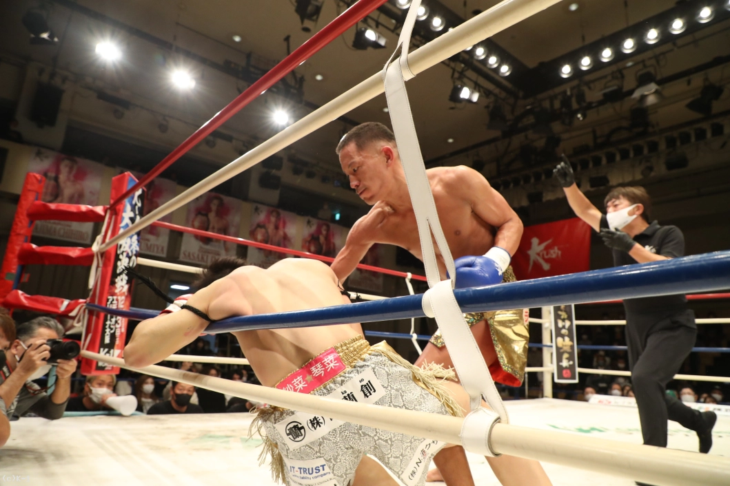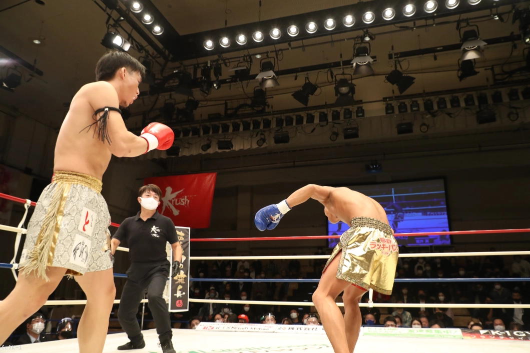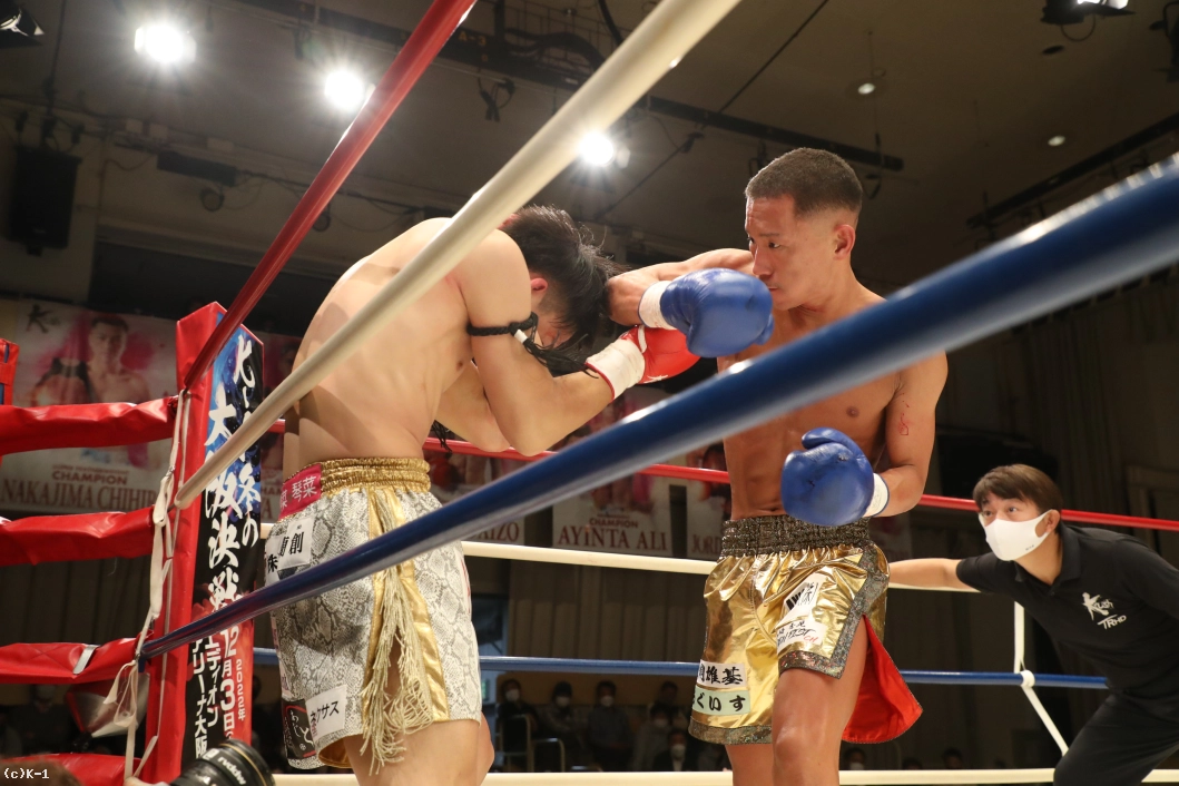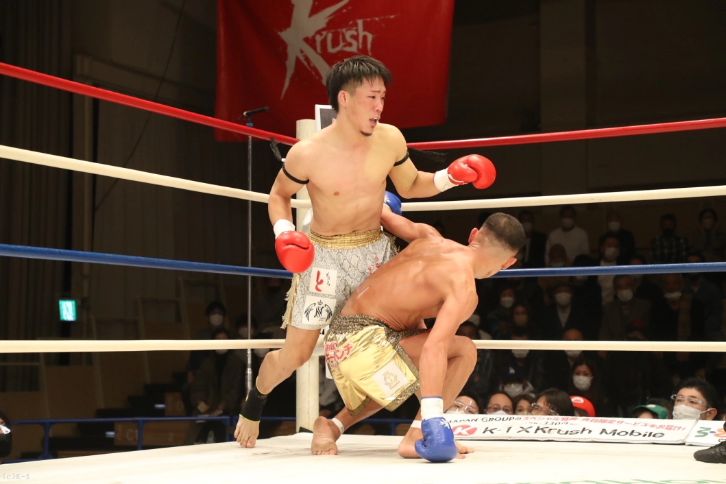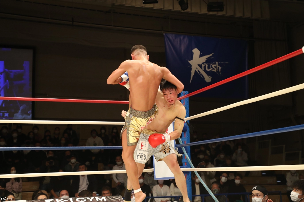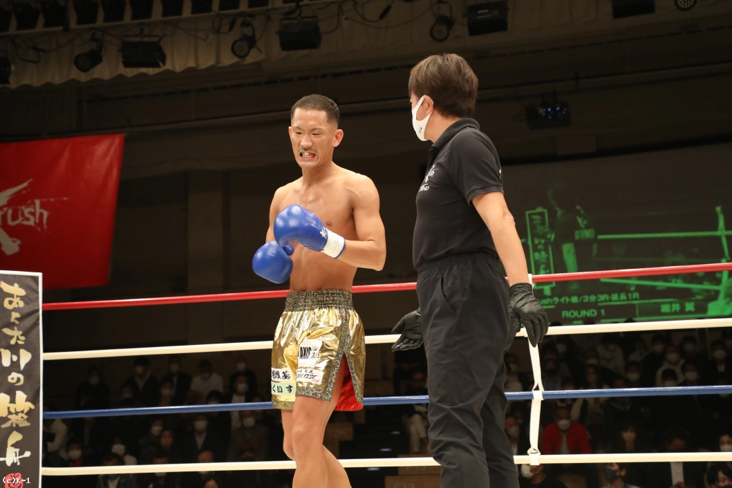 しかし堀井はダメージ少なく猛然と反撃し、飛びヒザから連打を見舞い、右アッパーを決めダウンを奪い返す。