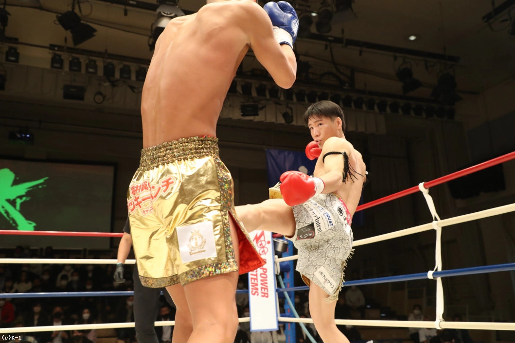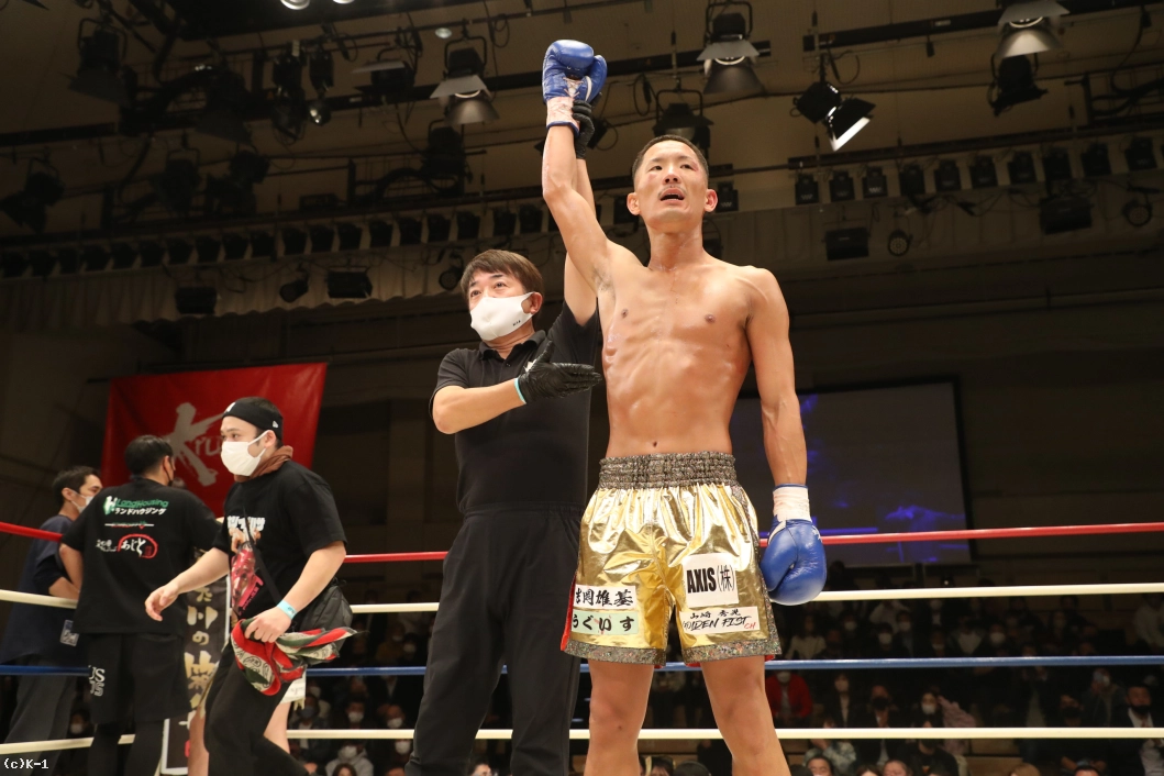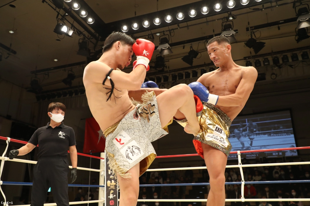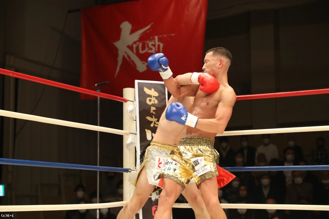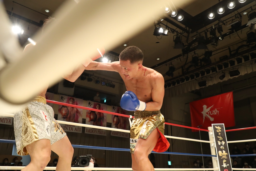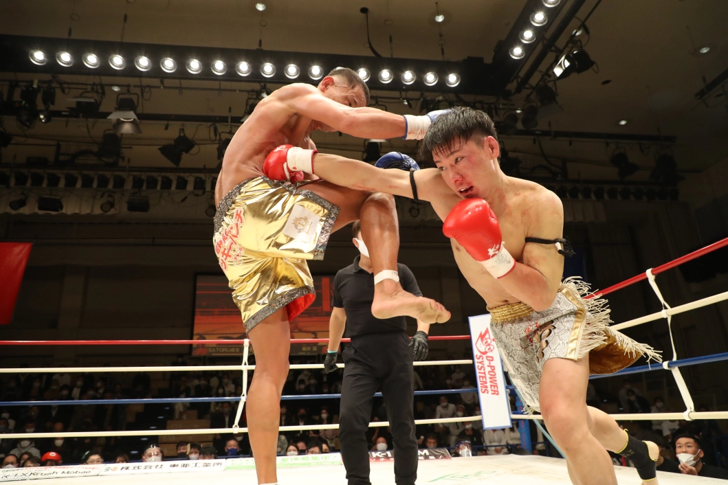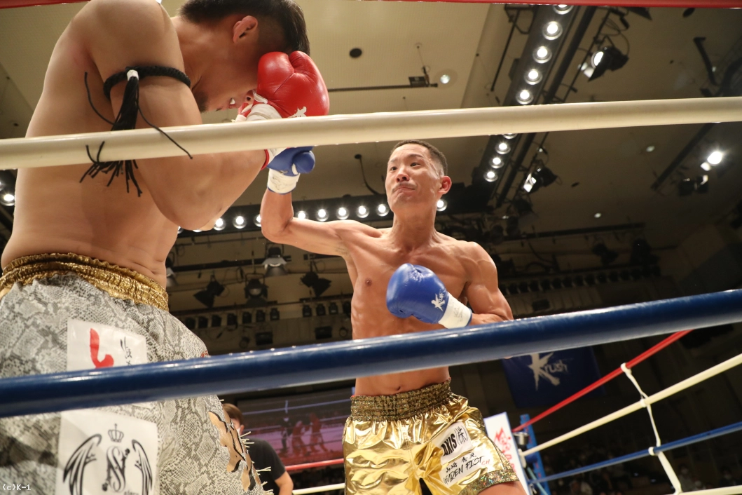 しかし堀井はダメージ少なく猛然と反撃し、飛びヒザから連打を見舞い、右アッパーを決めダウンを奪い返す。
