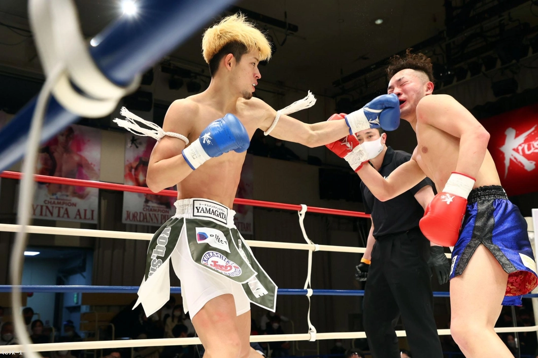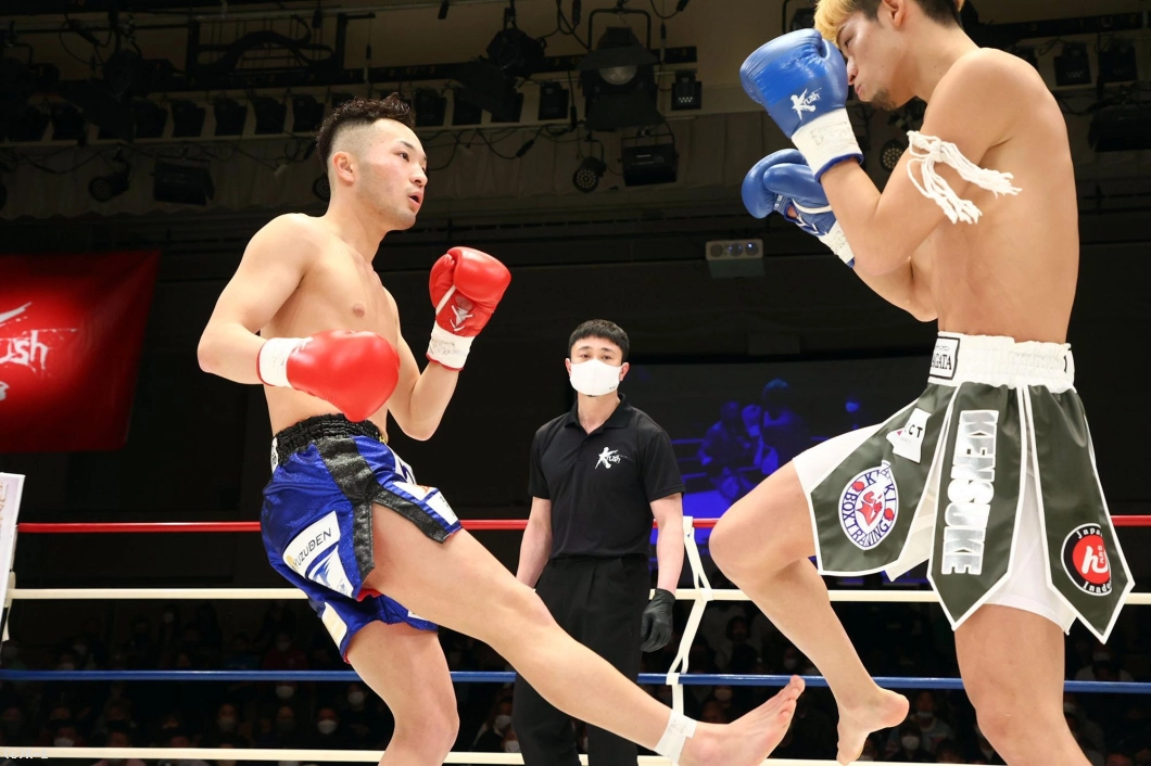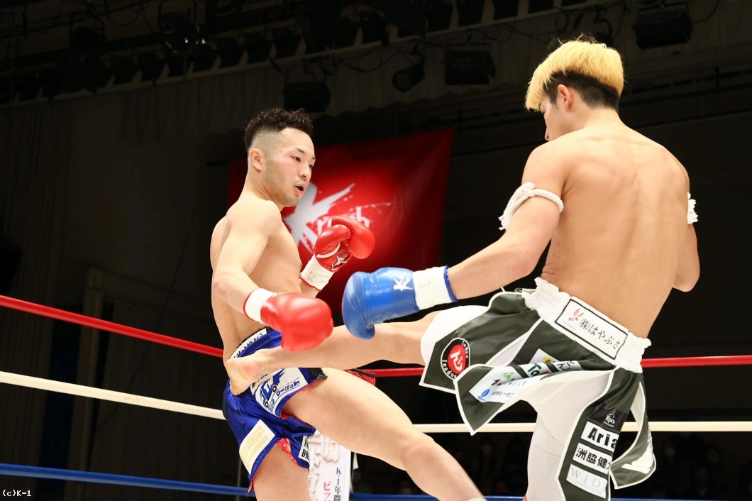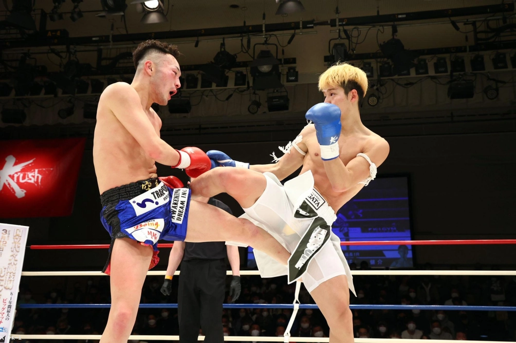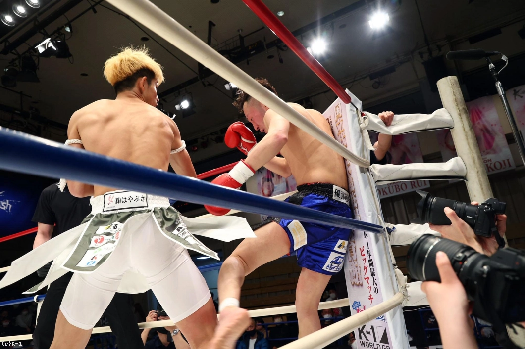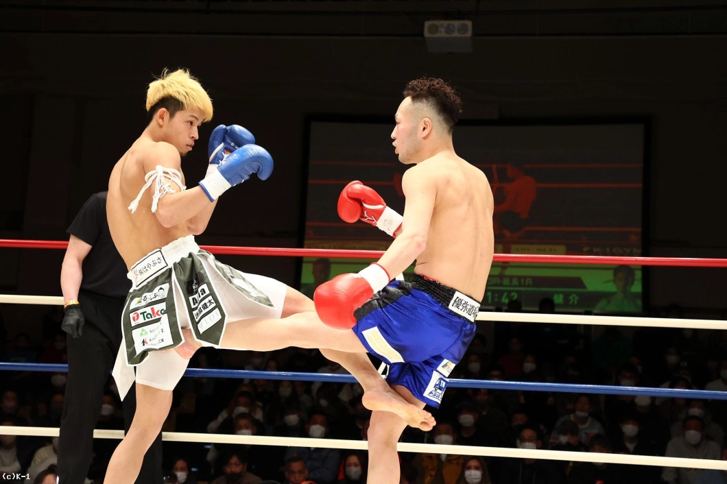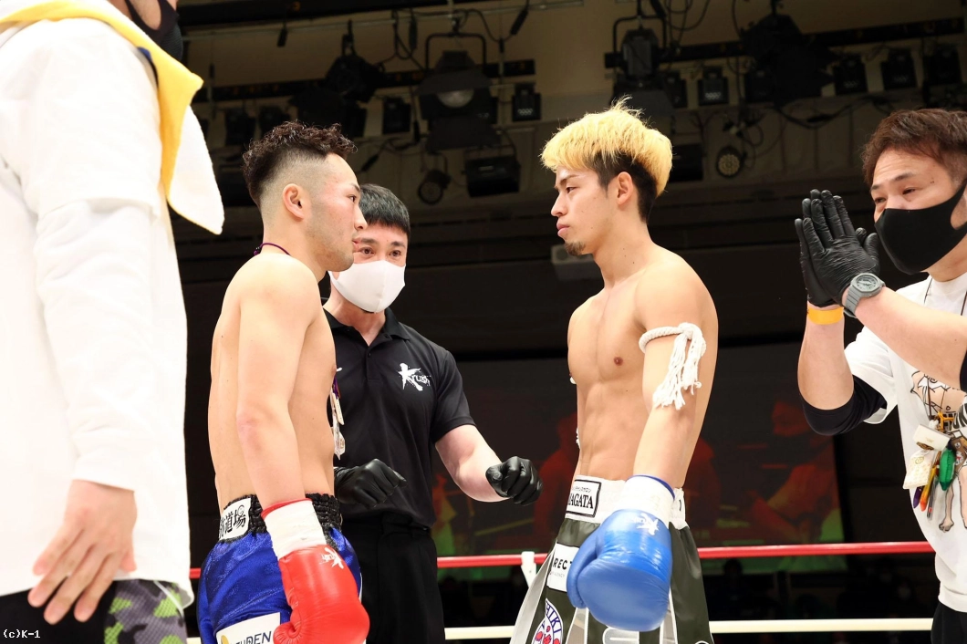 再開。健介は前蹴りで水津を止め、そこから左ストレート、ボディへのヒザとやはり攻勢。水津はダメージと疲労で組みが多くなり注意を受ける。