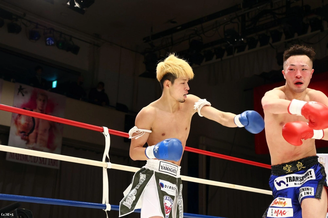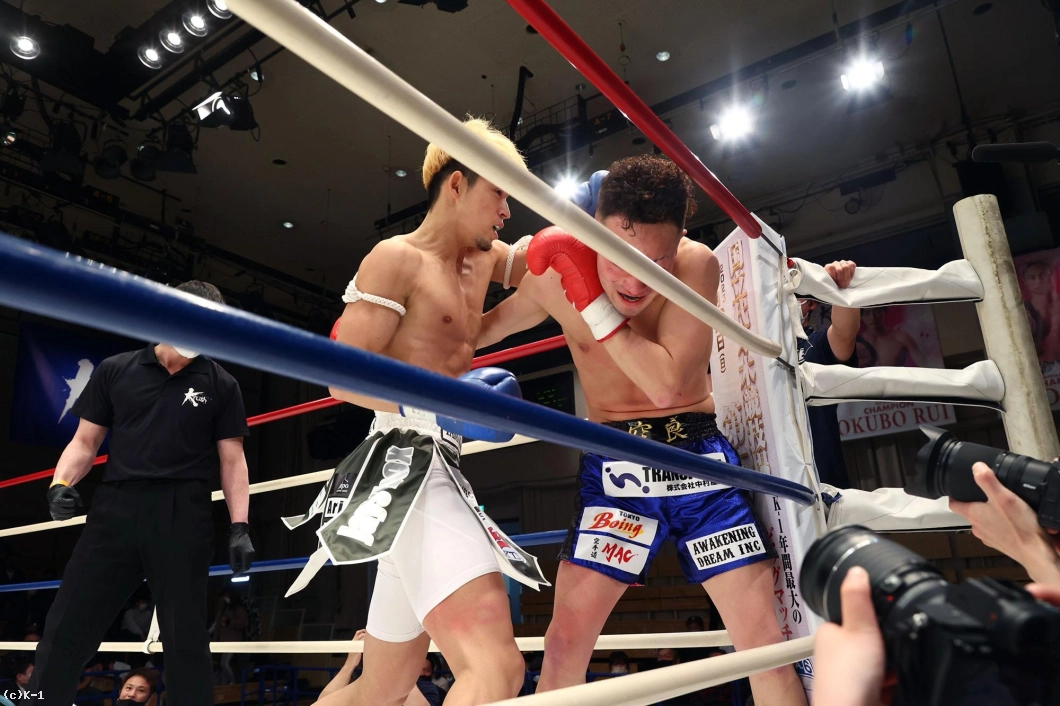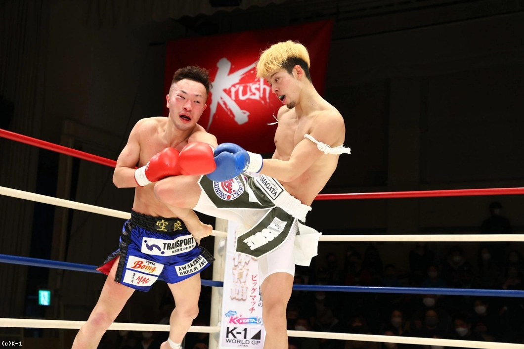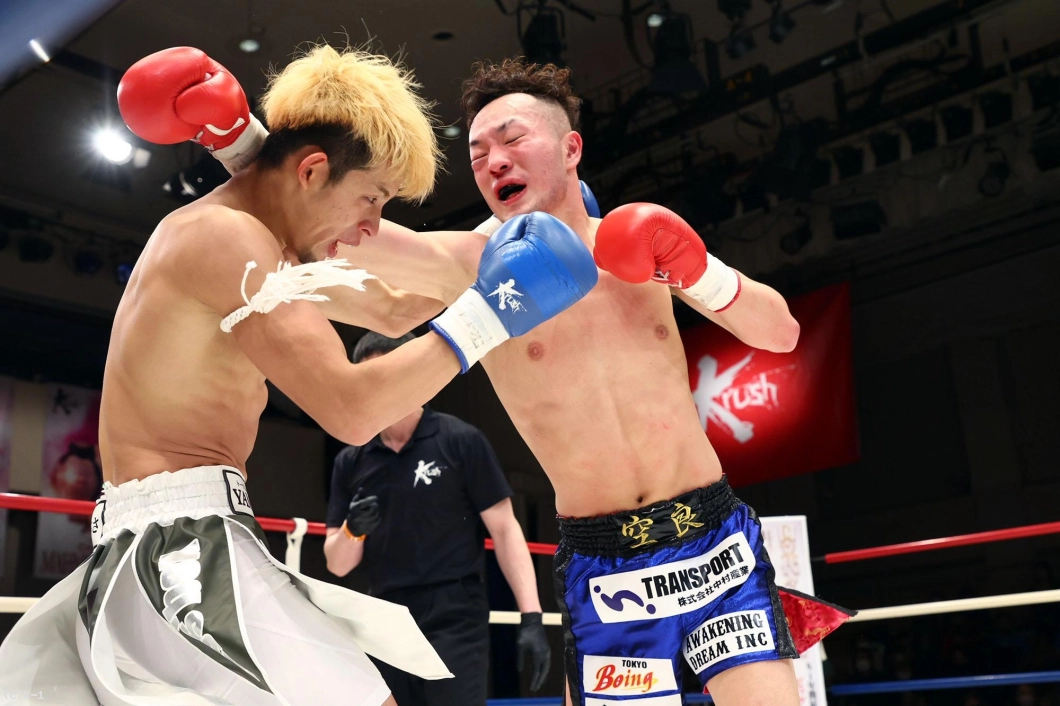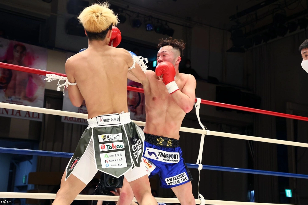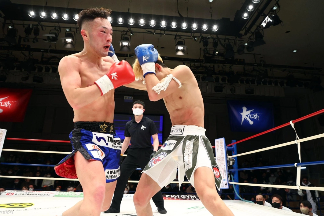 再開。健介は前蹴りで水津を止め、そこから左ストレート、ボディへのヒザとやはり攻勢。水津はダメージと疲労で組みが多くなり注意を受ける。